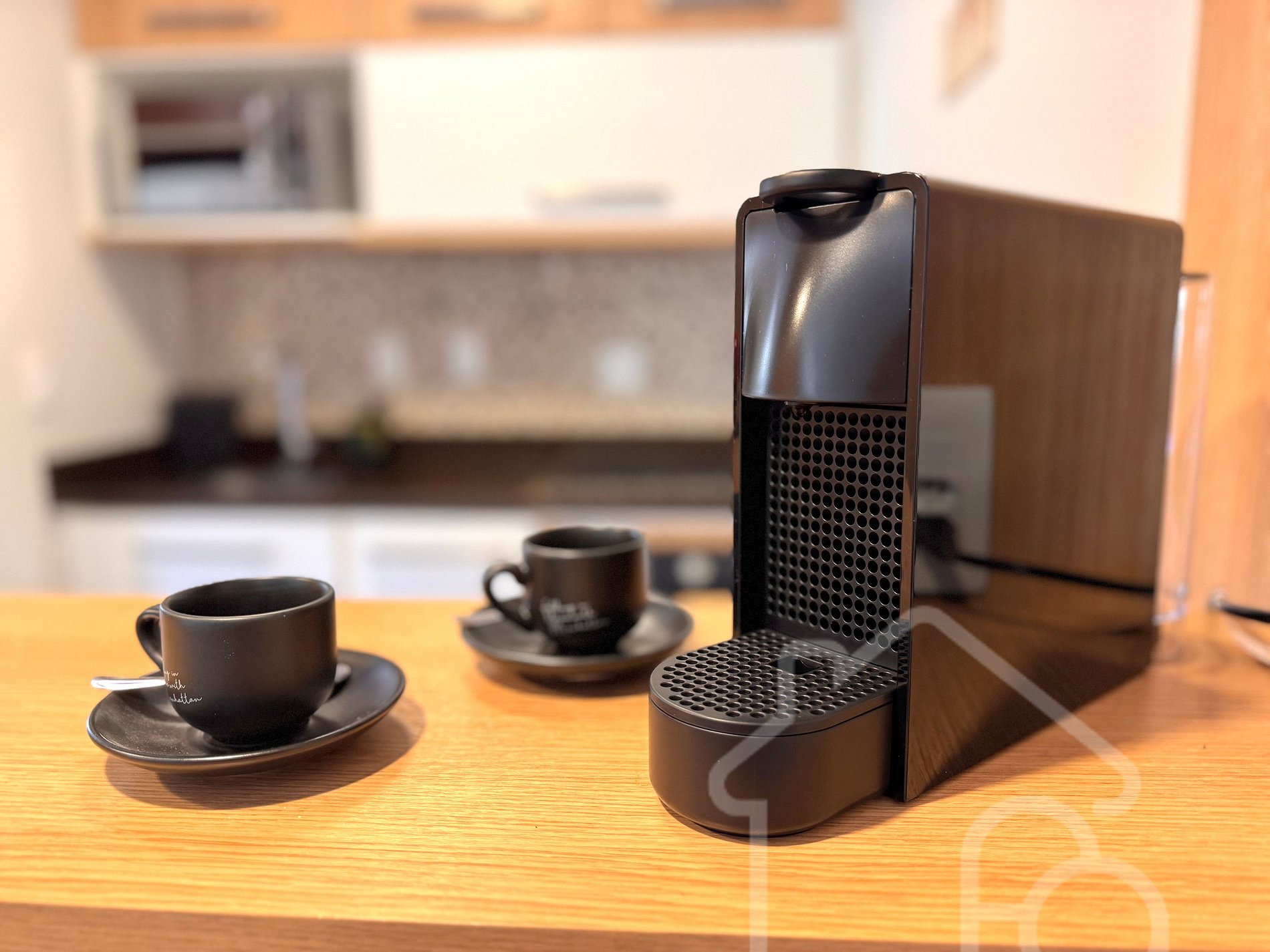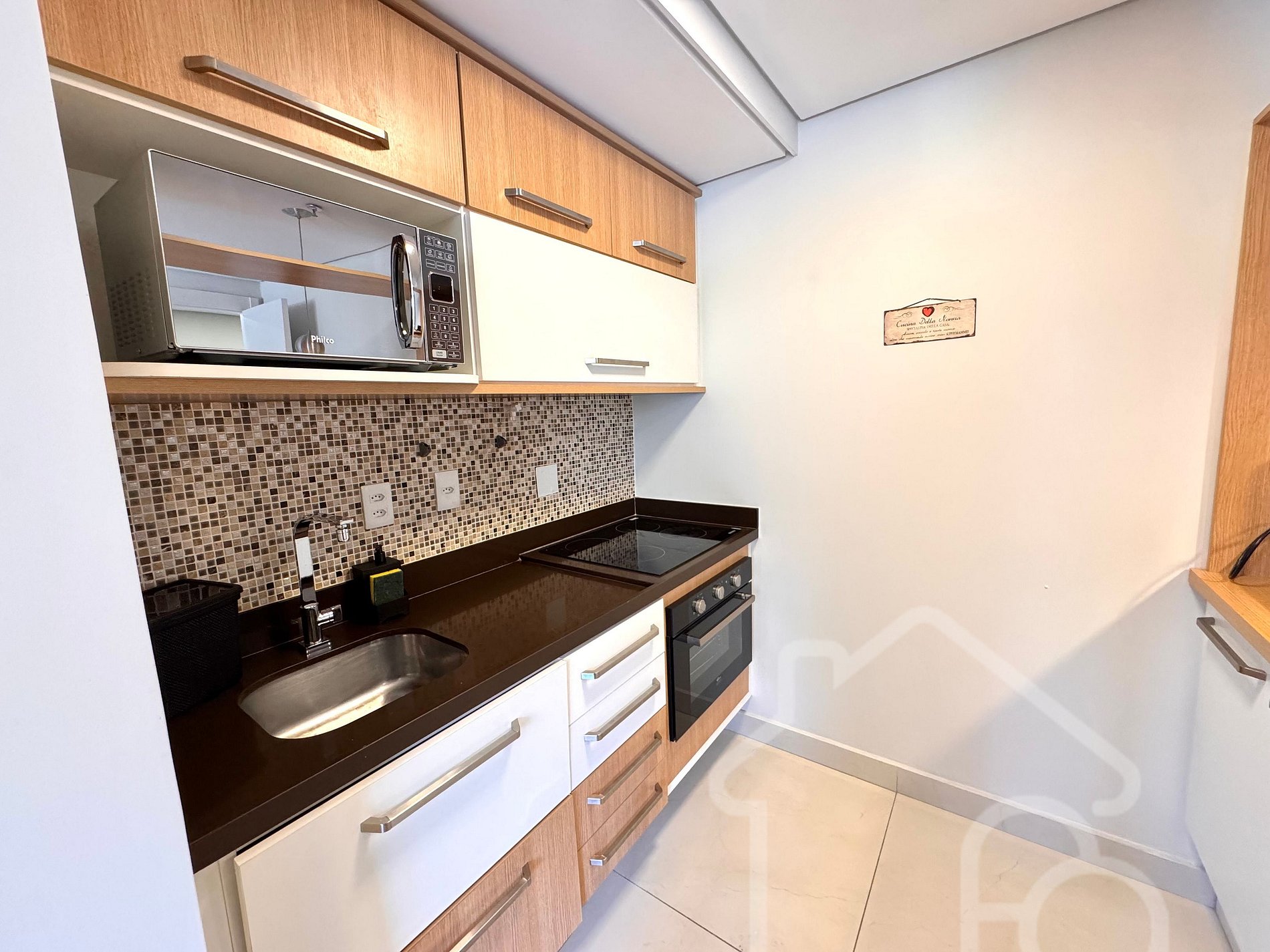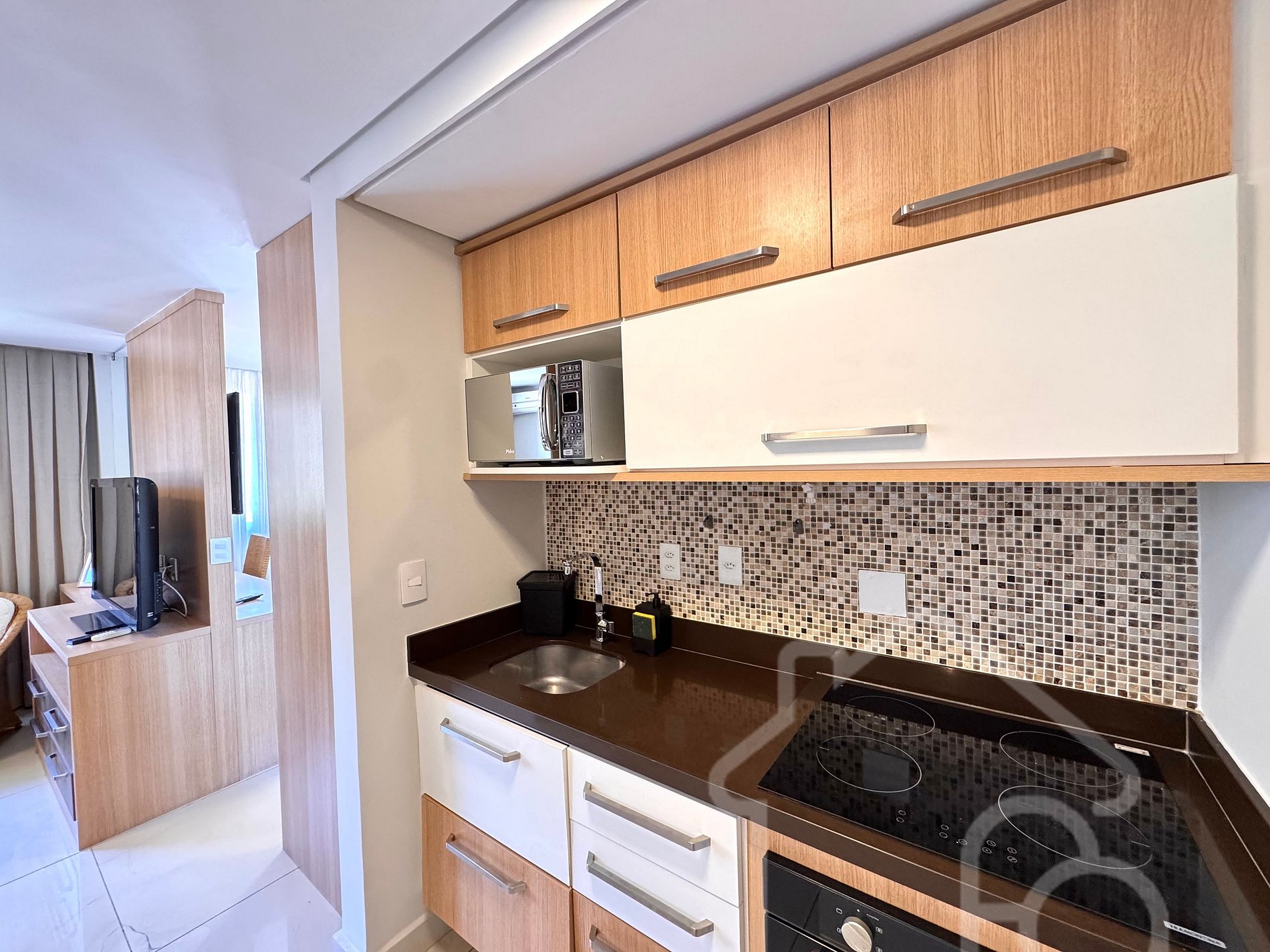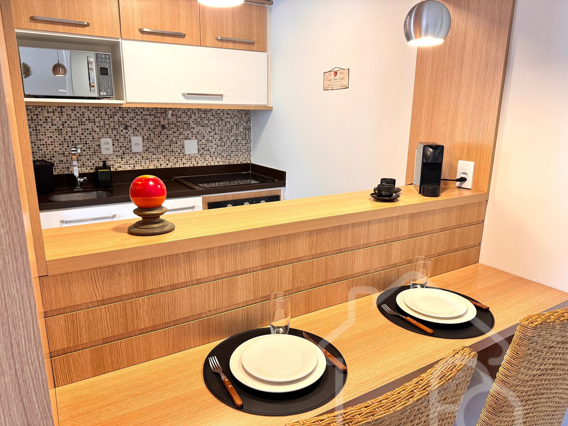 - Cozinha compacta com geladeira, micro-ondas, cooktop, forno e cafeteira de cápsula