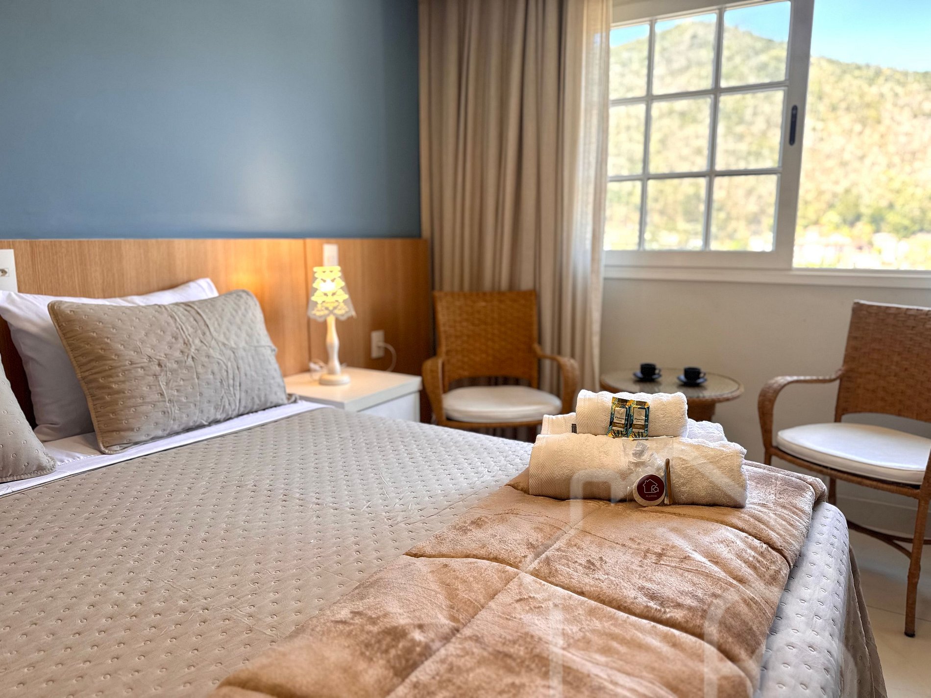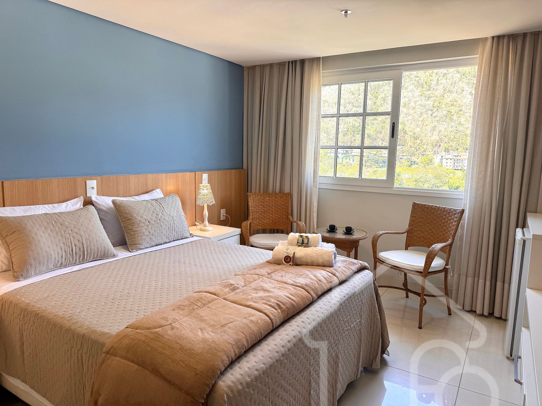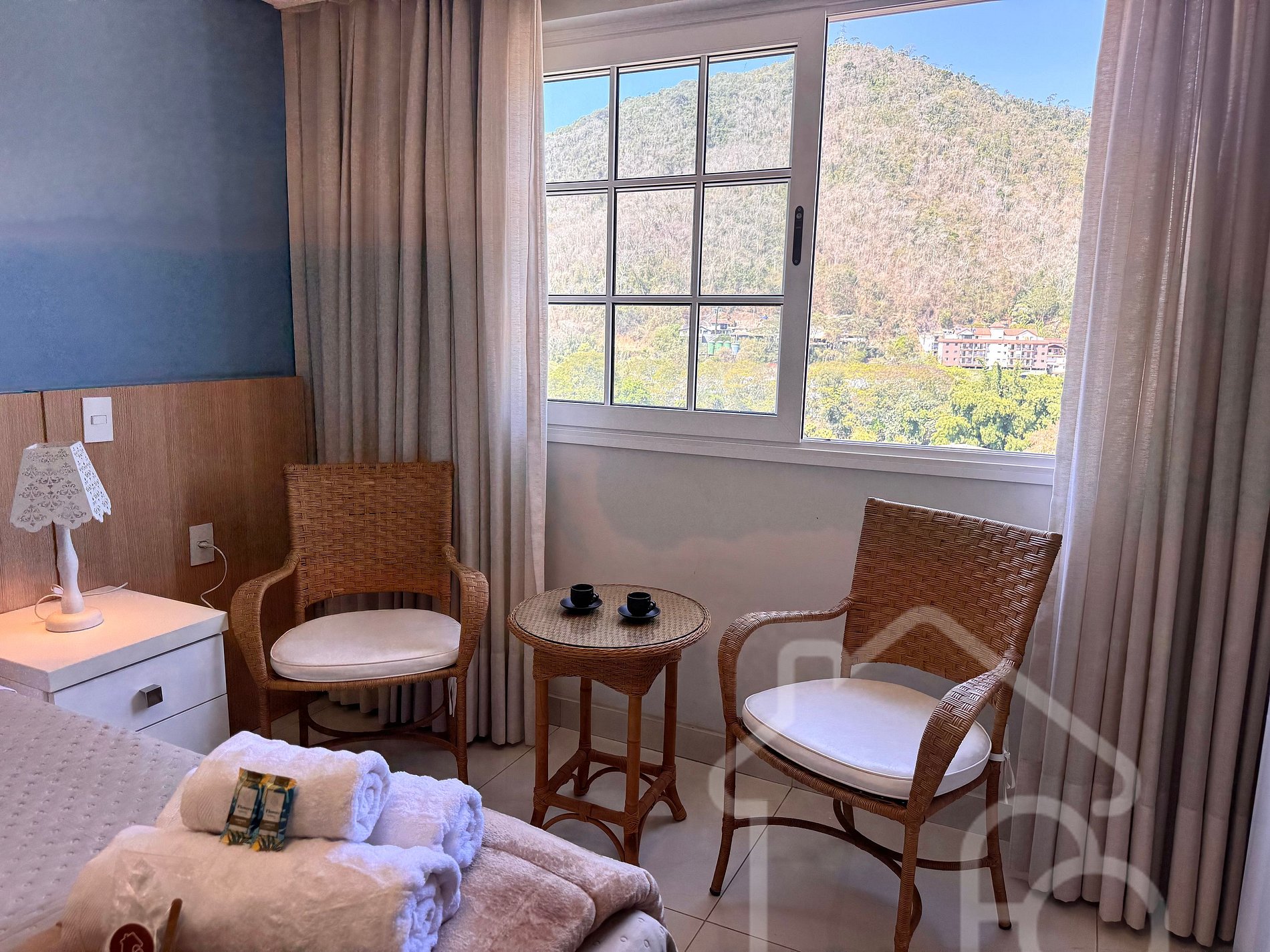 Quarto aconchegante na Granja Brasil, Itaipava, com cama queen, banheiro privativo, TV com streaming e máquina de café. O condomínio oferece estrutura completa: piscinas, quadras de tênis, sauna, ofurô, deck panorâmico, parquinho, academia, centro gastronômico, trilhas e segurança 24h. Localização privilegiada, próxima ao Parque de Exposições, restaurantes e atrações da serra.