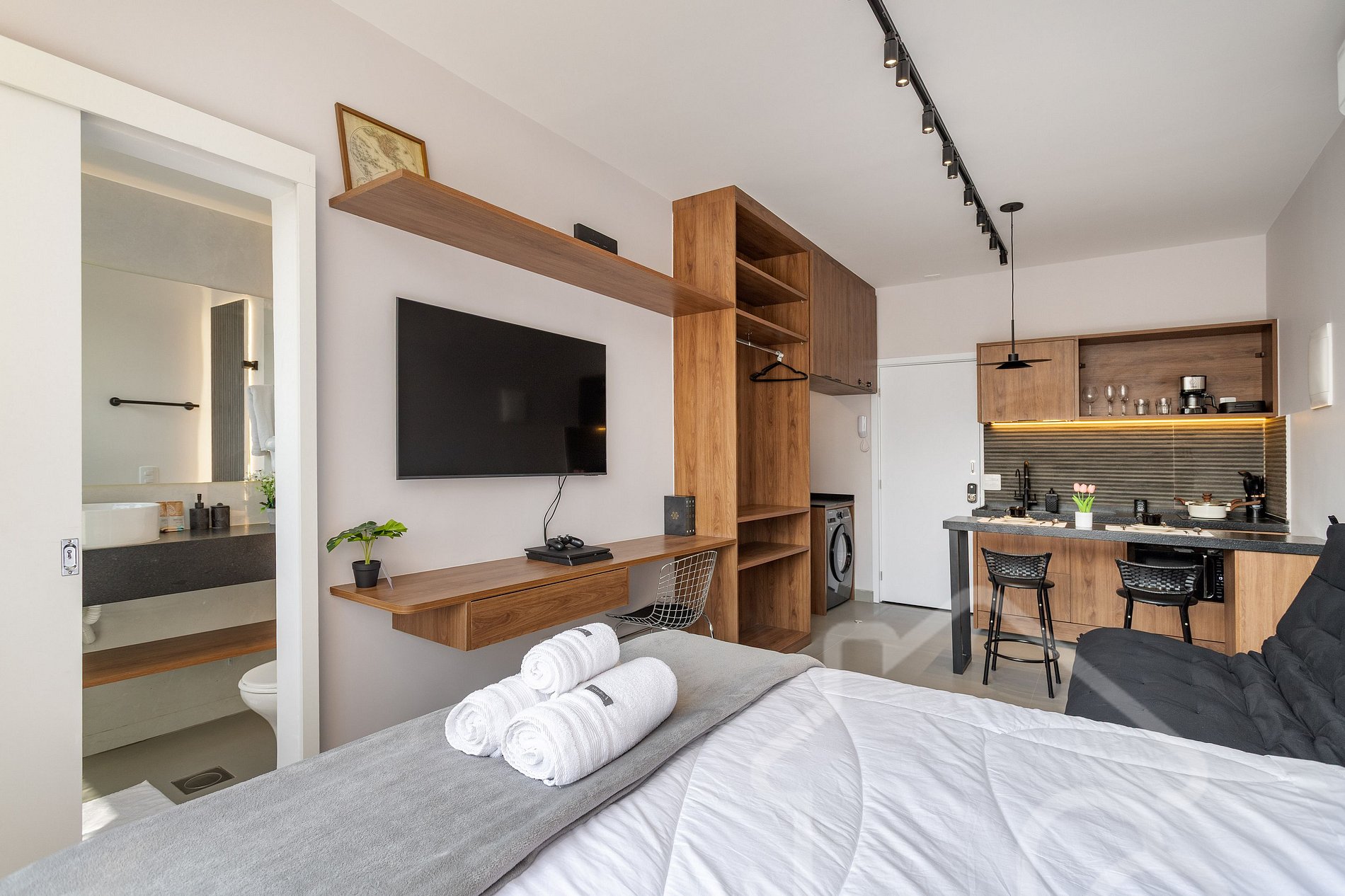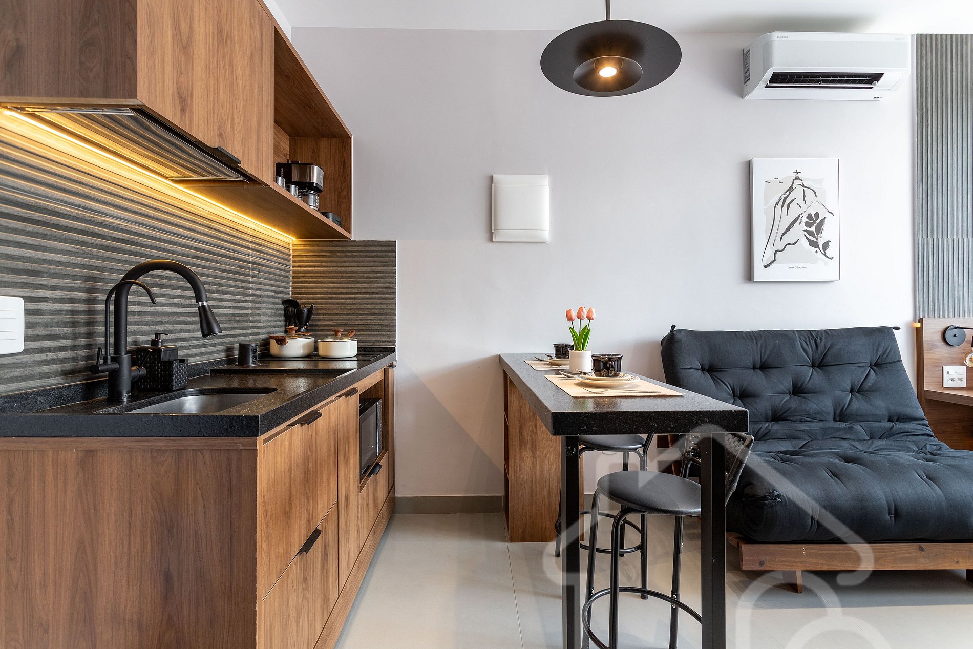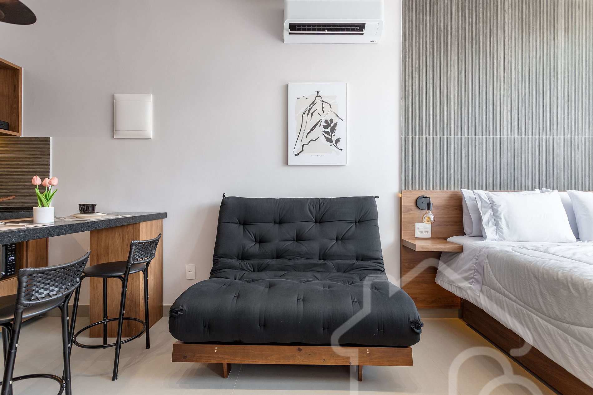 8. Localização e arredores : O estúdio está em uma região super bem localizada, a apenas 1 km do Trem do Corcovado (acesso ao Cristo Redentor) e cercado por comércios, cafés e restaurantes. Há também uma unidade da Smart Fit a apenas 50 metros, ideal para quem deseja manter a rotina de treinos durante a estadia.