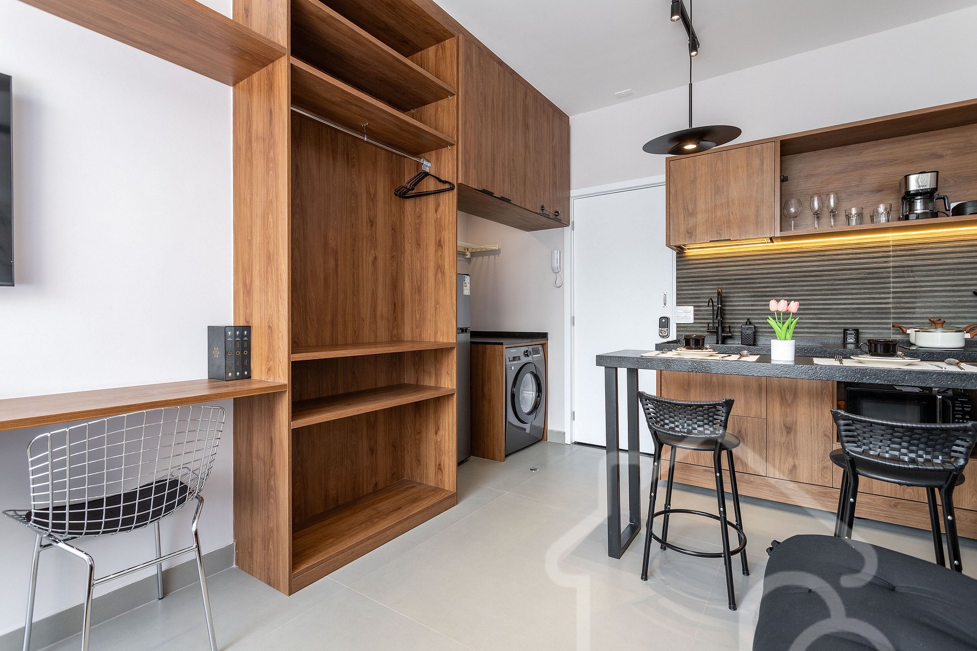 - Os hóspedes têm acesso livre a todas as dependências do estúdio, incluindo cozinha completa, área de serviço e banheiro privativo. O prédio conta com elevador, mercadinho de conveniência e academia, esta última de uso pago, mediante cadastro na recepção. Por ser condomínio residencial, é importante respeitar as regras de silêncio e convivência estabelecidas pelo local.