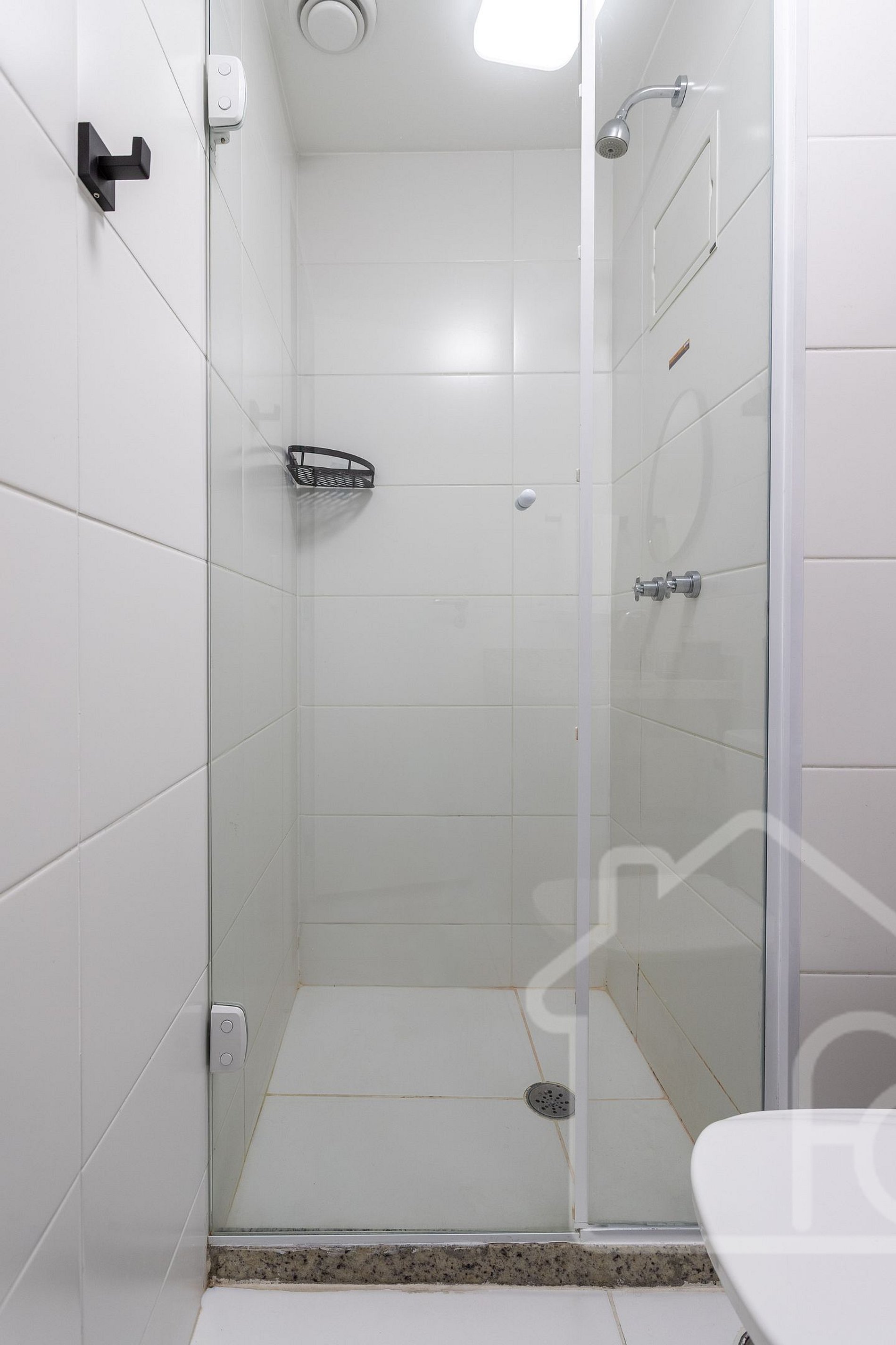 - Banheiro social moderno, completo com chuveiro de alta pressão e toalhas macias