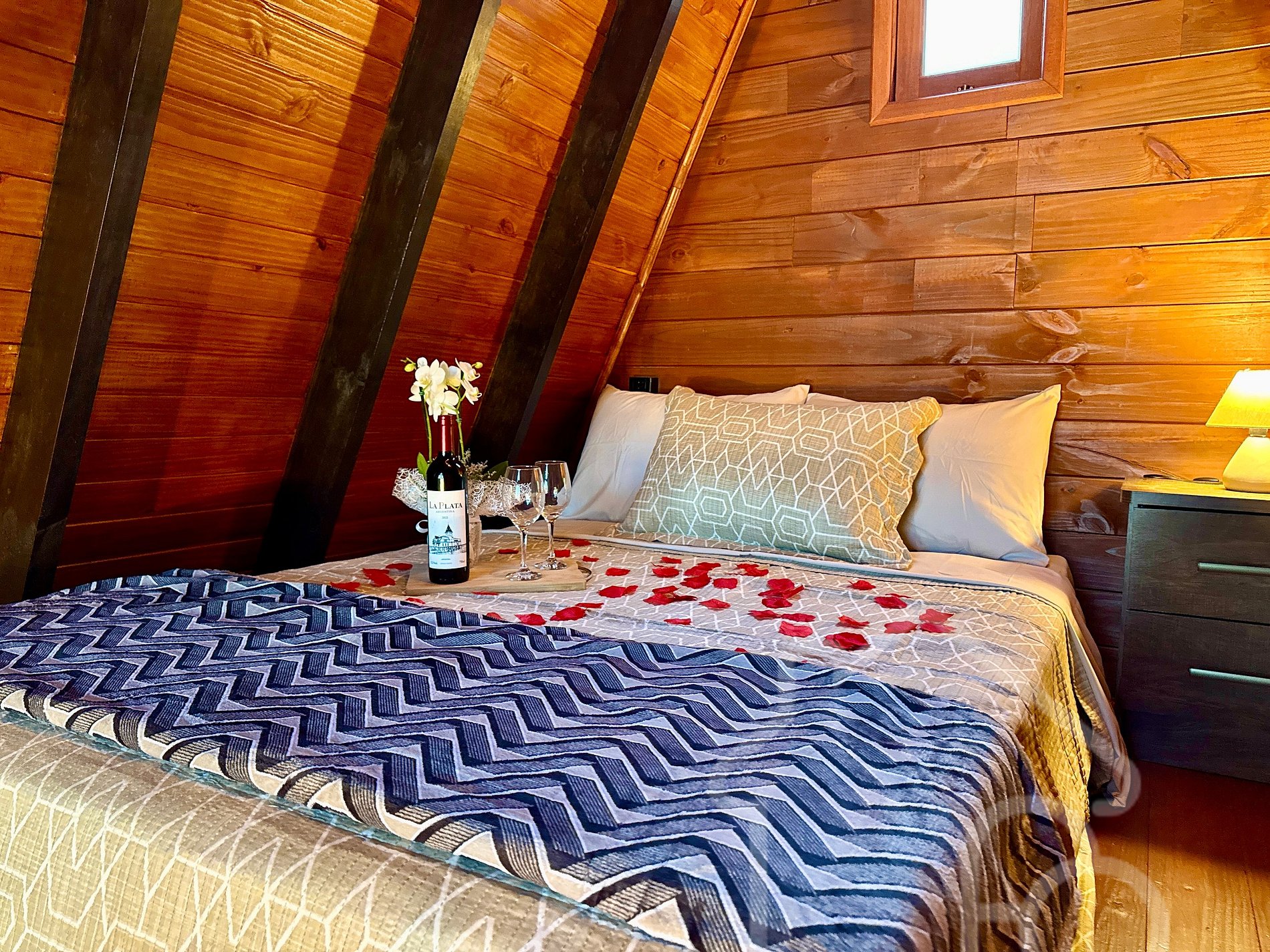 O chalé em madeira foi cuidadosamente projetado para oferecer uma experiência romântica e acolhedora em meio à natureza, combinando conforto, charme e uma vista encantadora.