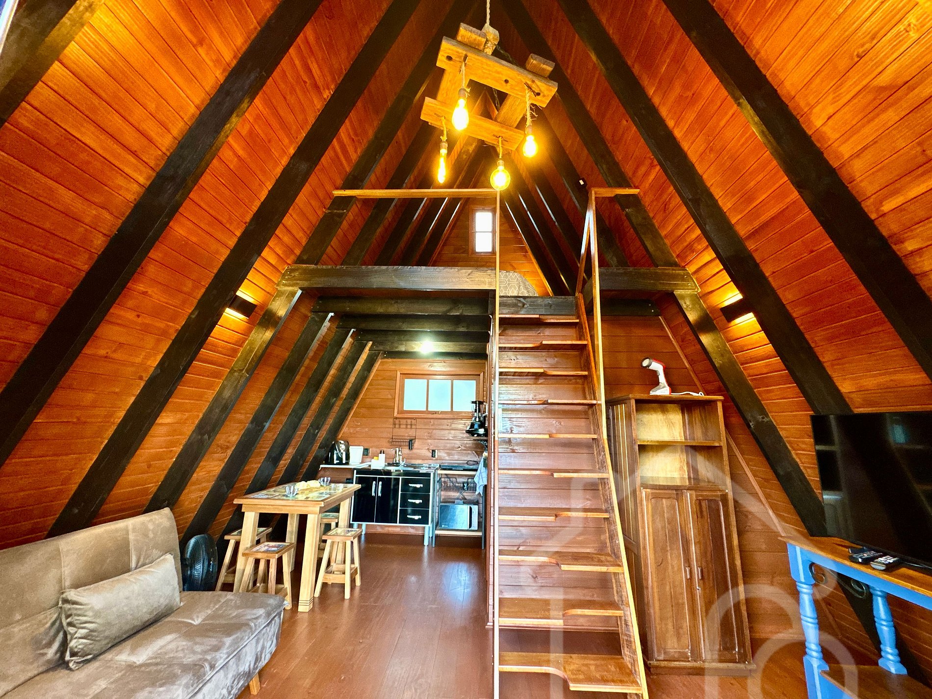- Mezanino com quarto: cama de casal confortável e atmosfera intimista, ideal para momentos de descanso e romance.