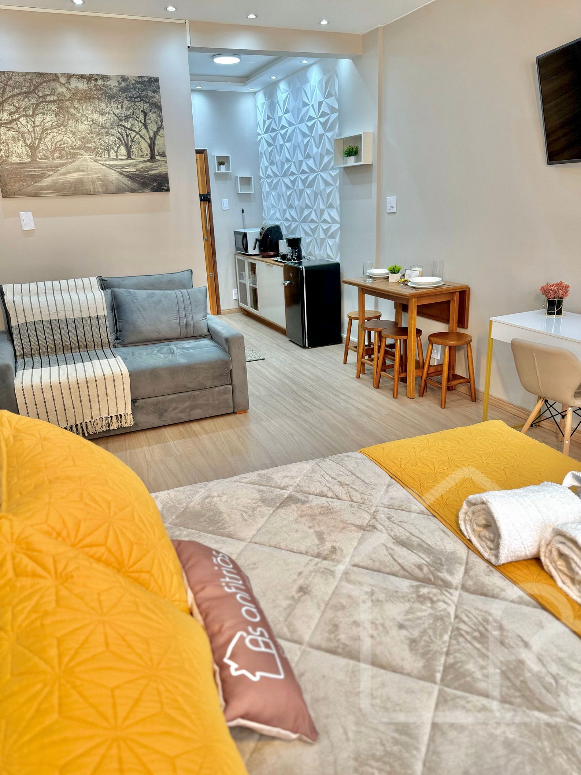Estúdio super bem decorado e reformado, com ar-condicionado, sofá-cama, espaço de trabalho, arara com cabides e cortina blackout. TV smart com suporte giratório. Cozinha completa com cooktop, frigobar, filtro, micro-ondas, airfryer e cafeteira. Banheiro moderno com secador e ferro. O prédio conta com elevador e oferecemos uma vaga de garagem localizada a apenas 3 minutos a pé do estúdio, trazendo ainda mais comodidade para sua estadia.