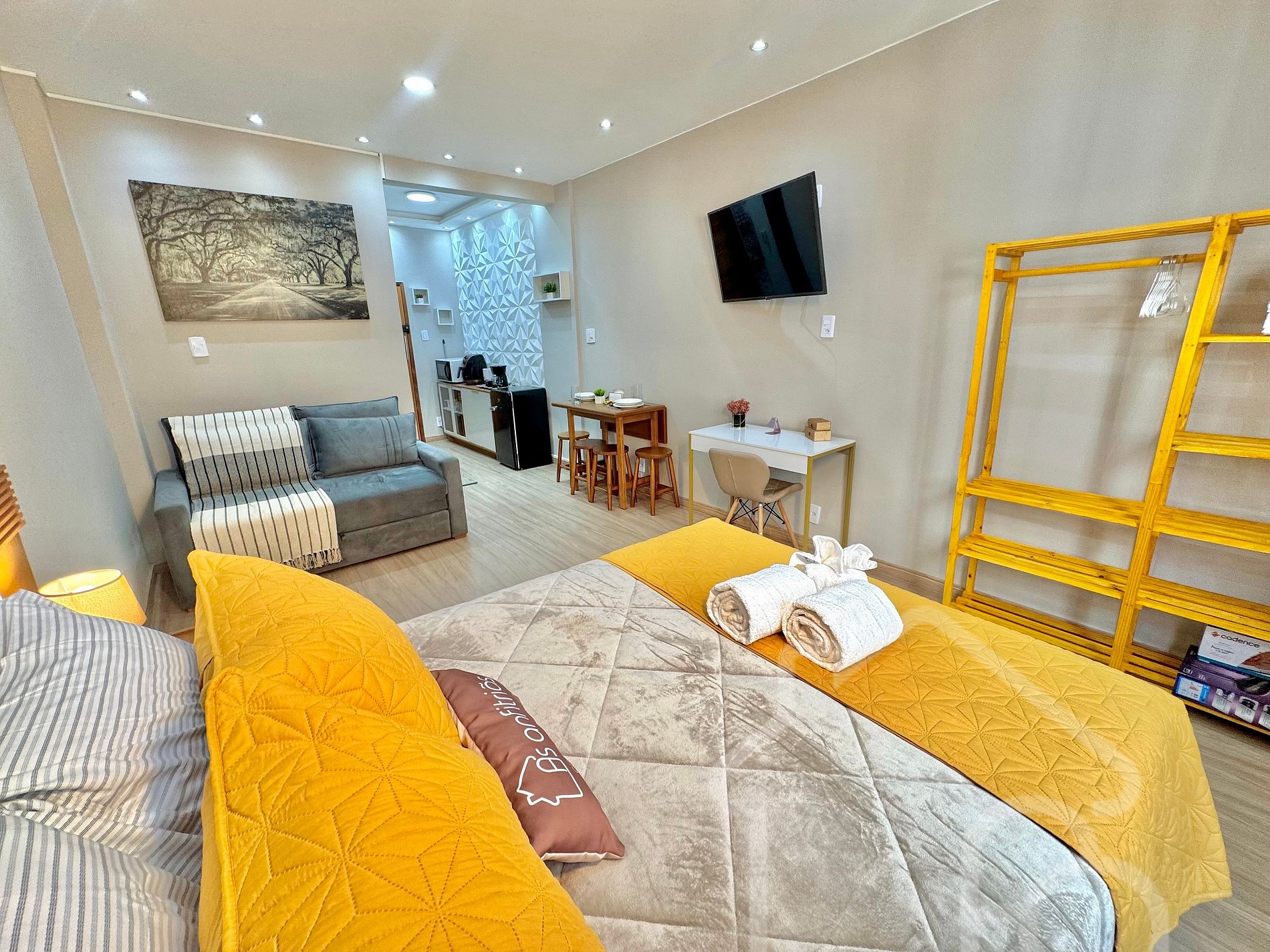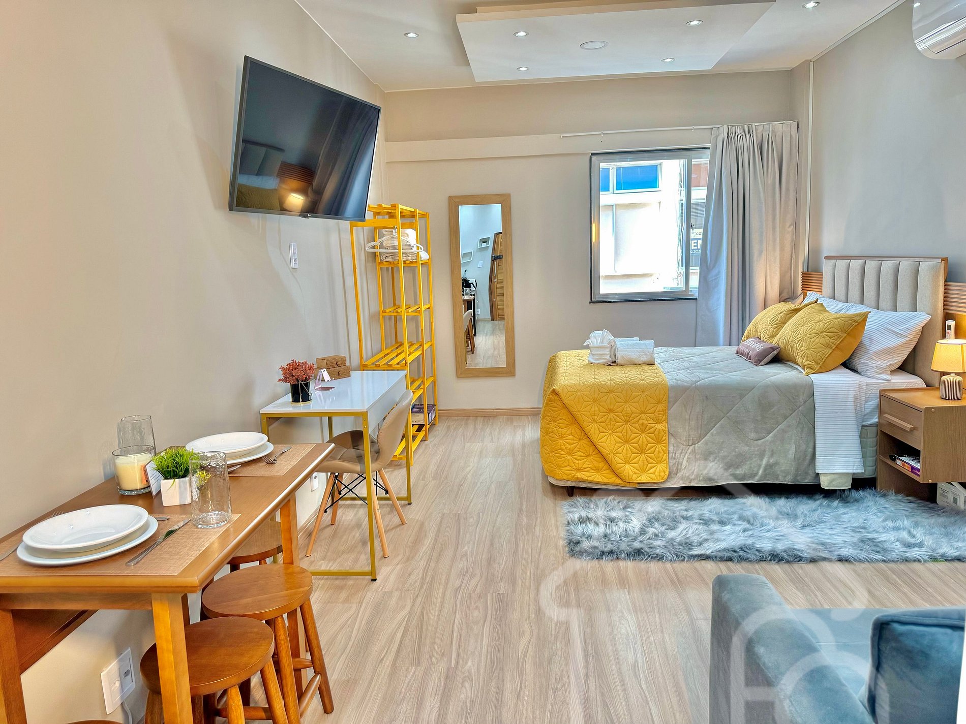 Estúdio super bem decorado e reformado, com ar-condicionado, sofá-cama, espaço de trabalho, arara com cabides e cortina blackout. TV smart com suporte giratório. Cozinha completa com cooktop, frigobar, filtro, micro-ondas, airfryer e cafeteira. Banheiro moderno com secador e ferro. O prédio conta com elevador e oferecemos uma vaga de garagem localizada a apenas 3 minutos a pé do estúdio, trazendo ainda mais comodidade para sua estadia.