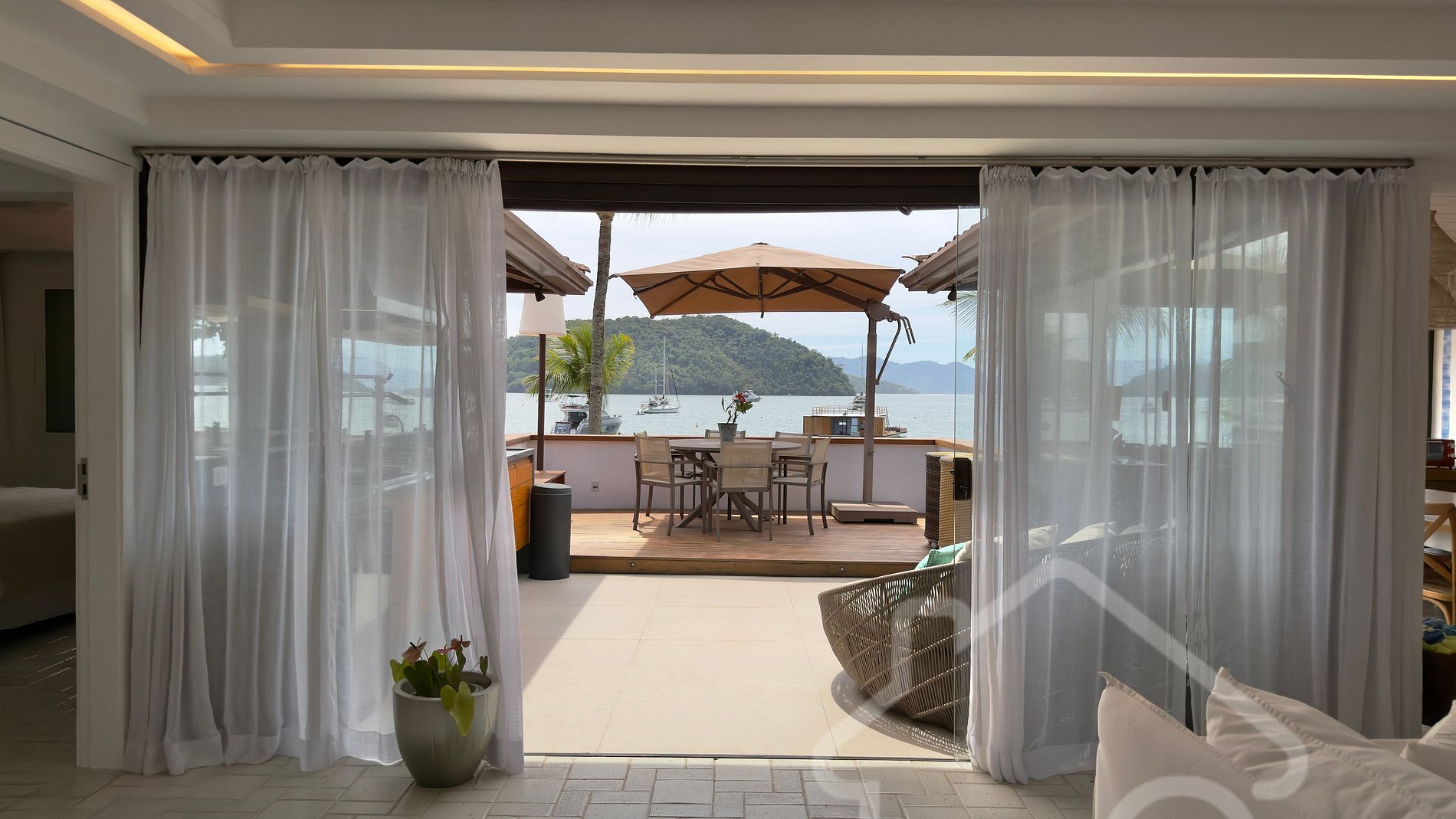 Dentro do Porto Frade está localizado o Condomínio Germana Guinle, onde se encontra a casa. Um espaço ainda mais exclusivo, que oferece academia, piscina, sauna e restaurante próprio, proporcionando aos hóspedes uma experiência completa, com comodidade, bem-estar e lazer sem sair do condomínio.
