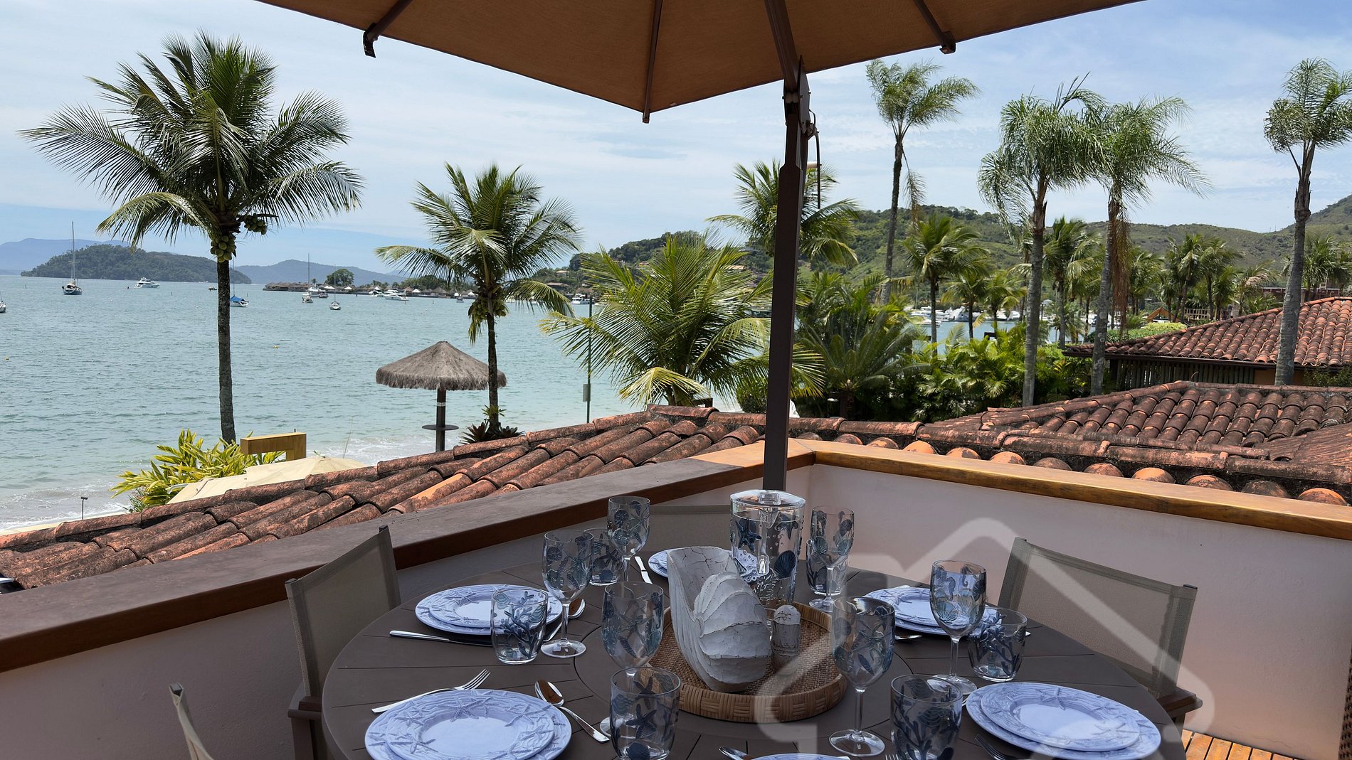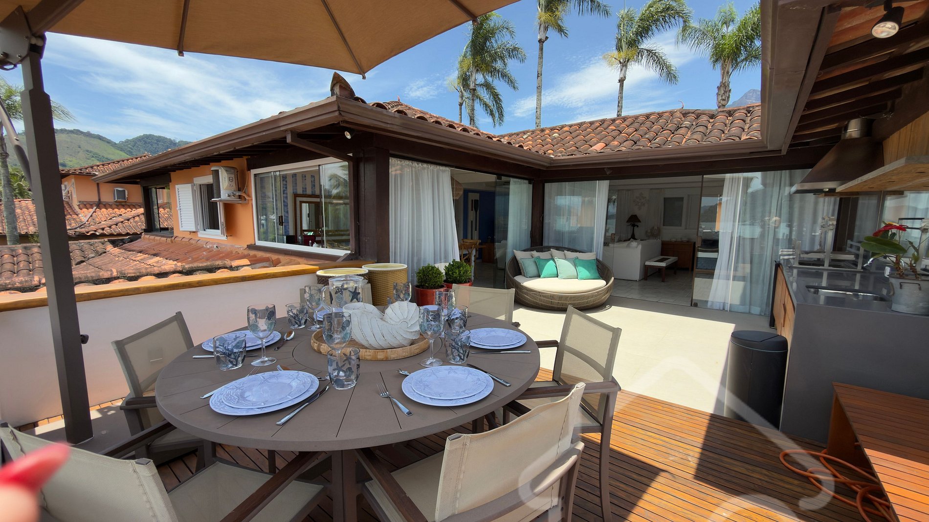 - Área externa deslumbrante com chaise, mesa, ombrelone e vista mar.