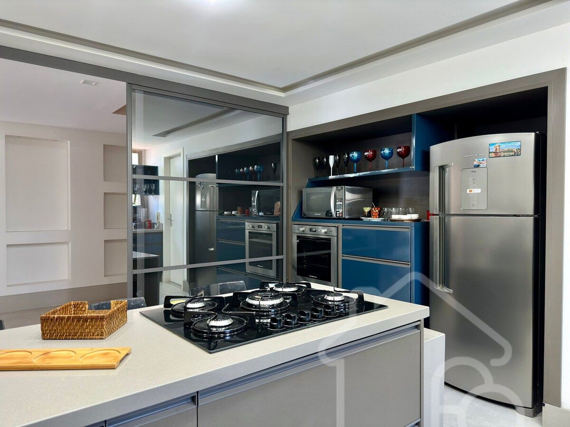 Cozinha totalmente equipada, com geladeira, fogão, forno, micro-ondas, filtro de água, sanduicheira, air fryer, liquidificador, taças, talheres e pratos