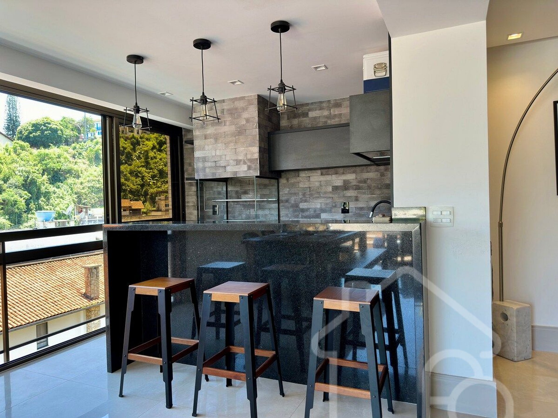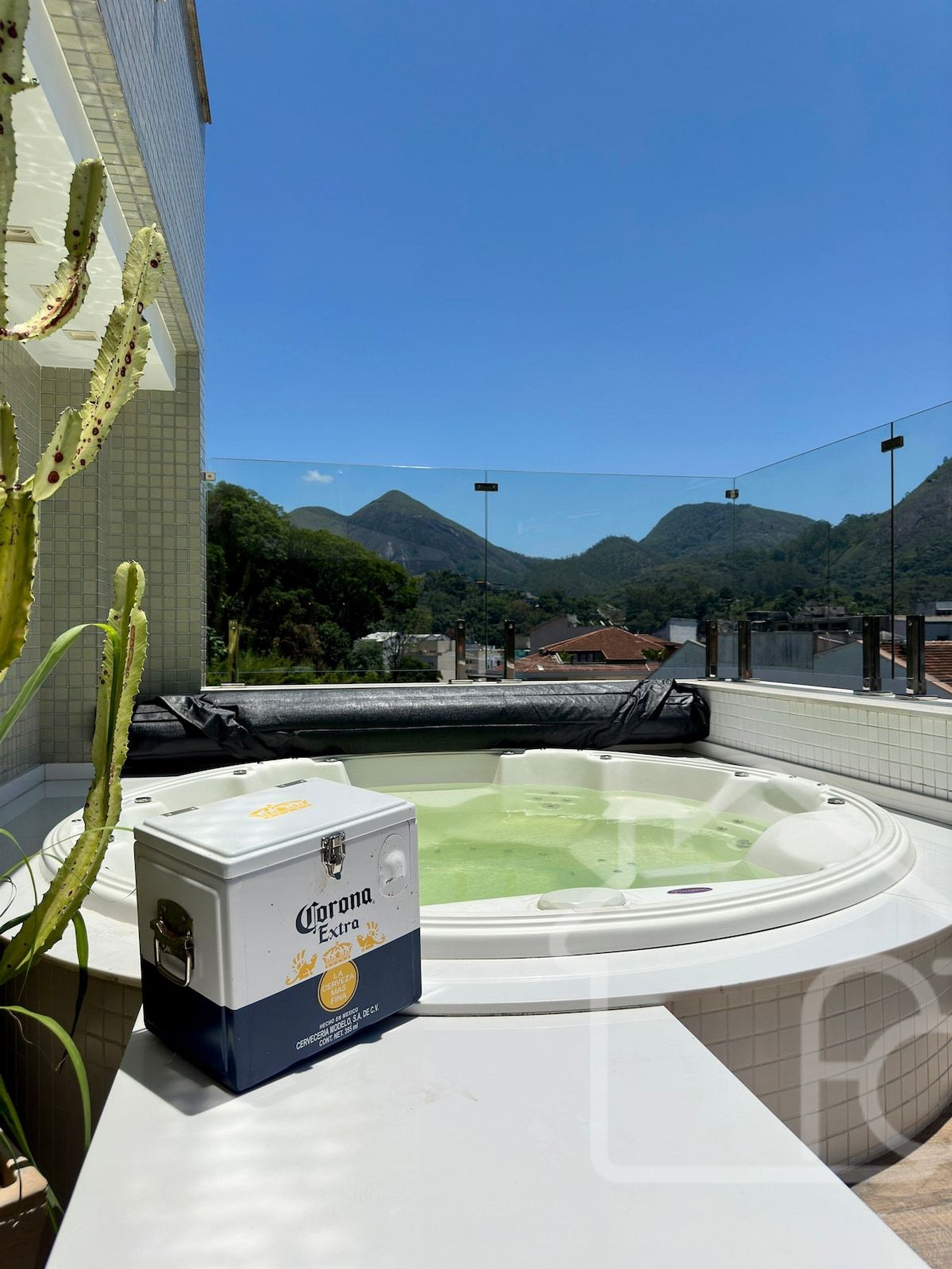 Cobertura completa no coração de Nova Friburgo, com jacuzzi e vista panorâmica, sala ampla integrada à sala de jantar e área gourmet equipada com churrasqueira, sinuca, mesa de poker, TV, som e rede. Possui duas suítes com banheiros privativos, cozinha totalmente equipada e duas vagas de garagem. Localização central, próxima a restaurantes, lojas e trilhas. Ideal para quem busca conforto, lazer e uma vista inesquecível.