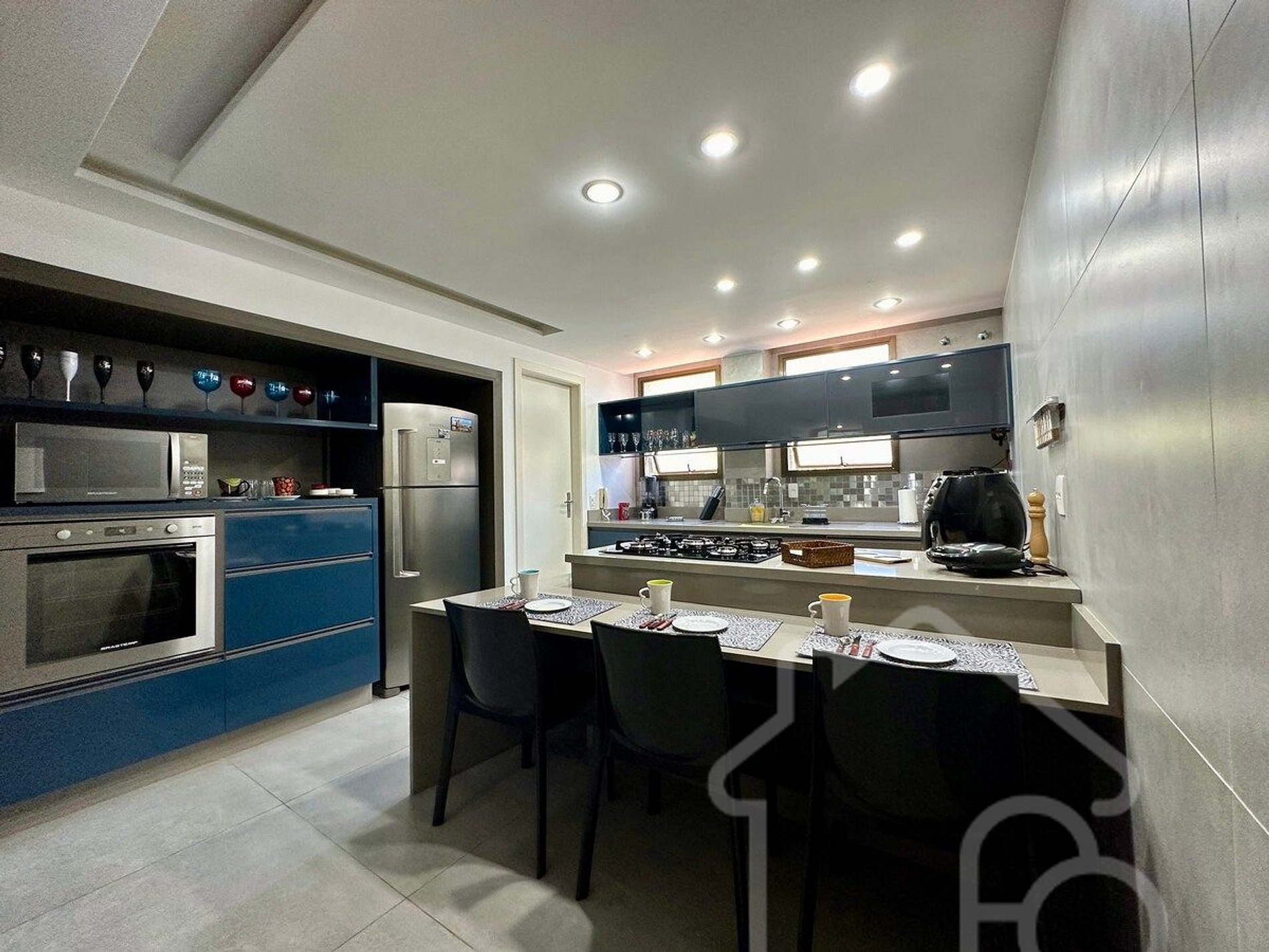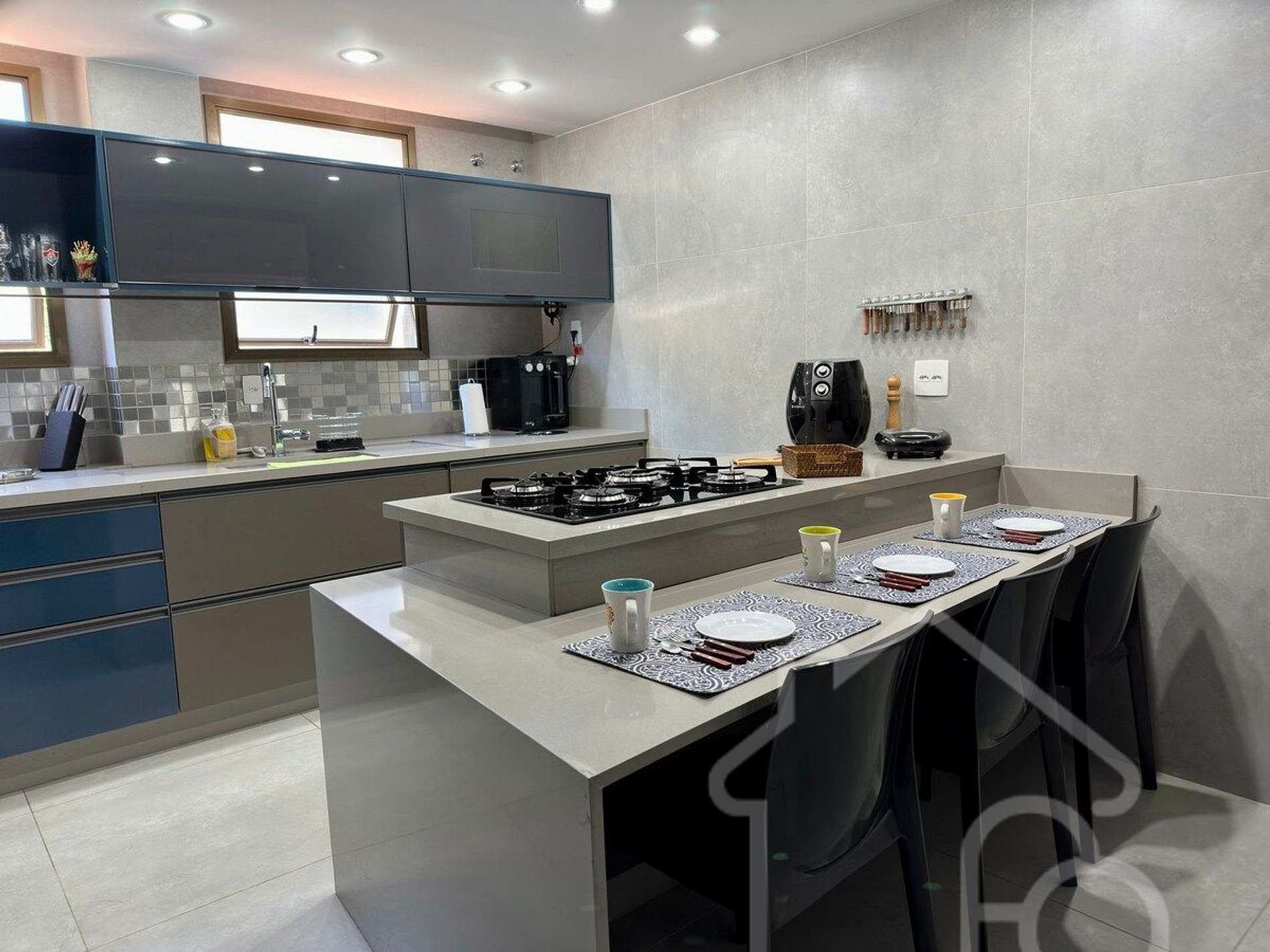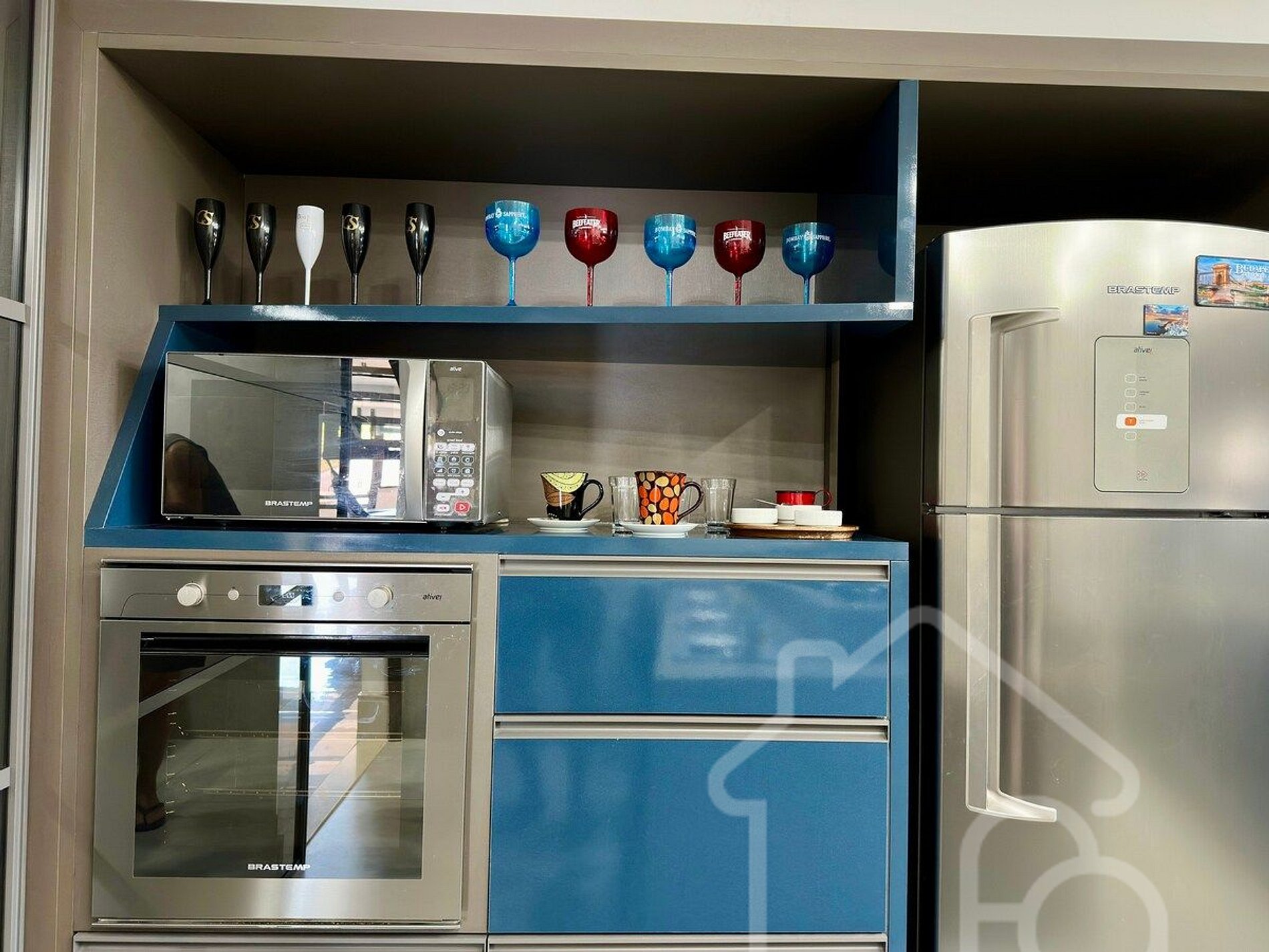 Cozinha totalmente equipada, com geladeira, fogão, forno, micro-ondas, filtro de água, sanduicheira, air fryer, liquidificador, taças, talheres e pratos