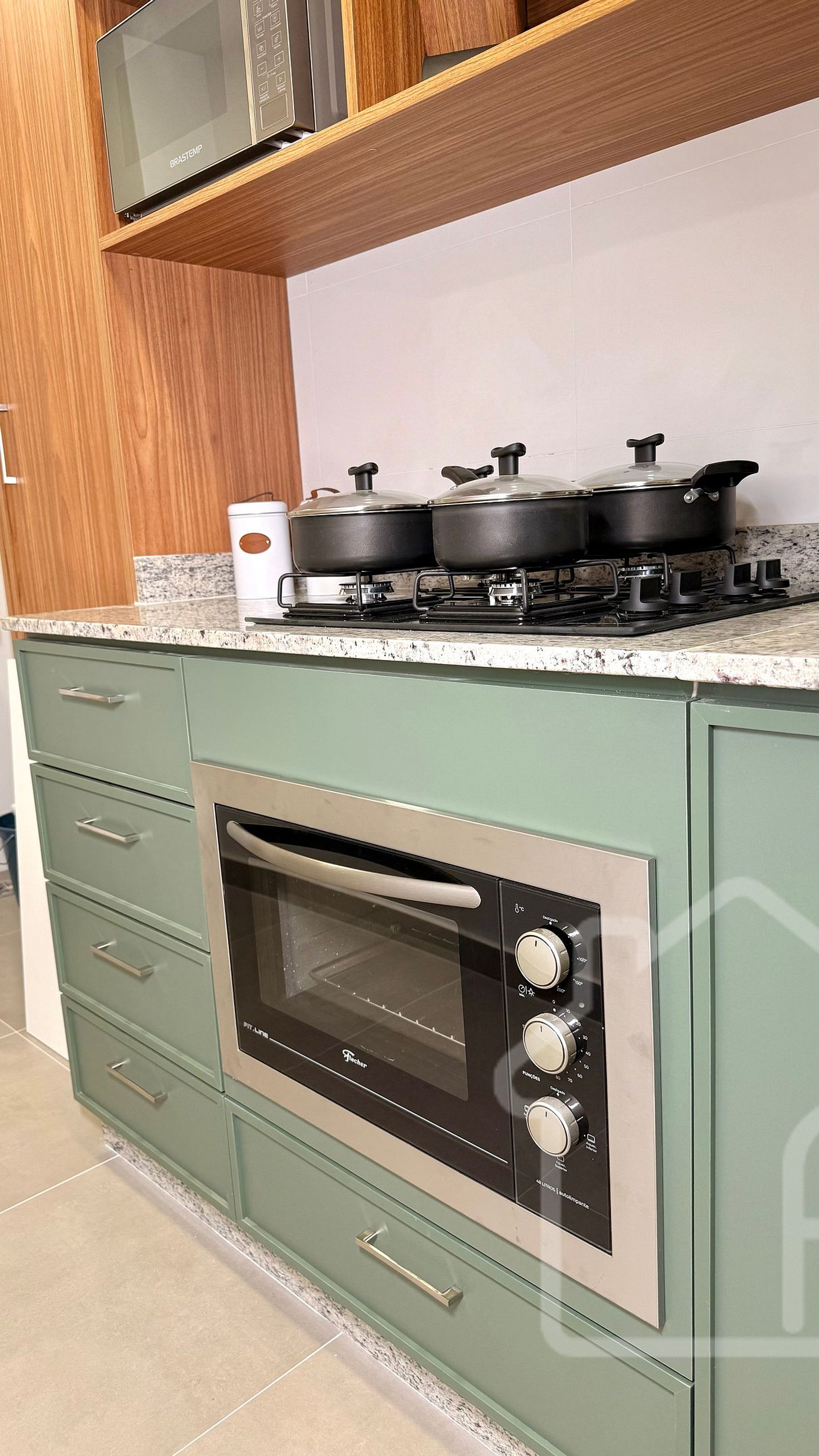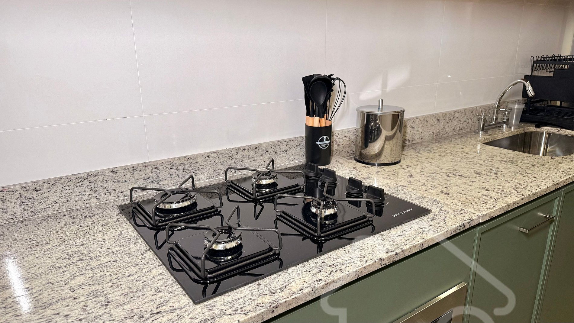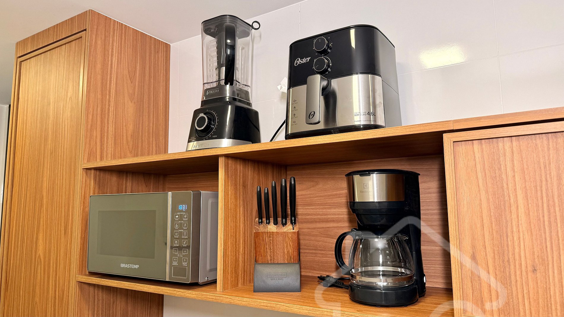 - Cozinha moderna totalmente equipada: cooktop, forno, micro-ondas, airfryer, cafeteira e geladeira.