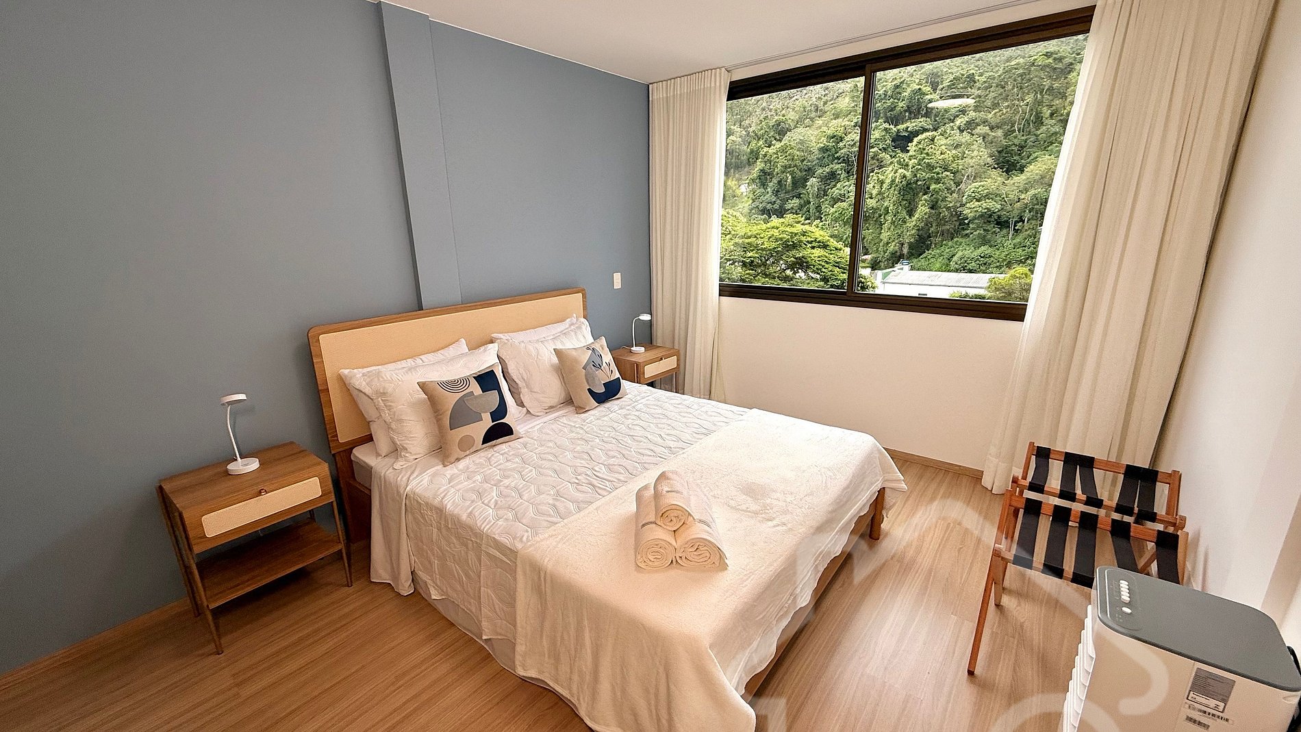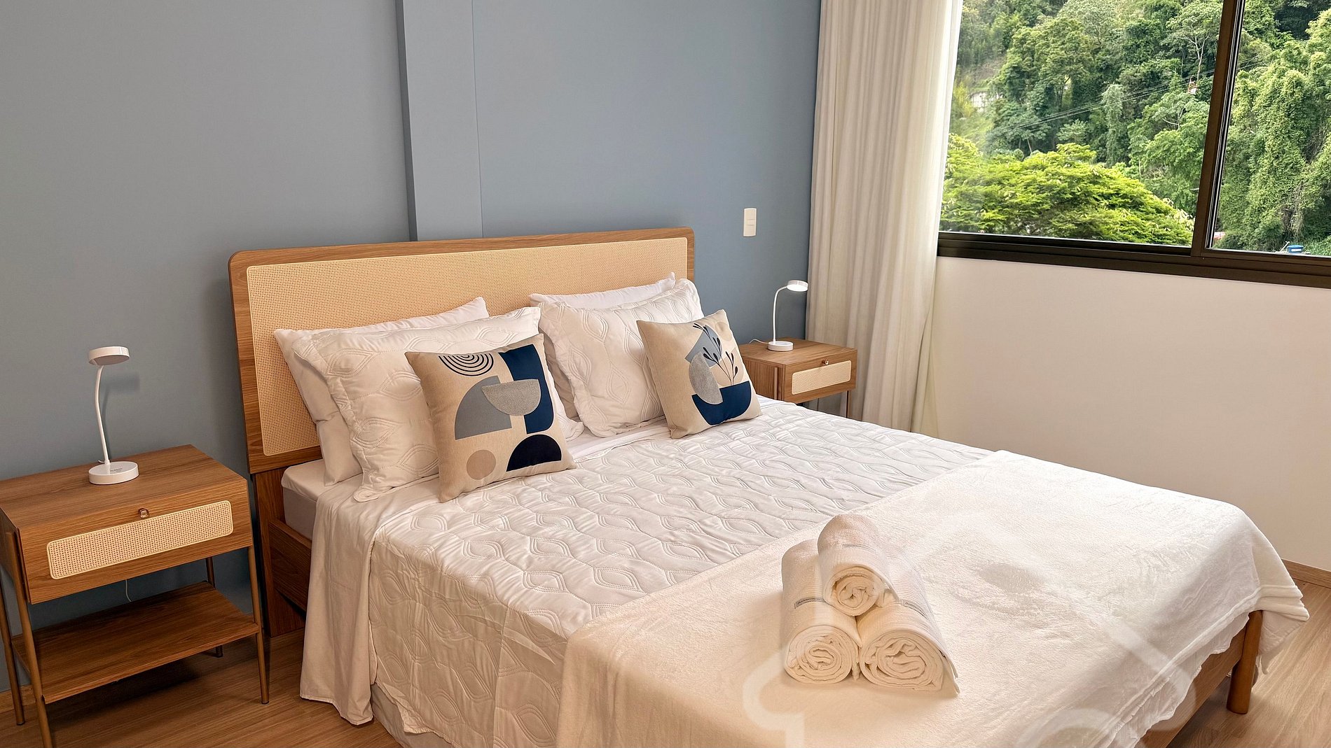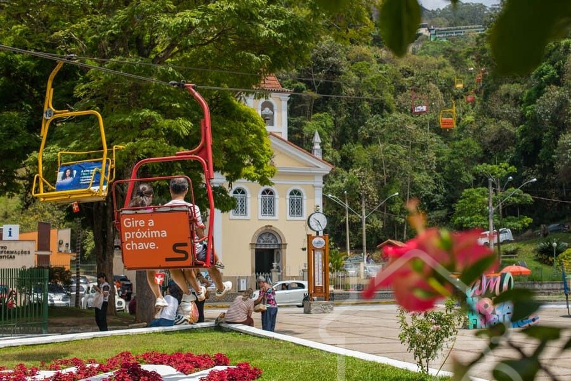 Apartamento novo e projetado por arquiteto, com sala de estar e jantar integradas com condicionado, Smart TV, varanda com mesa e vista para o teleférico. Suíte com cama queen, arara, maleiro e climatizador. Quarto com cama de casal, arara e maleiro. Cozinha moderna equipada (cooktop, forno, micro-ondas, airfryer, cafeteira, geladeira). Banheiro completo, chuveiro a gás, Wi-Fi e prédio com elevador.
