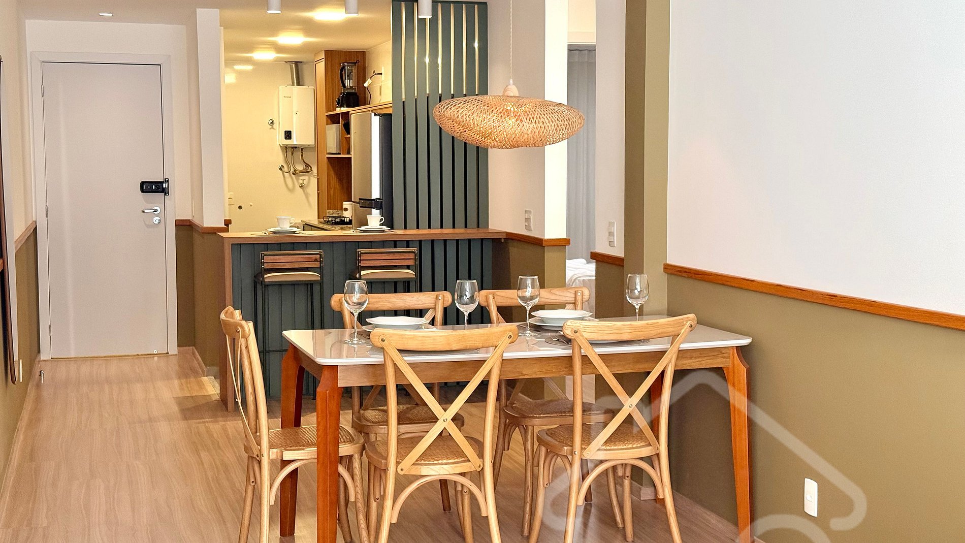 - Sala de estar moderna com ar-condicionado, Smart TV integrada à sala de jantar, perfeita para relaxar ou reunir amigos.