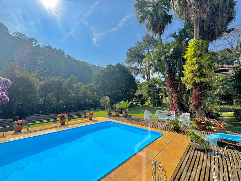 Desfrute de uma estadia incrível nesta casa espaçosa com lindo jardim, piscina privativa e área gourmet com churrasqueira. A casa oferece: