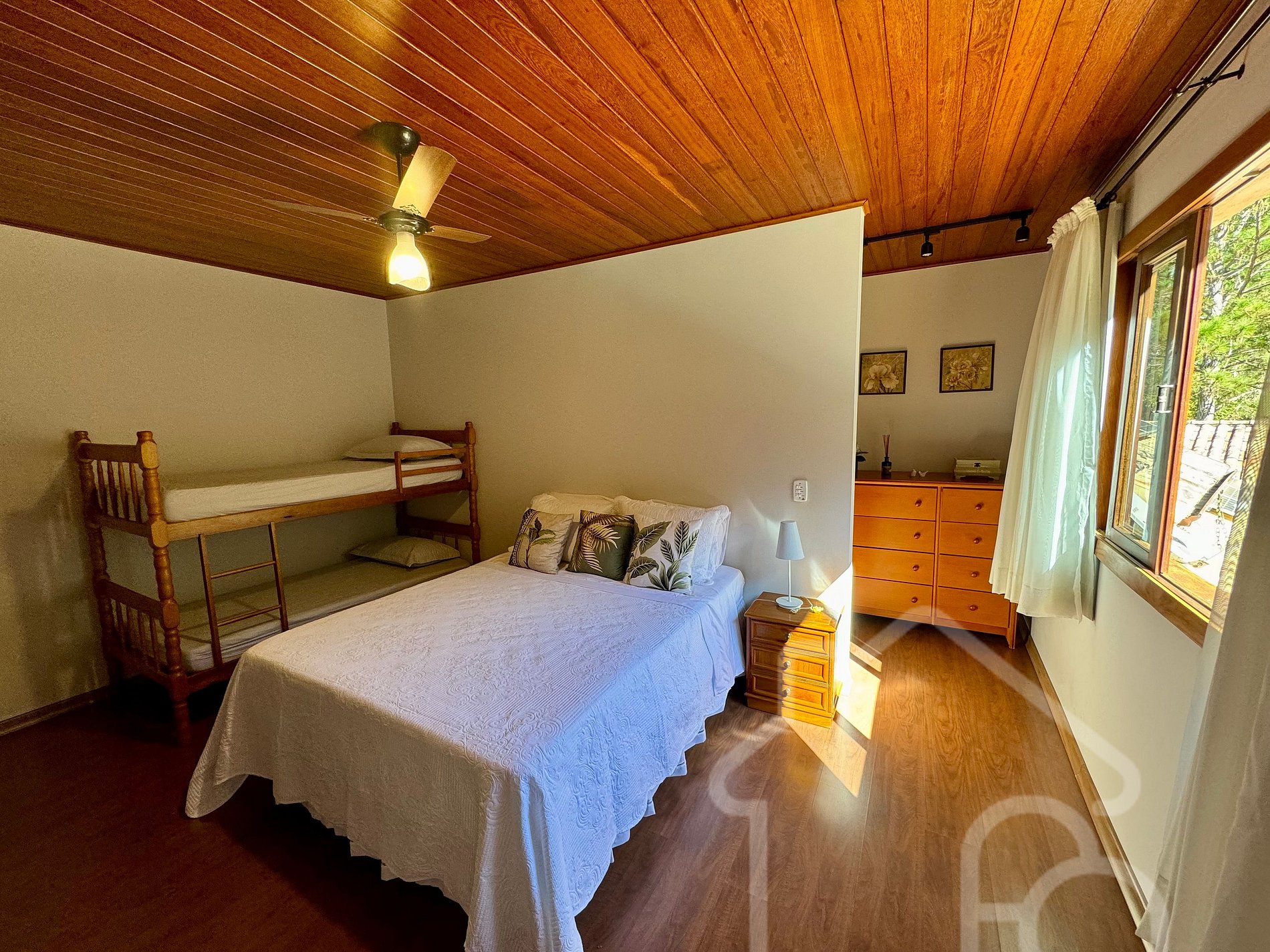 Uma suíte com uma cama de casal e duas beliches.