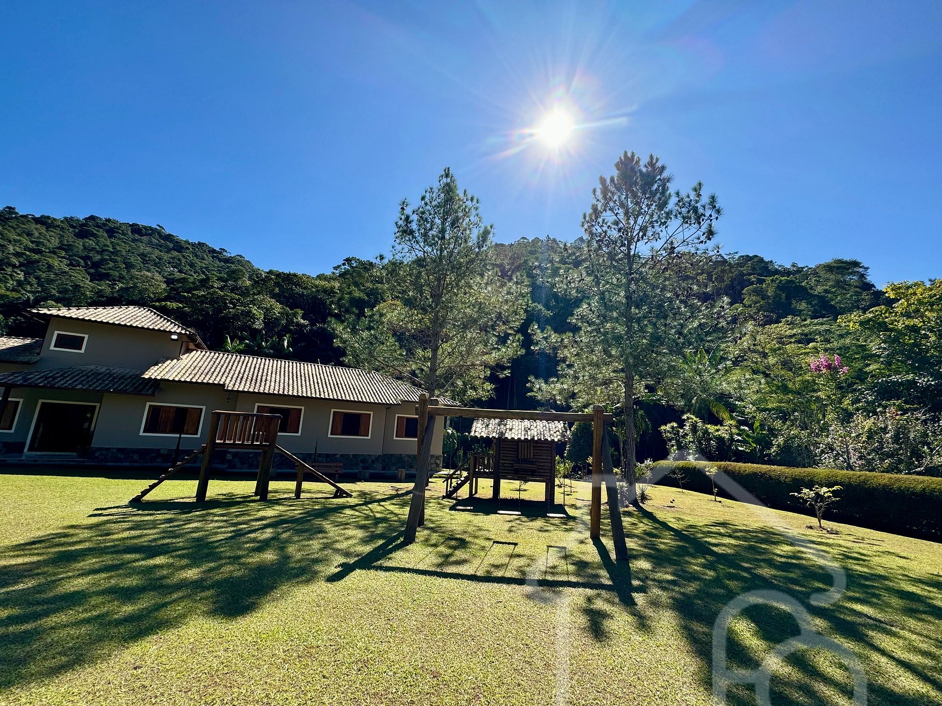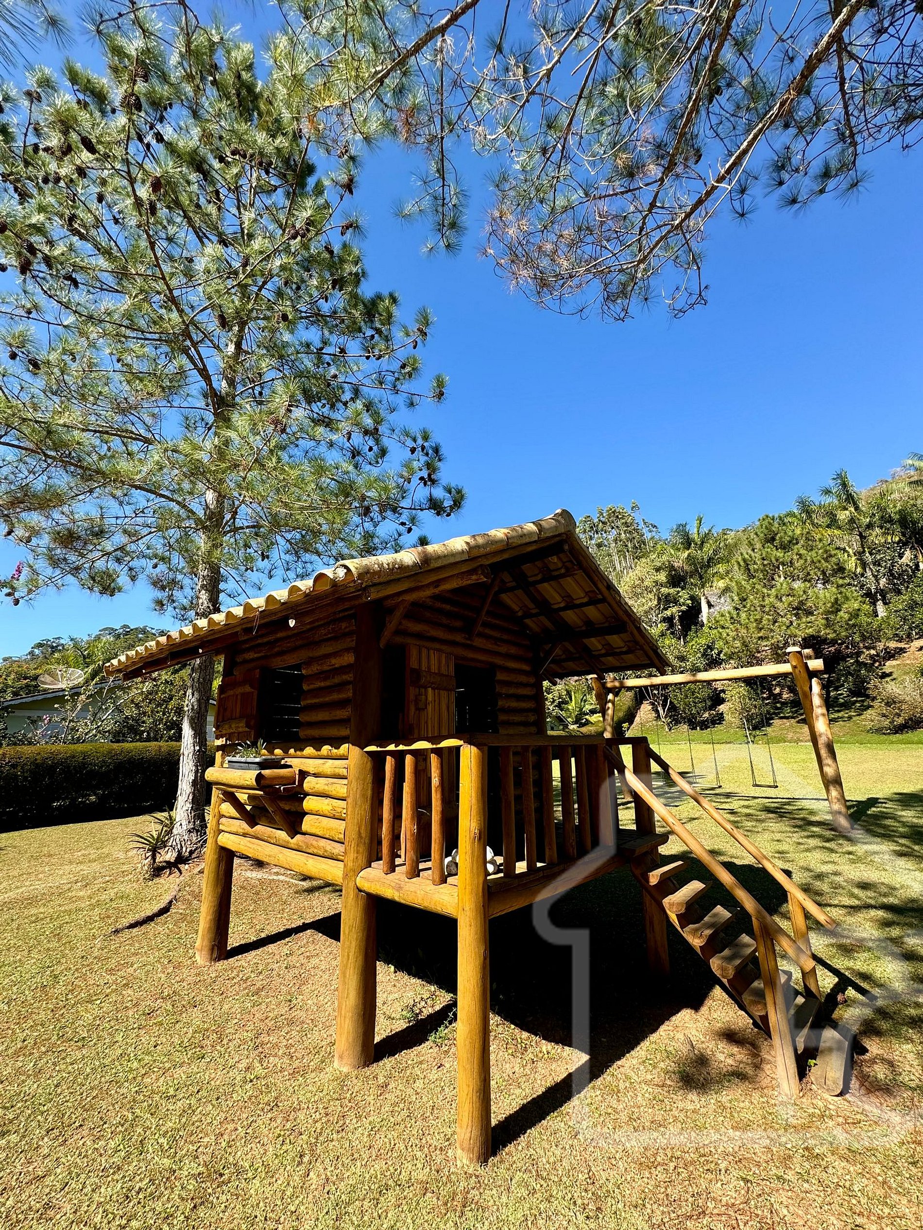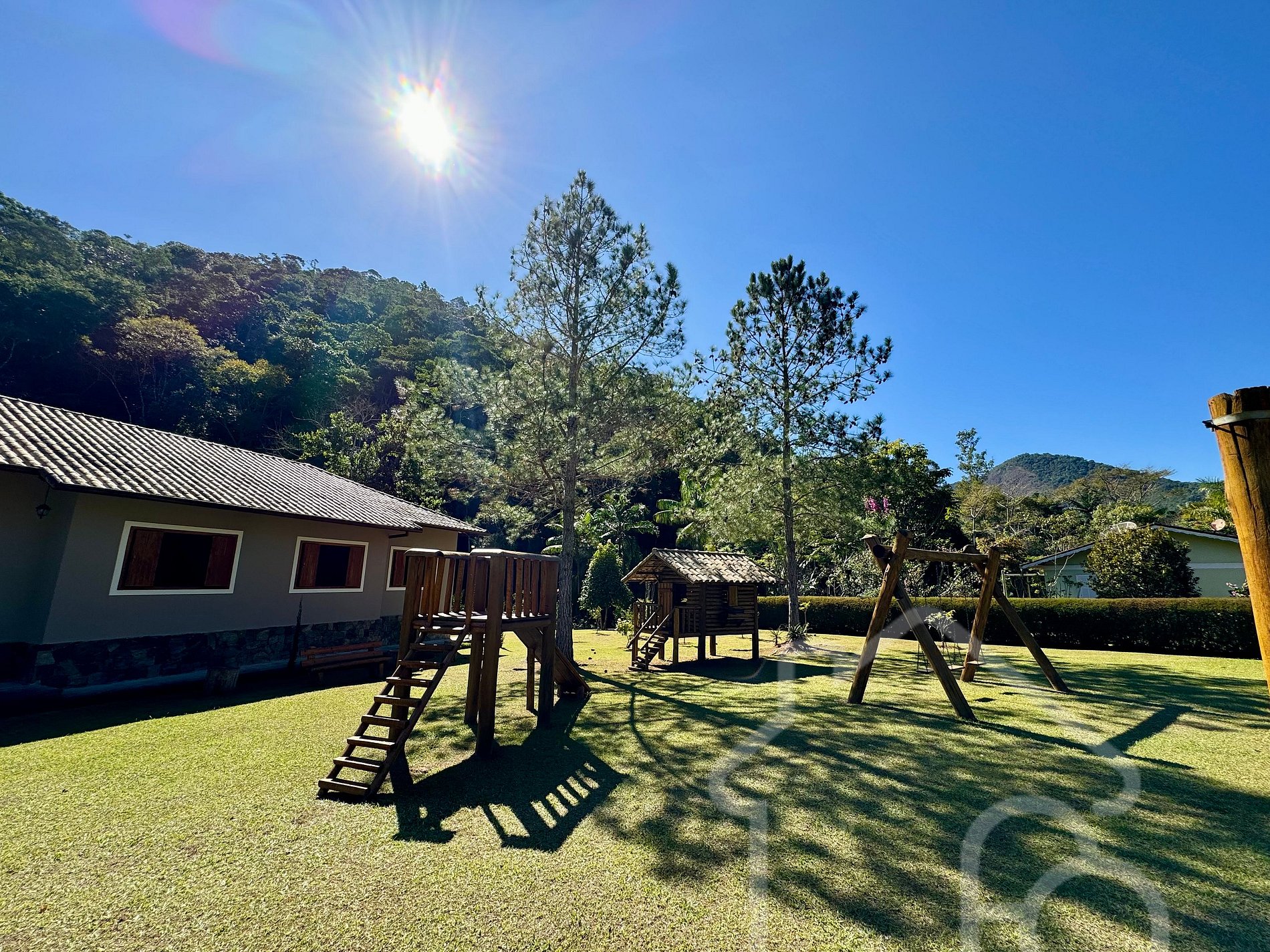 Playground no jardim com casa de madeira para crianças, escorrega e balanço.