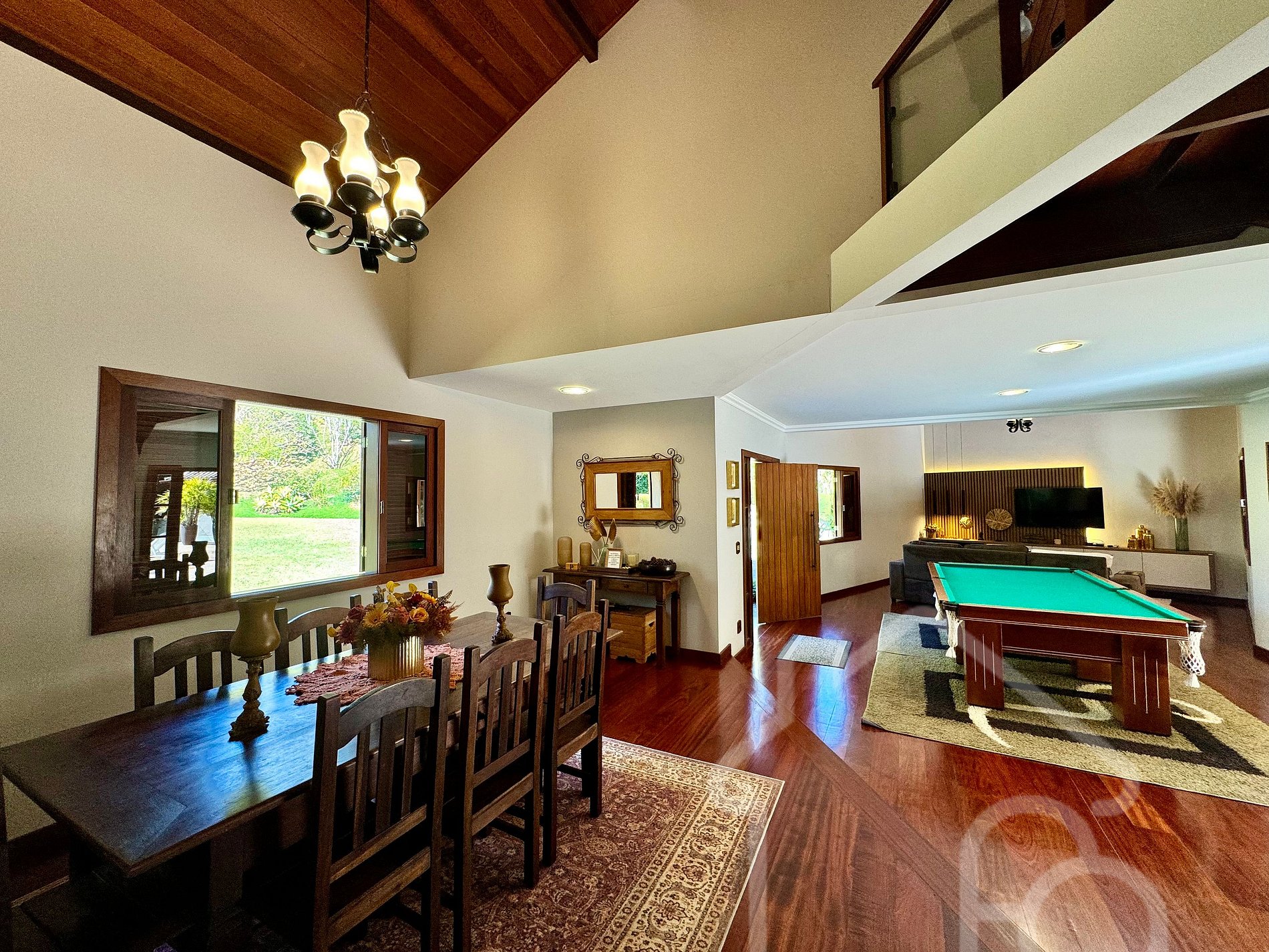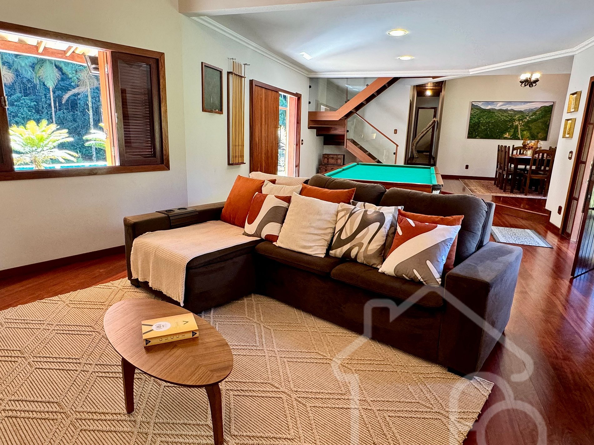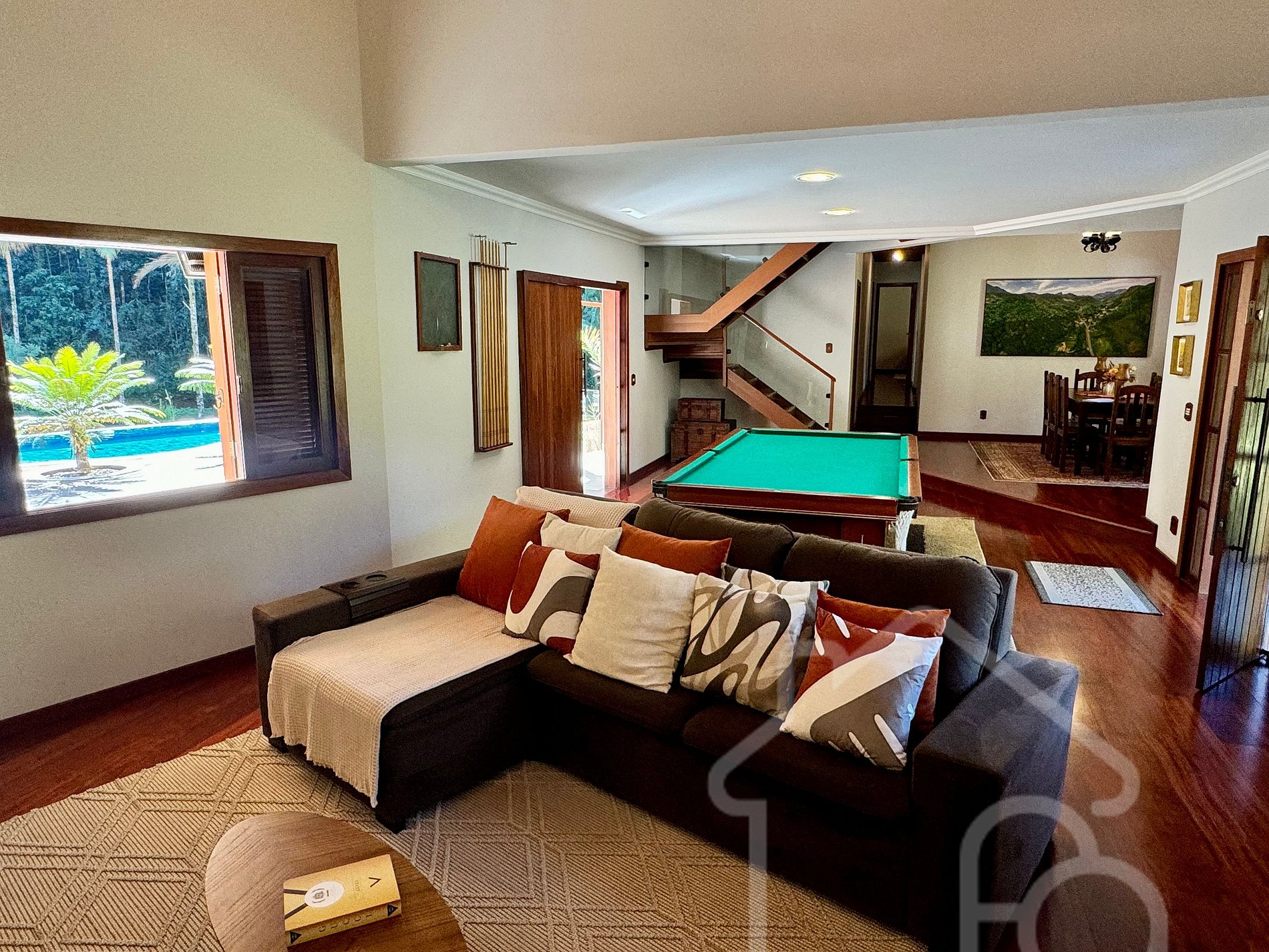Sala de estar integrada com sala de jantar e sinuca.