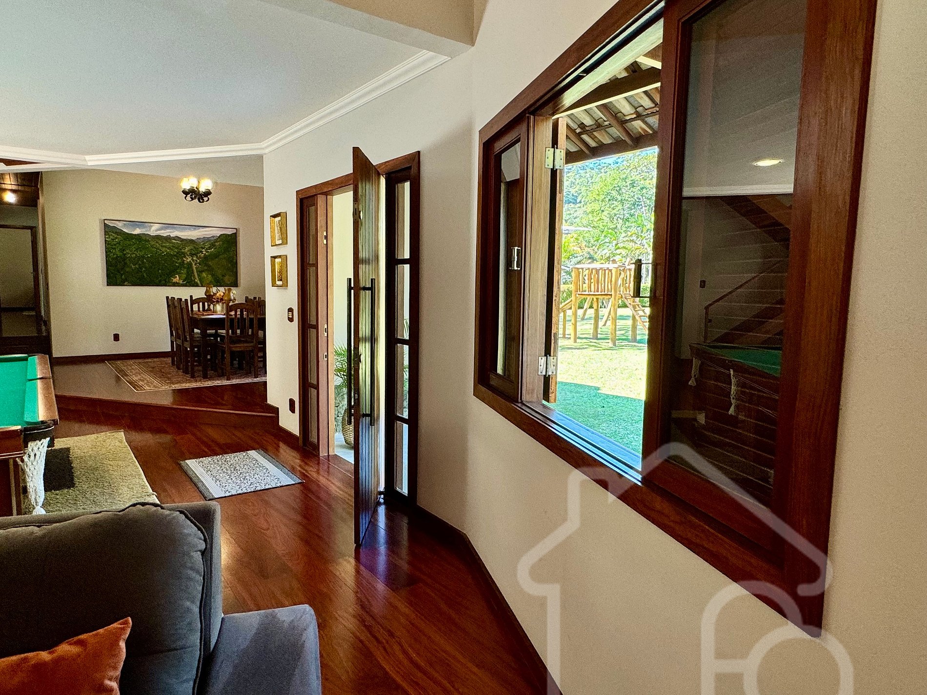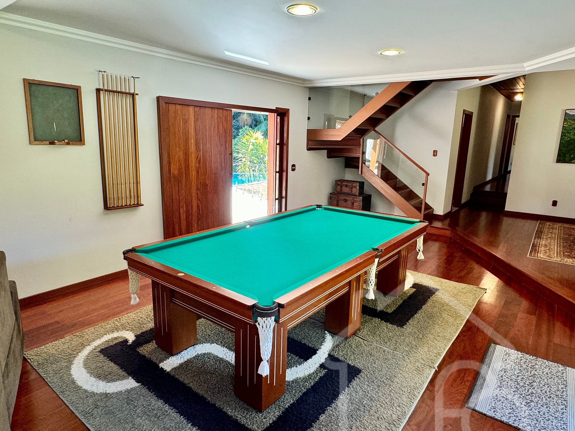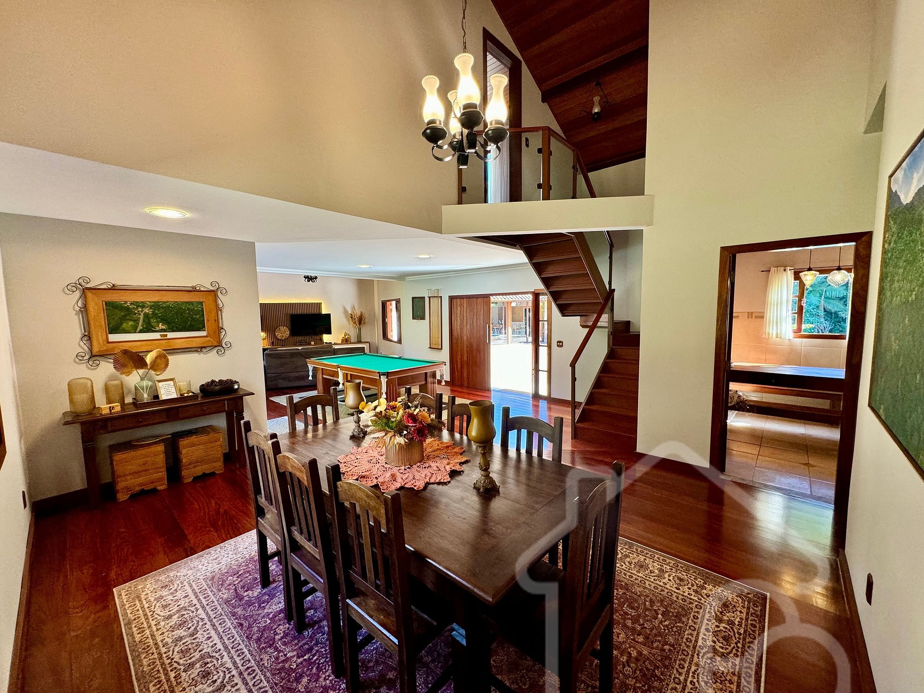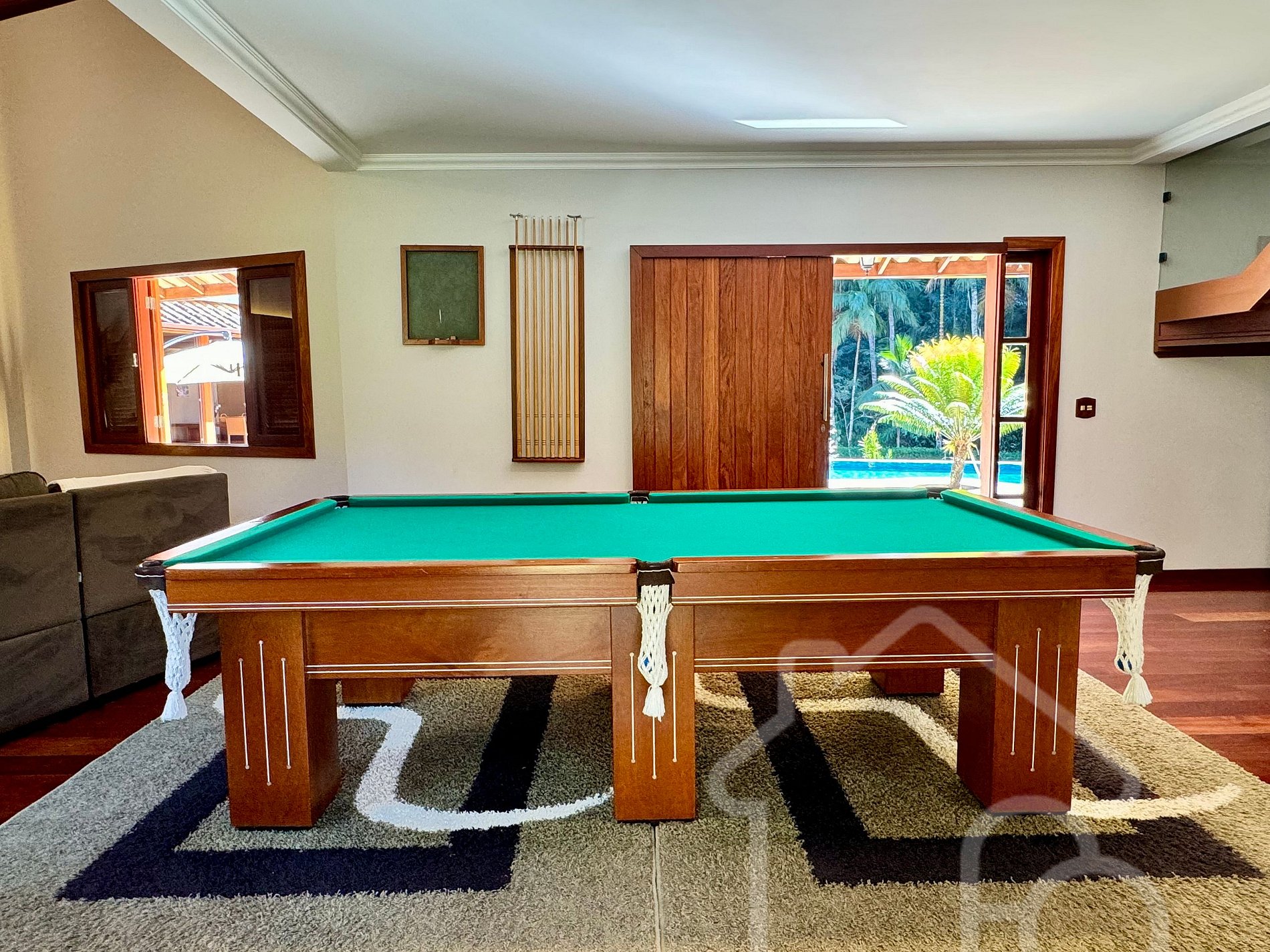 Sala de estar integrada com sala de jantar e sinuca.