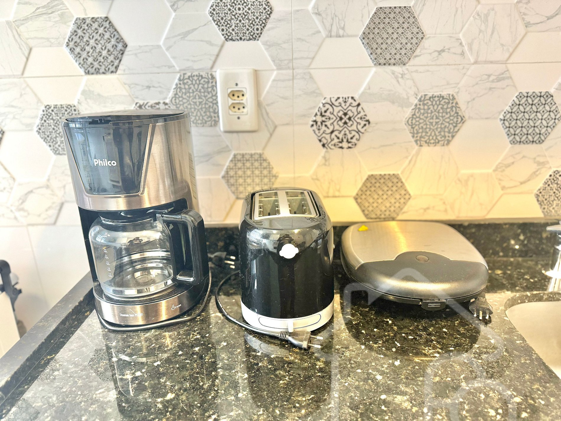 - Cozinha completa equipada com: fogão, forno, geladeira, micro-ondas, sanduicheira, torradeira, cafeteira e utensílios básicos