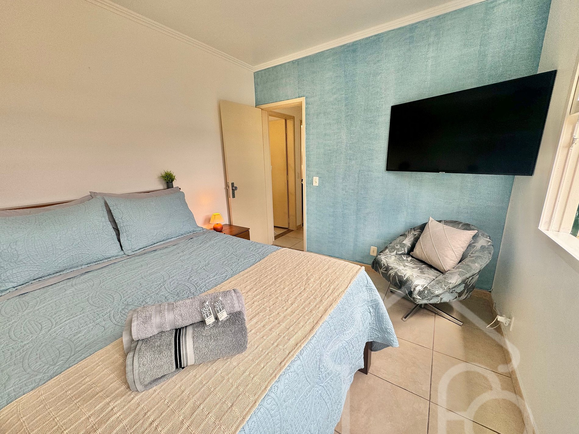- Um quarto com cama de casal, televisão smart, poltrona e guarda-roupa