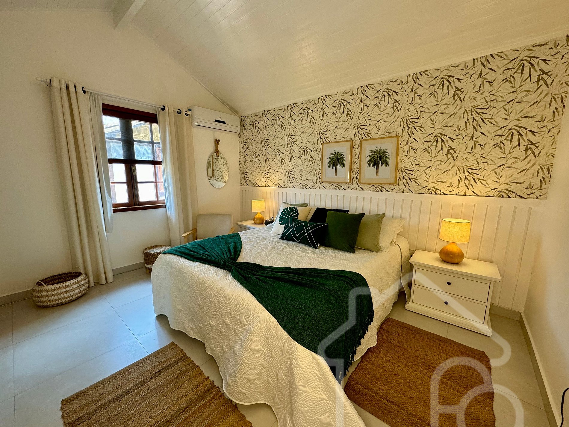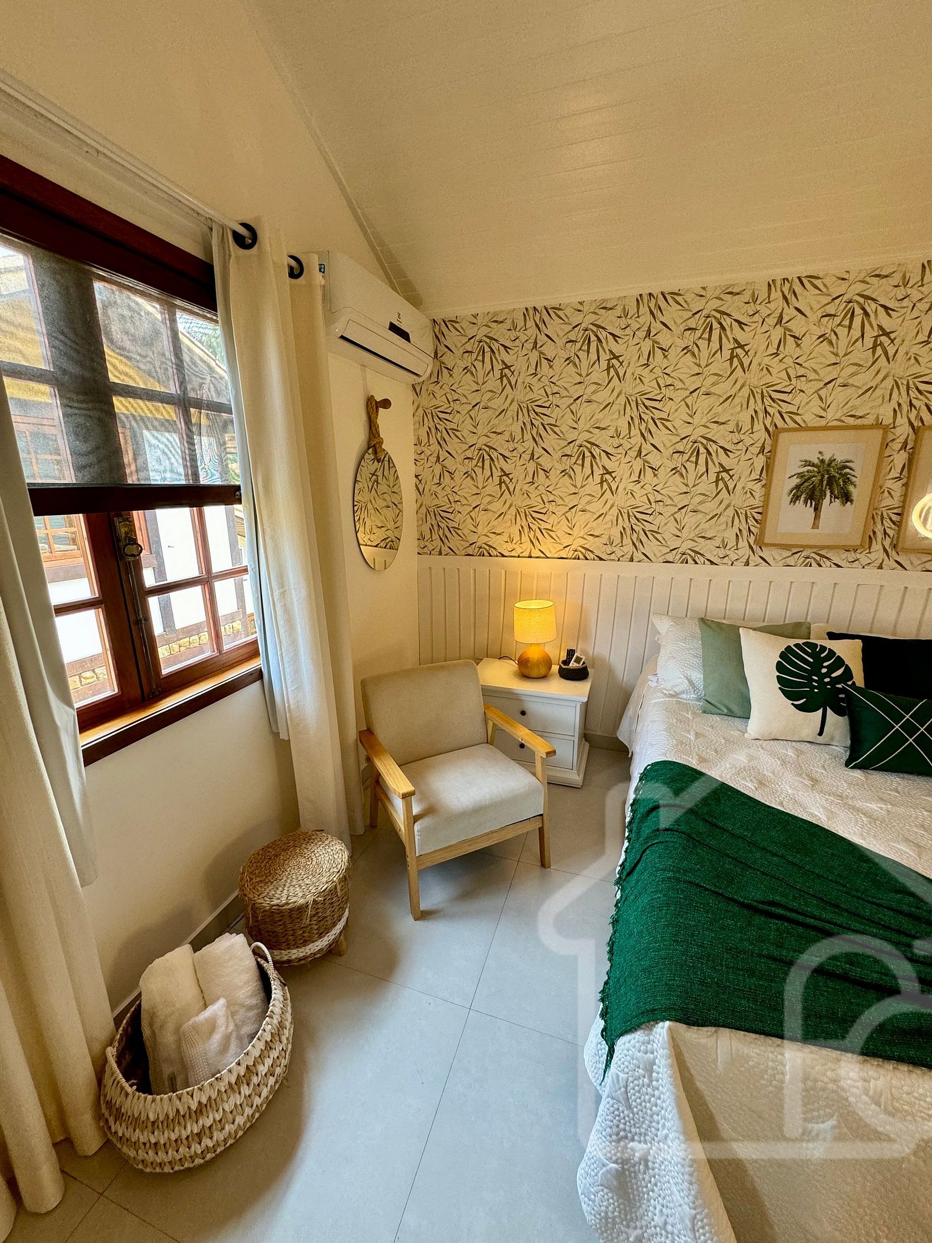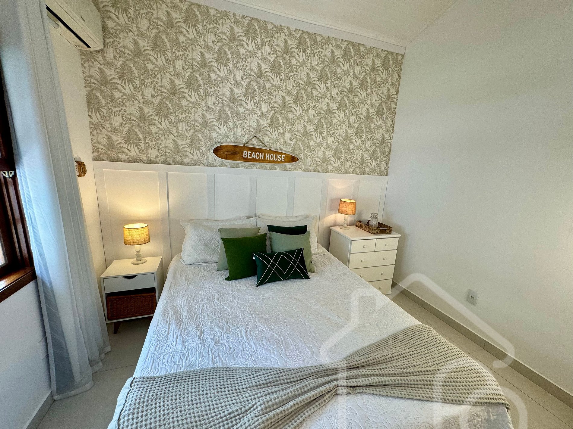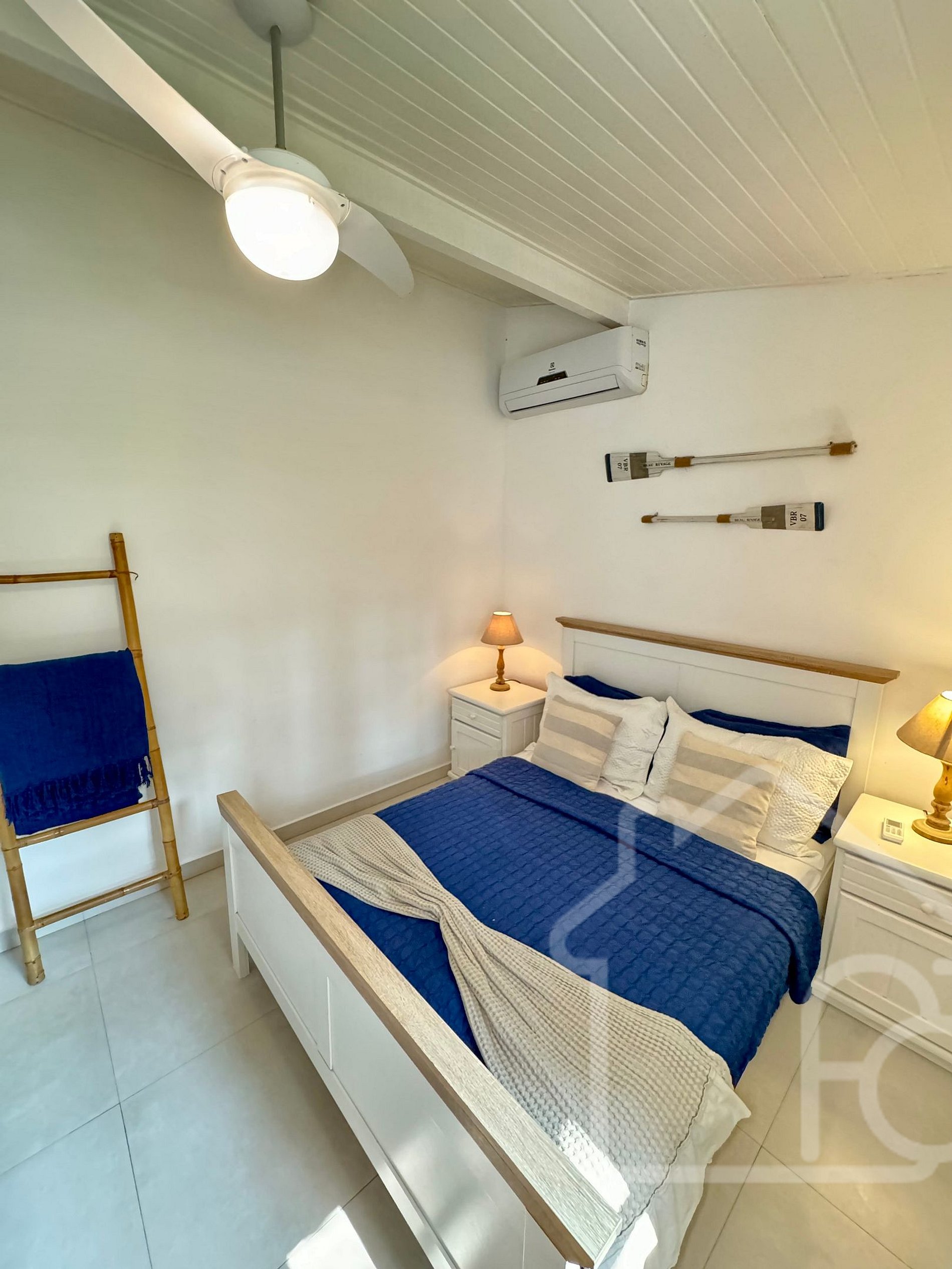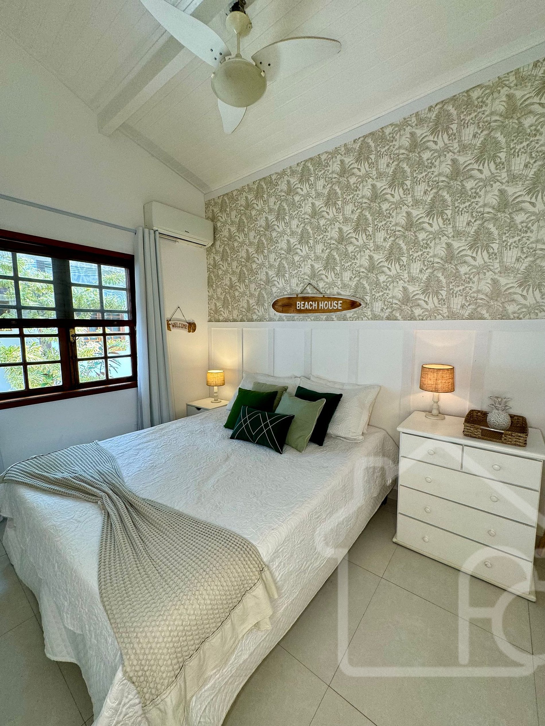 - Quarto 2: Equipado com ar condicionado e ventilador, localizado no primeiro andar, próximo ao banheiro social.