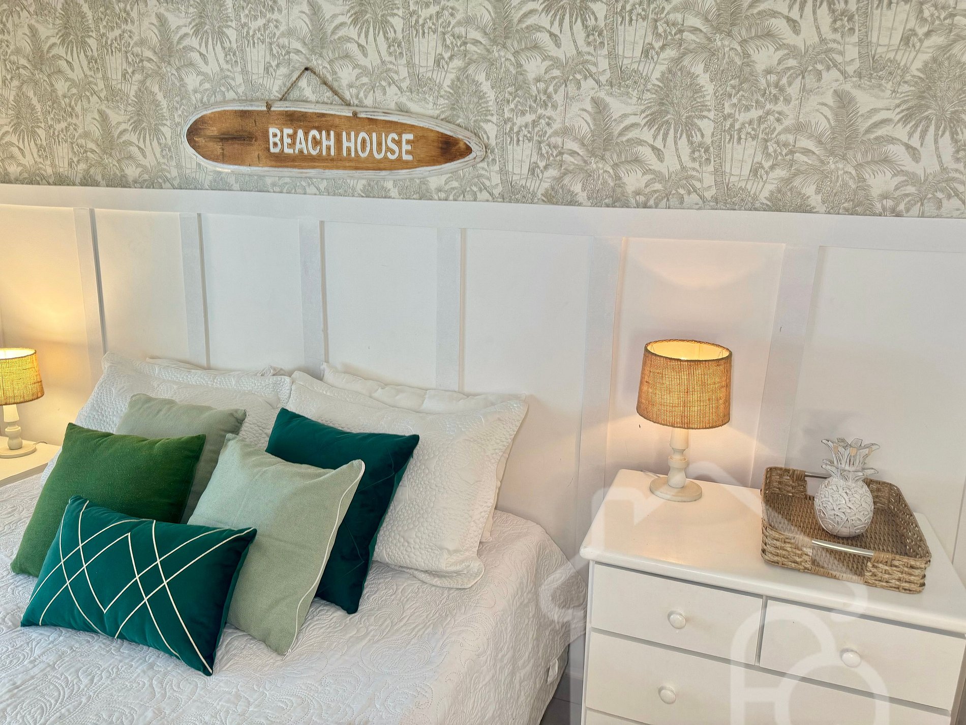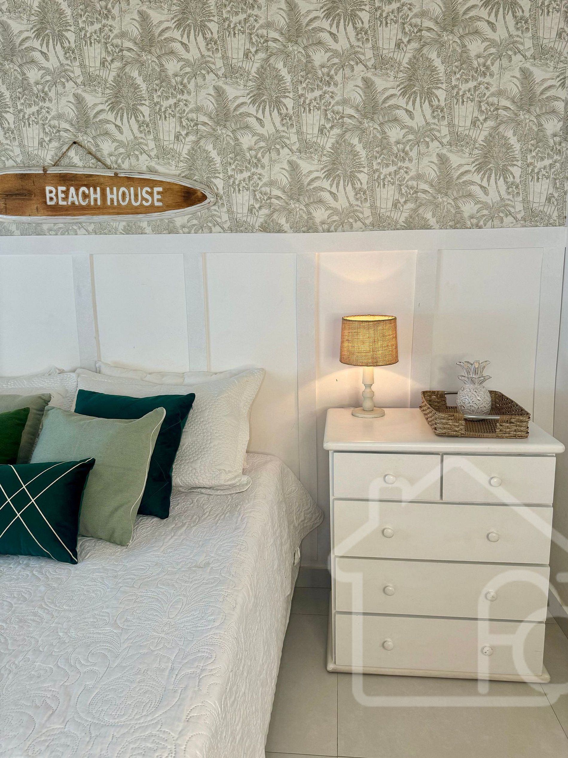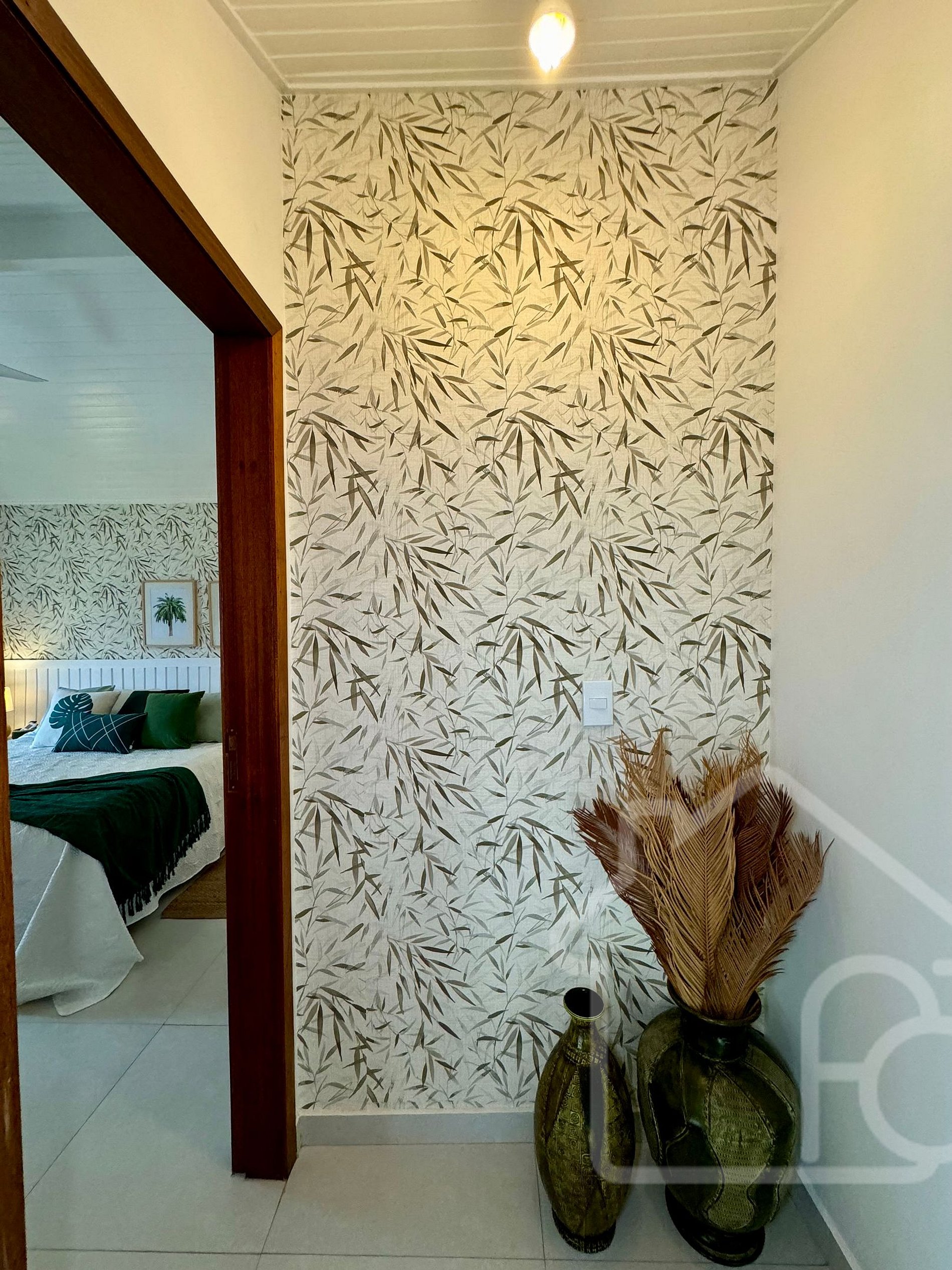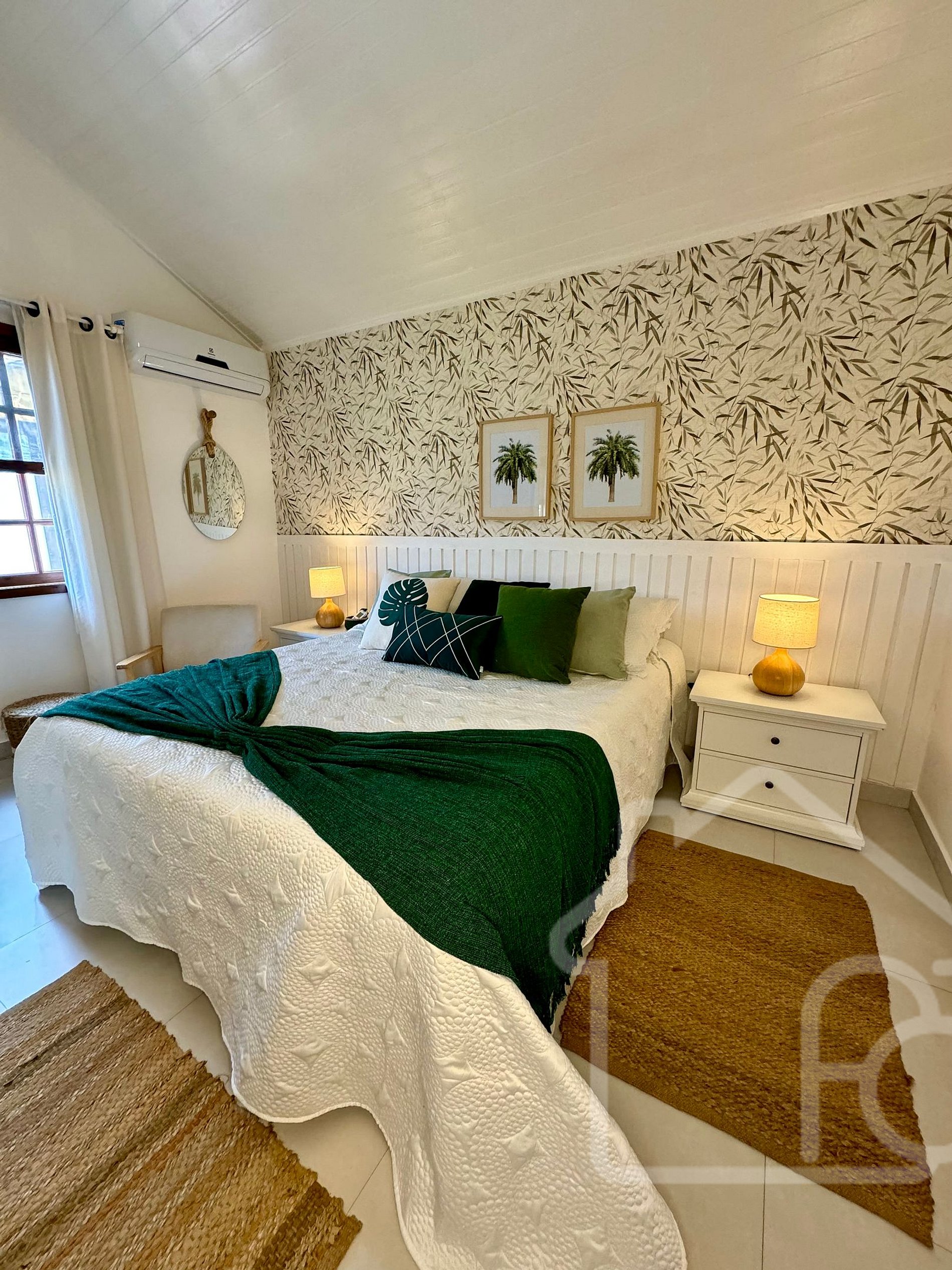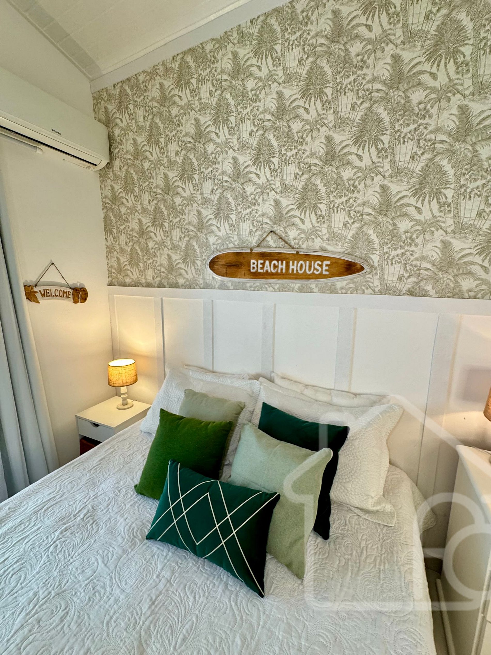 - Quarto 2: Equipado com ar condicionado e ventilador, localizado no primeiro andar, próximo ao banheiro social.