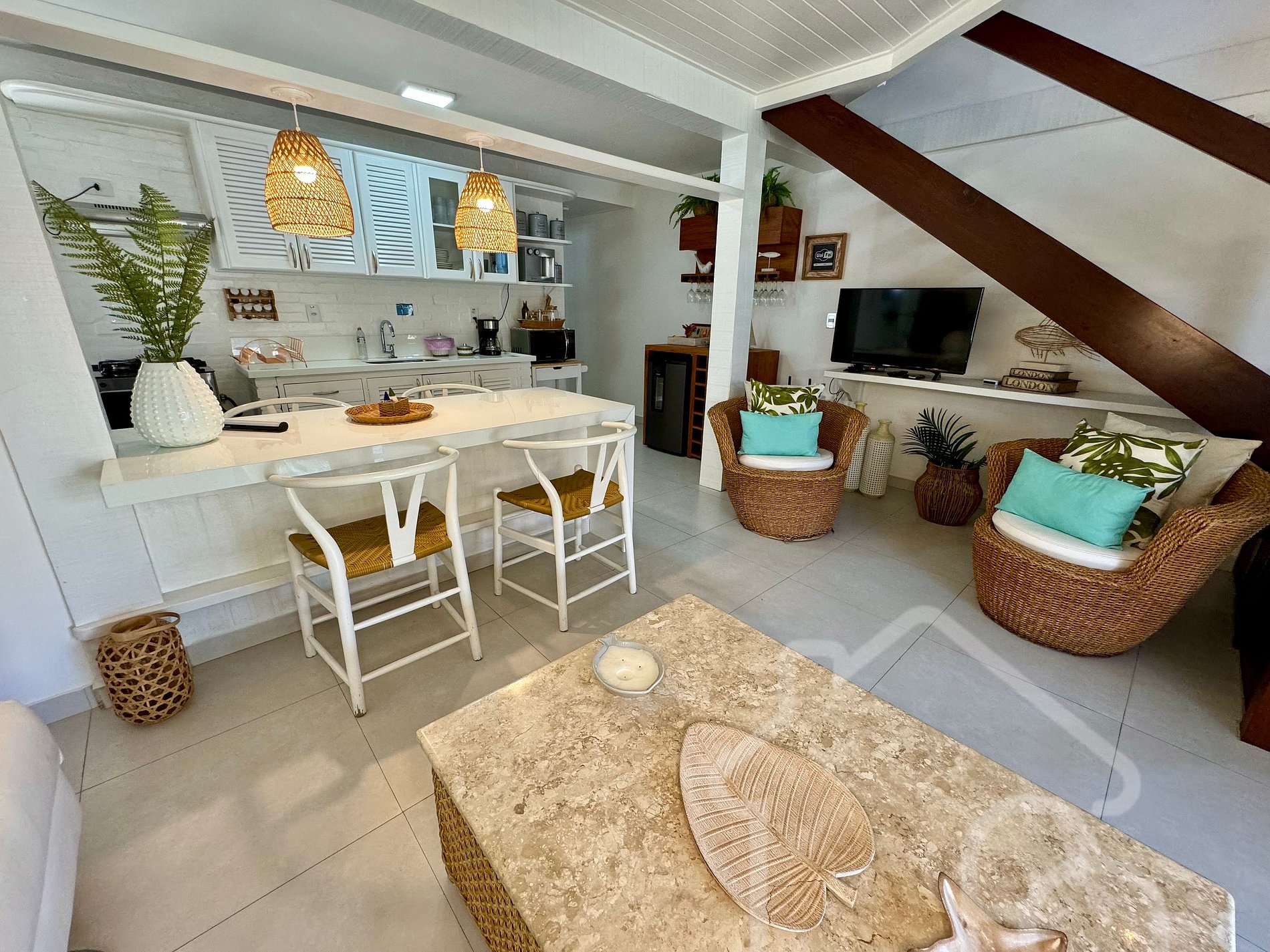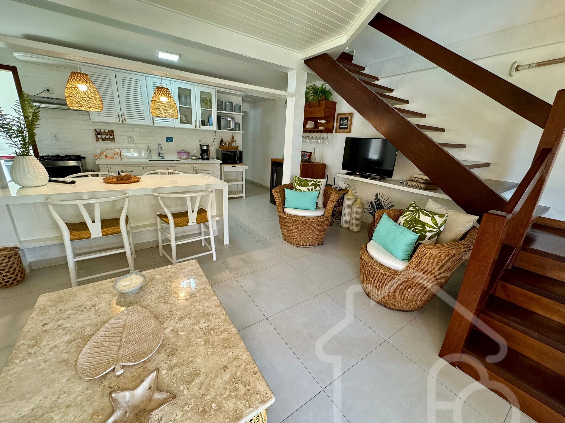 - Sala de Estar: Ambiente integrado com a cozinha. Mobiliário confortável e área de estar acolhedora.