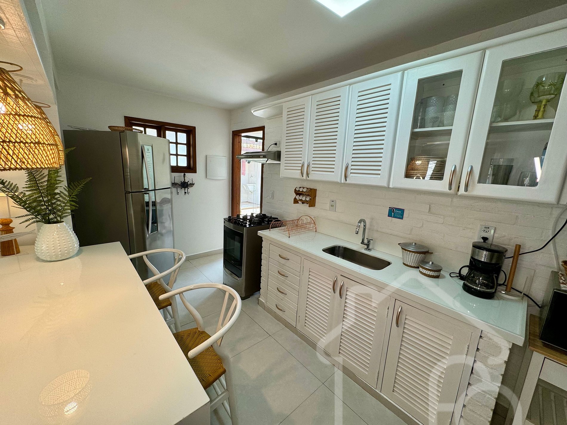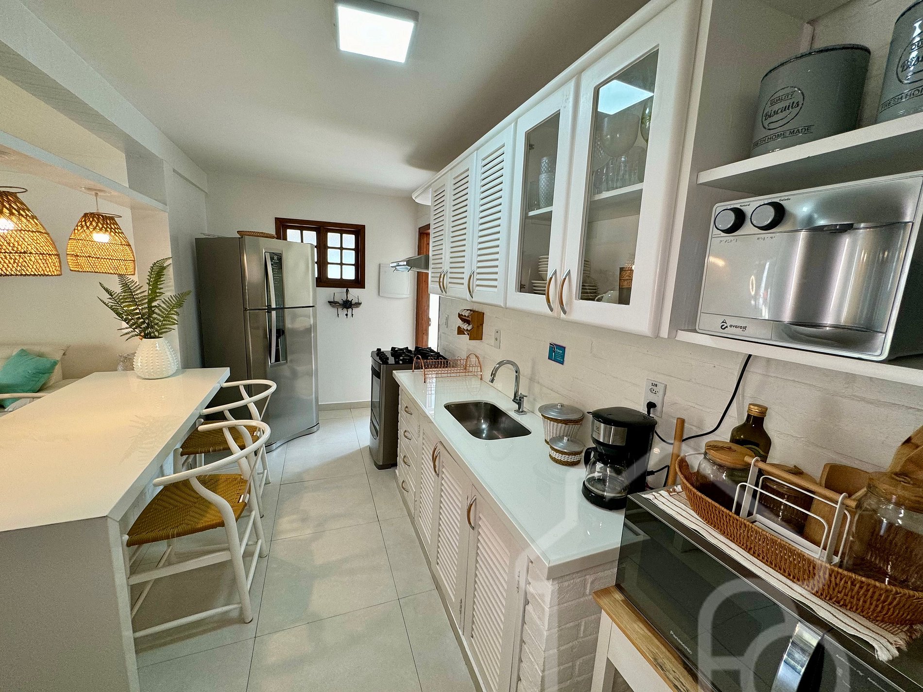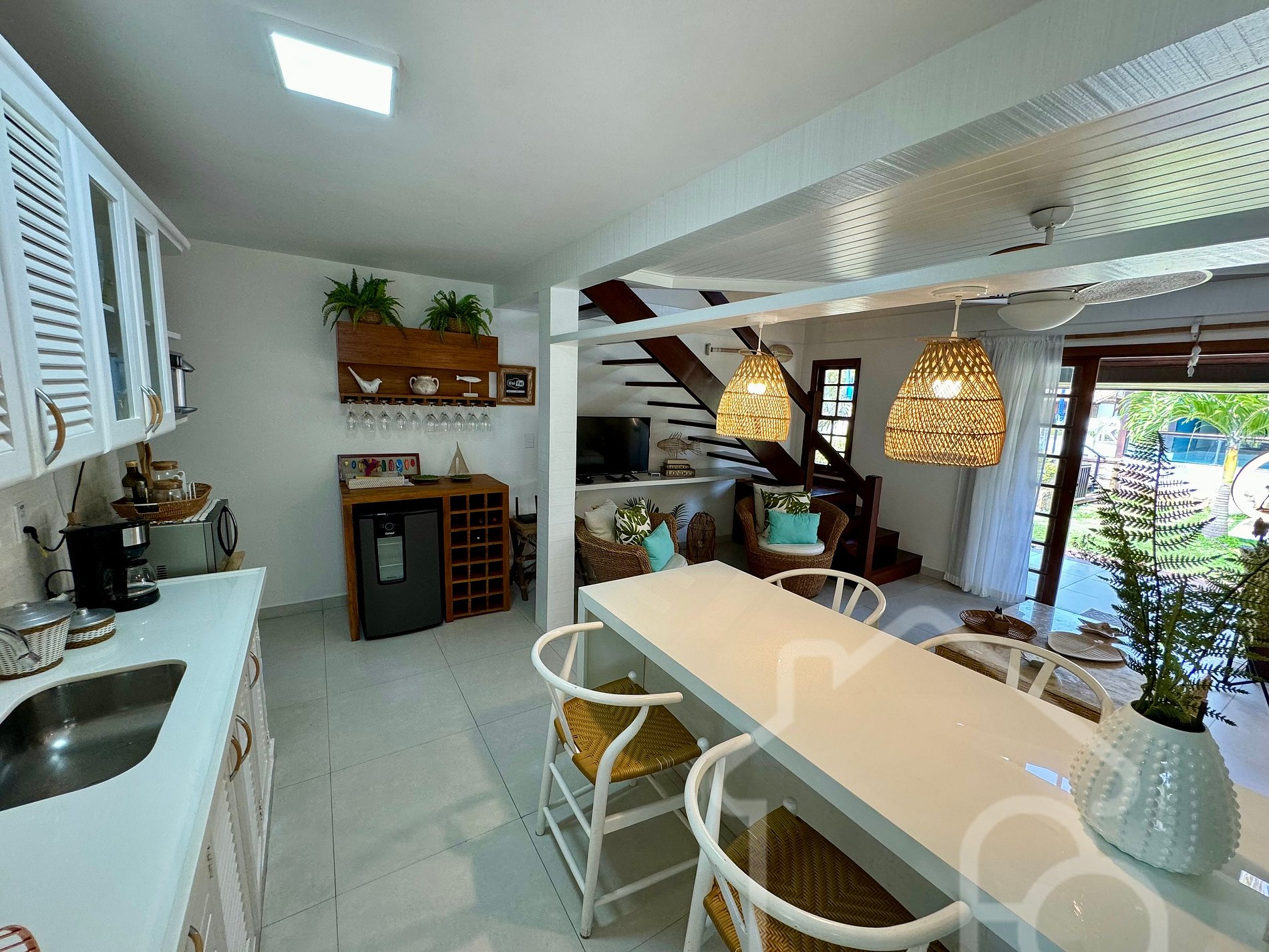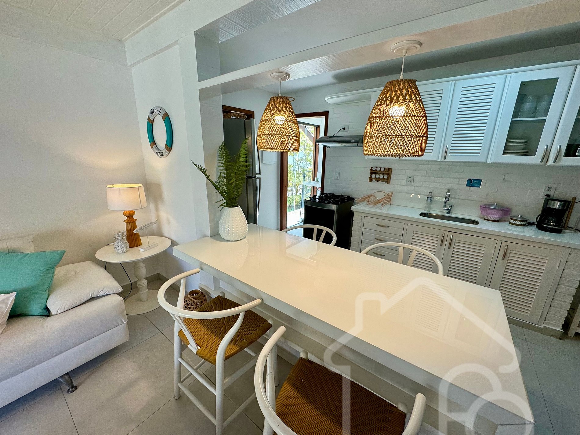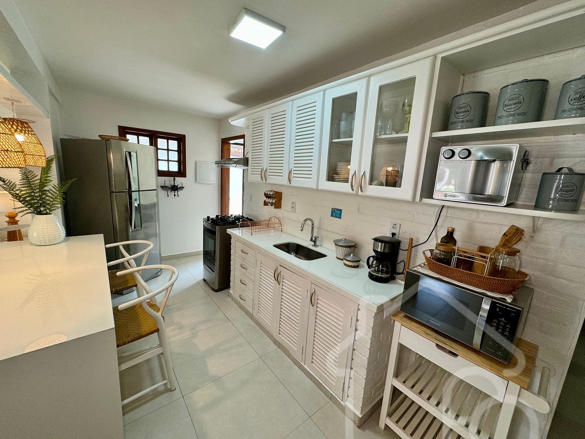 - Cozinha: Cozinha americana completa com sanduicheira, air fryer, forno e utensílios essenciais, integrada à sala de estar.