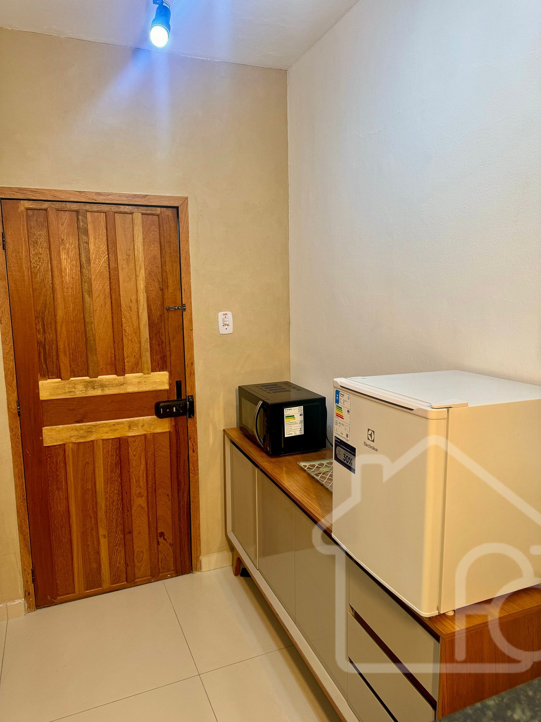 - Cozinha compacta equipada com air fryer, micro-ondas, frigobar, cafeteira elétrica e utensílios essenciais para preparar suas refeições;
