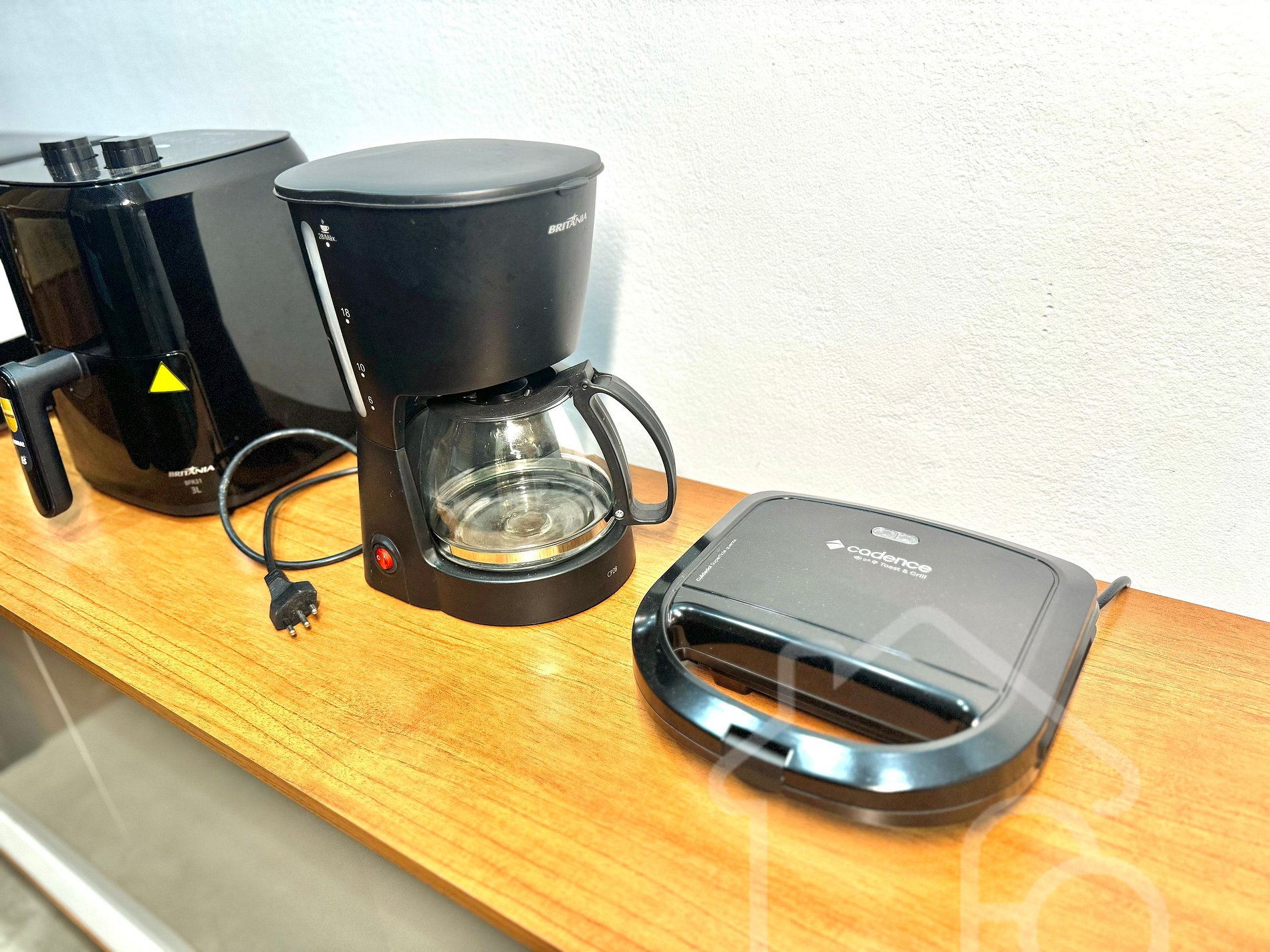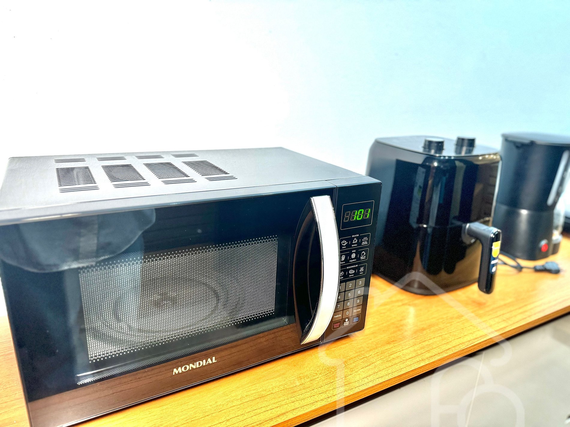 - Cozinha compacta equipada com air fryer, micro-ondas, frigobar, cafeteira elétrica e utensílios essenciais para preparar suas refeições;