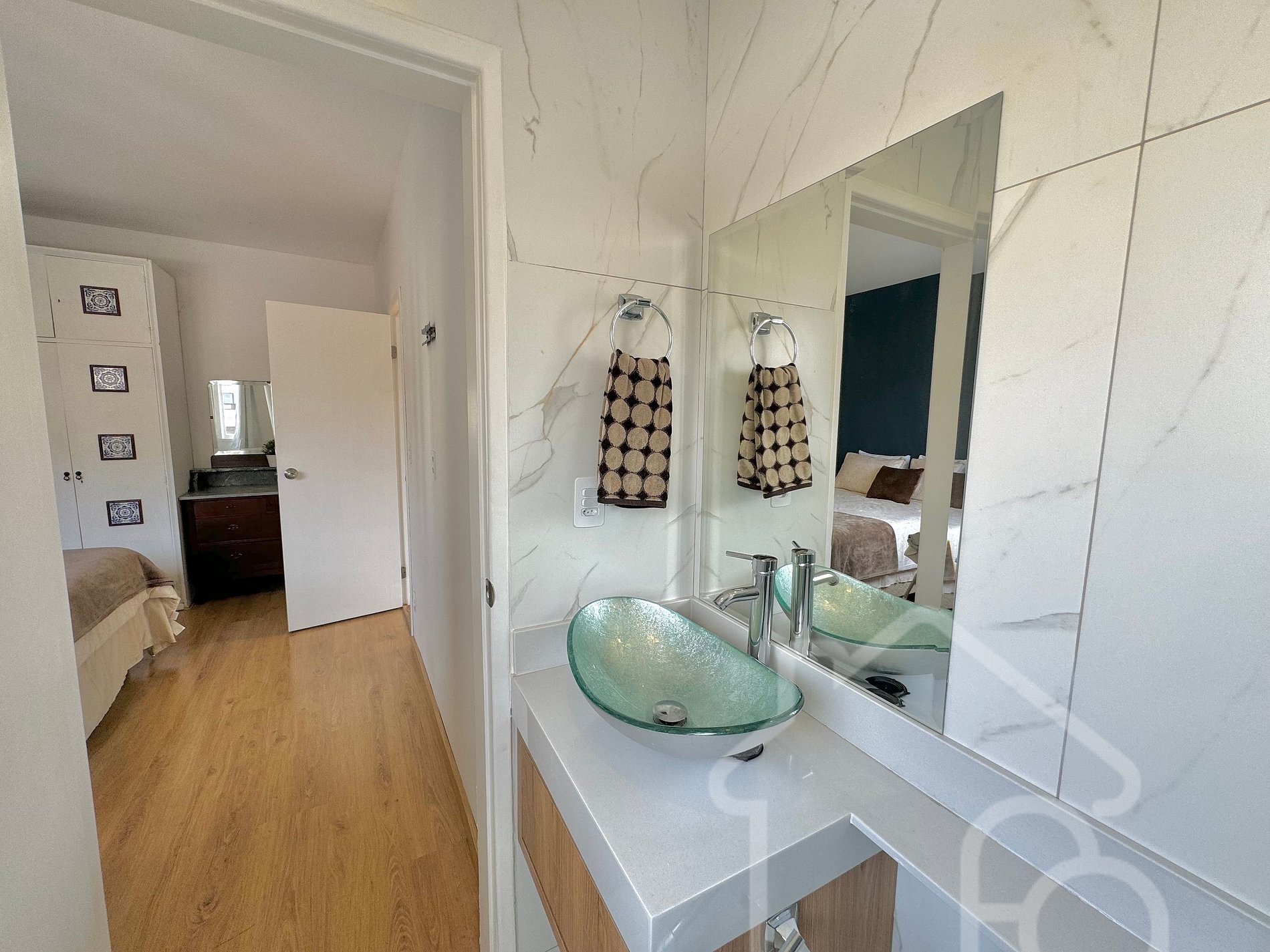 - Suíte com cama queen e banheiro moderno;
