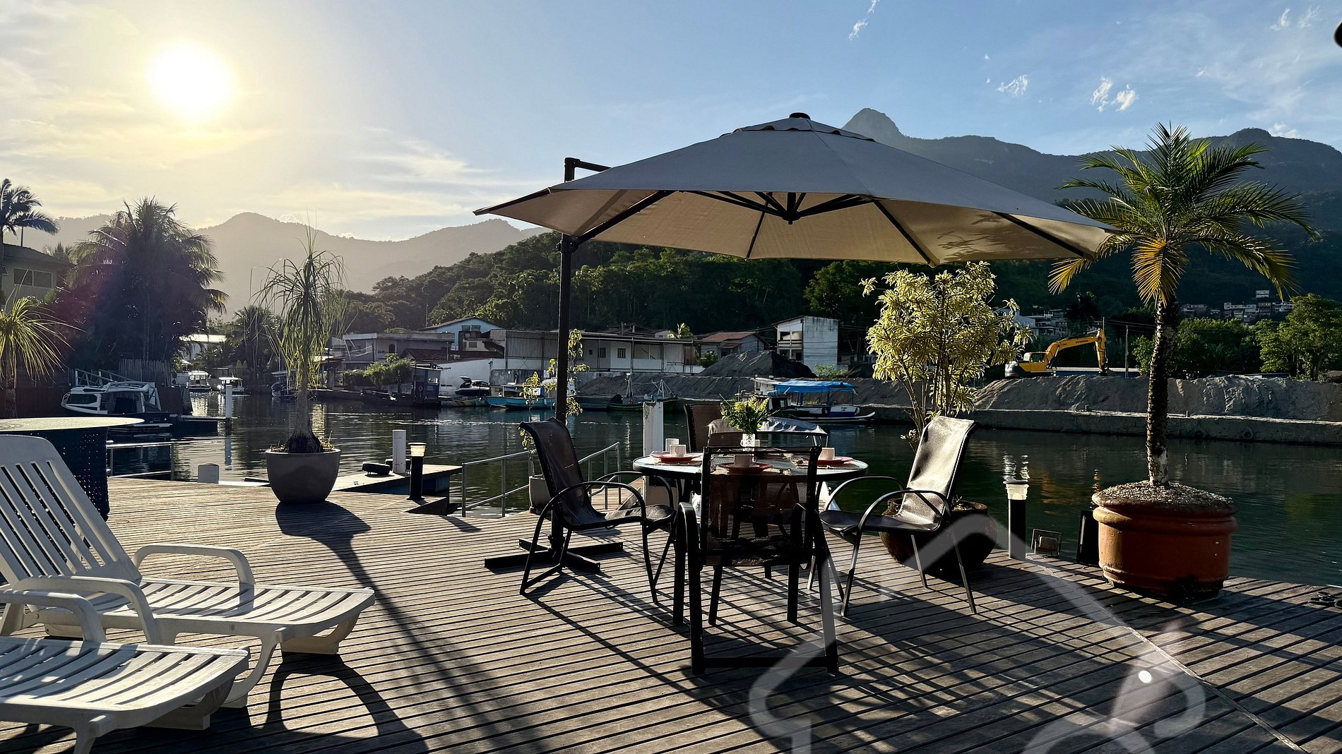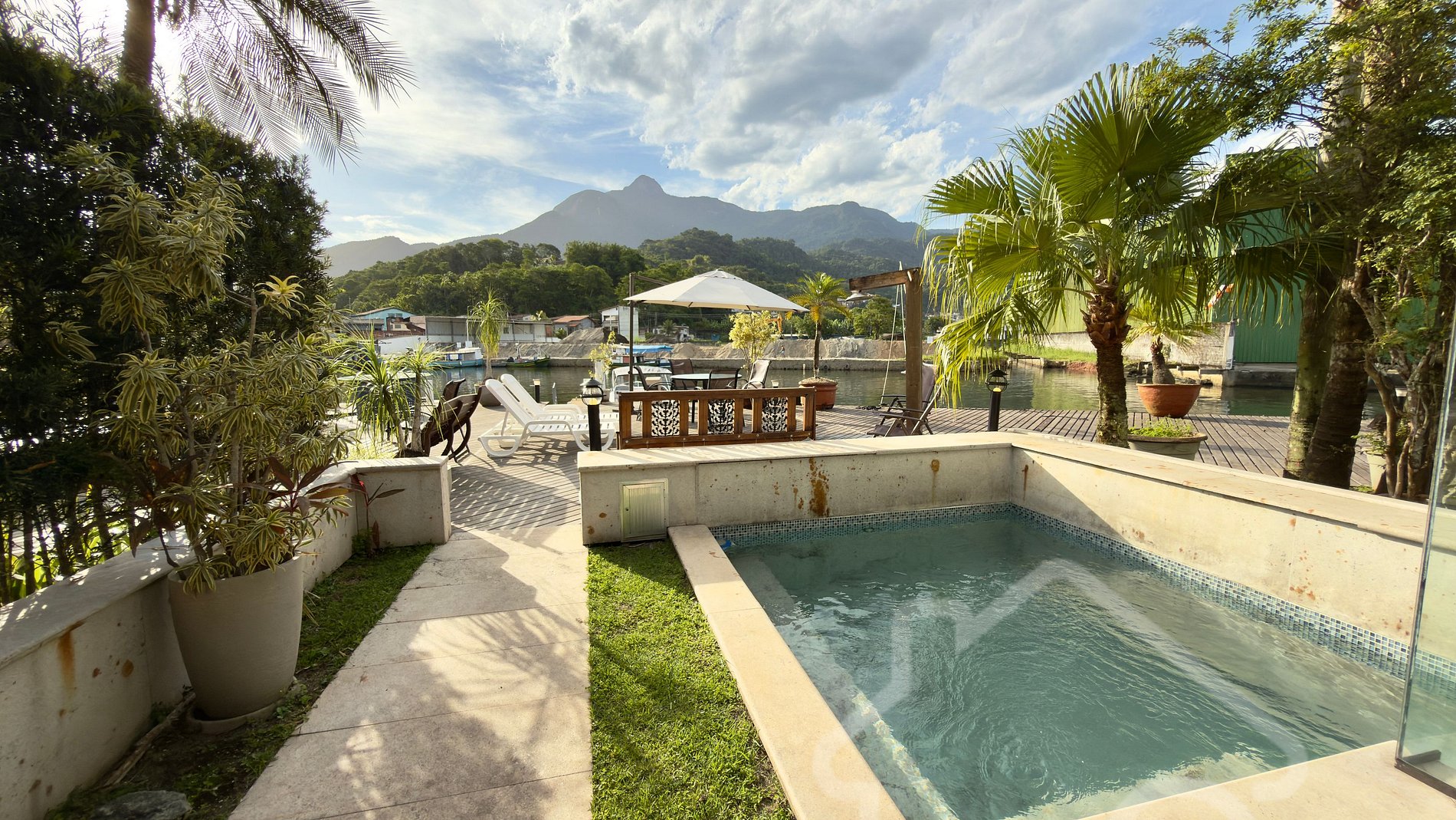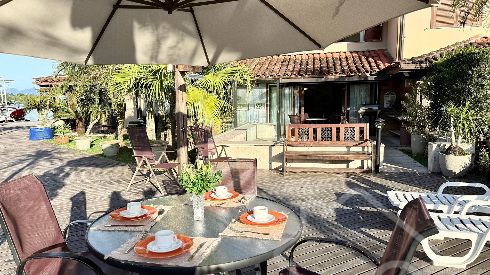 - Área externa deslumbrante com deck, mesa, ombrelone, espreguiçadeiras e chuveirão