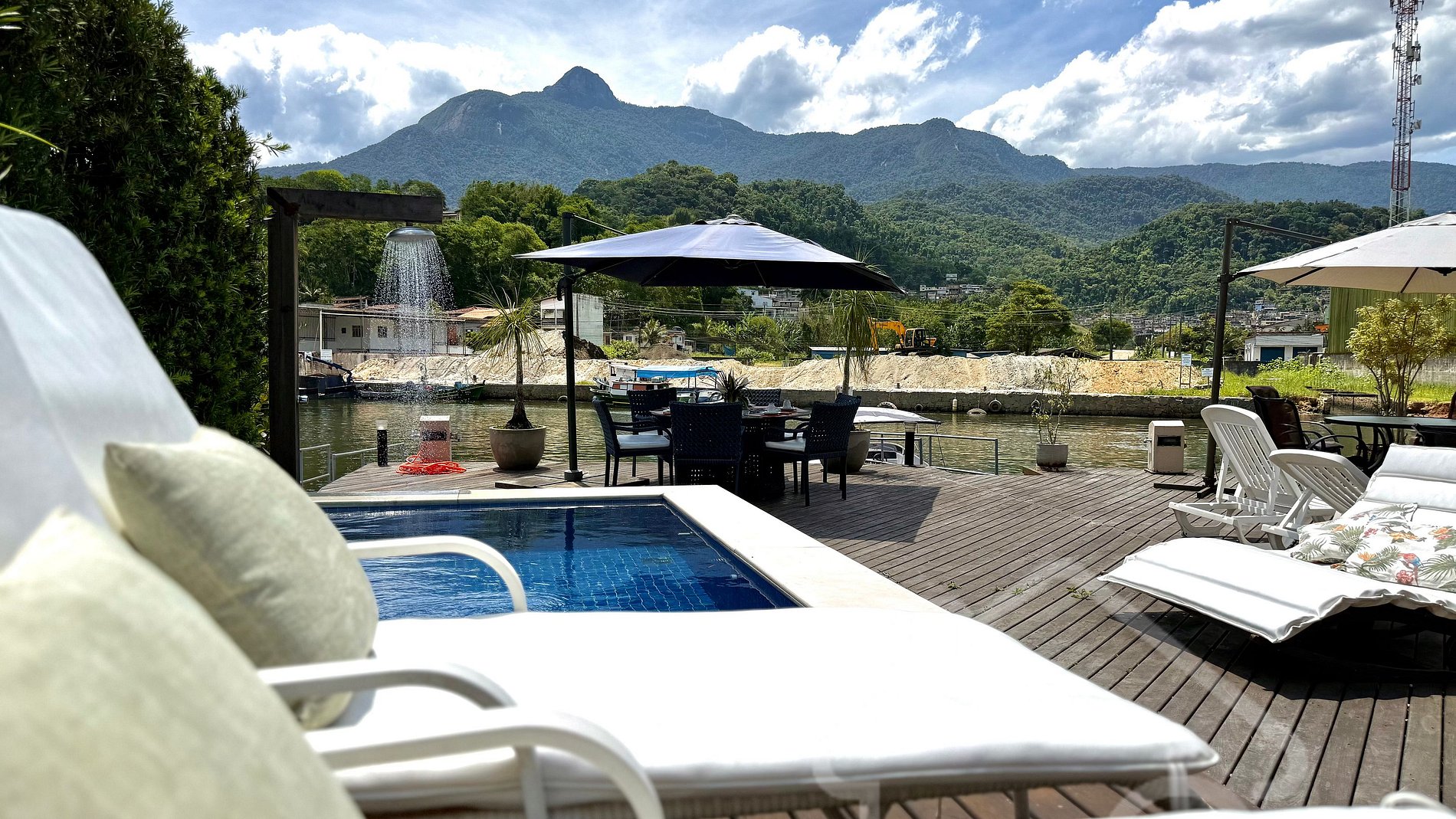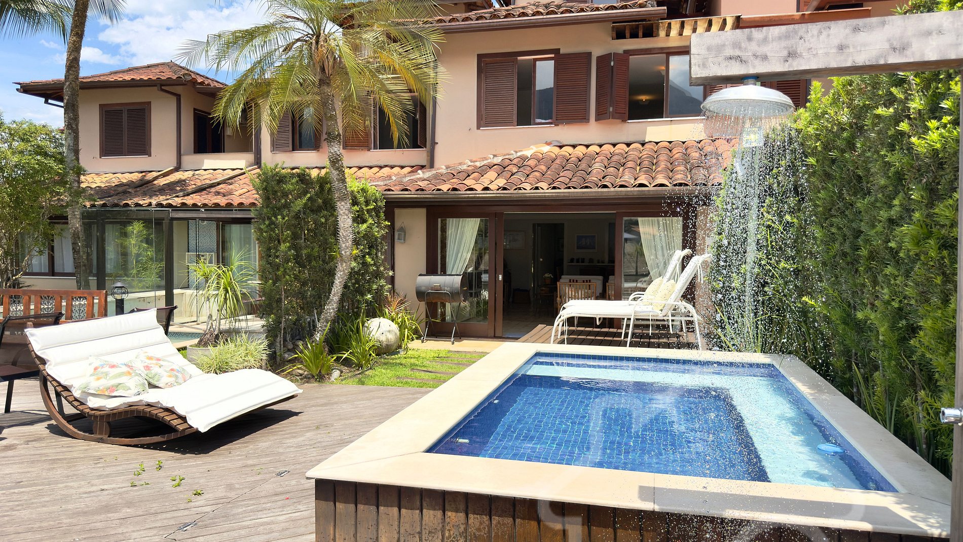 - Área externa deslumbrante com deck, mesa, ombrelone, espreguiçadeiras e chuveirão