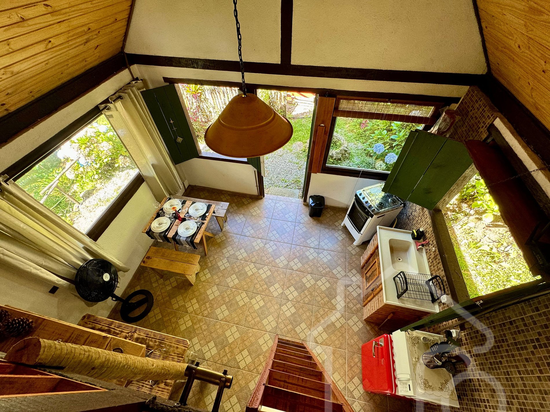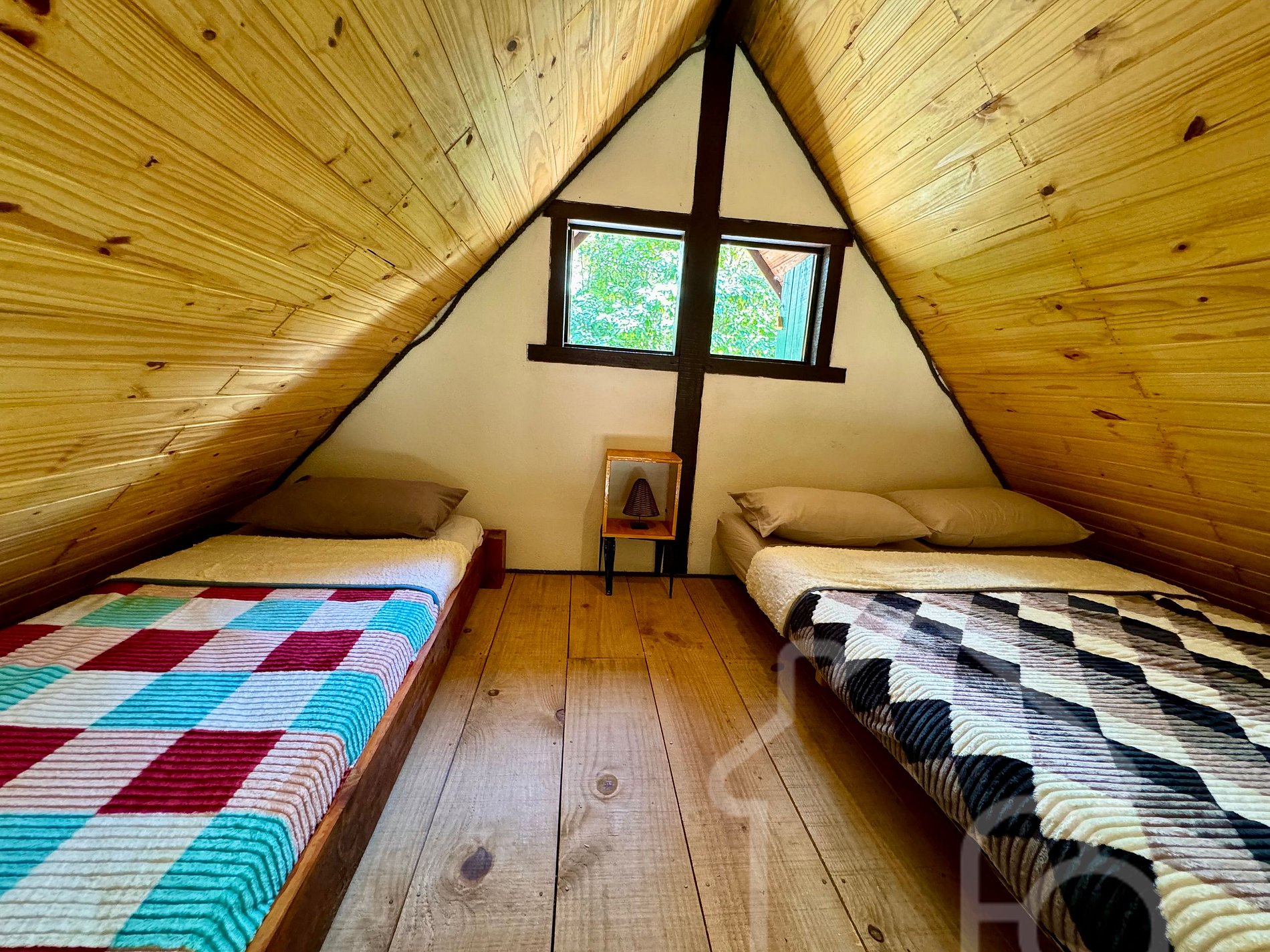 O térreo abriga uma sala de estar integrada à cozinha, uma cama de casal e um banheiro social. No andar superior, há mais uma cama de casal e uma cama de solteiro, garantindo espaço e conforto para todos.