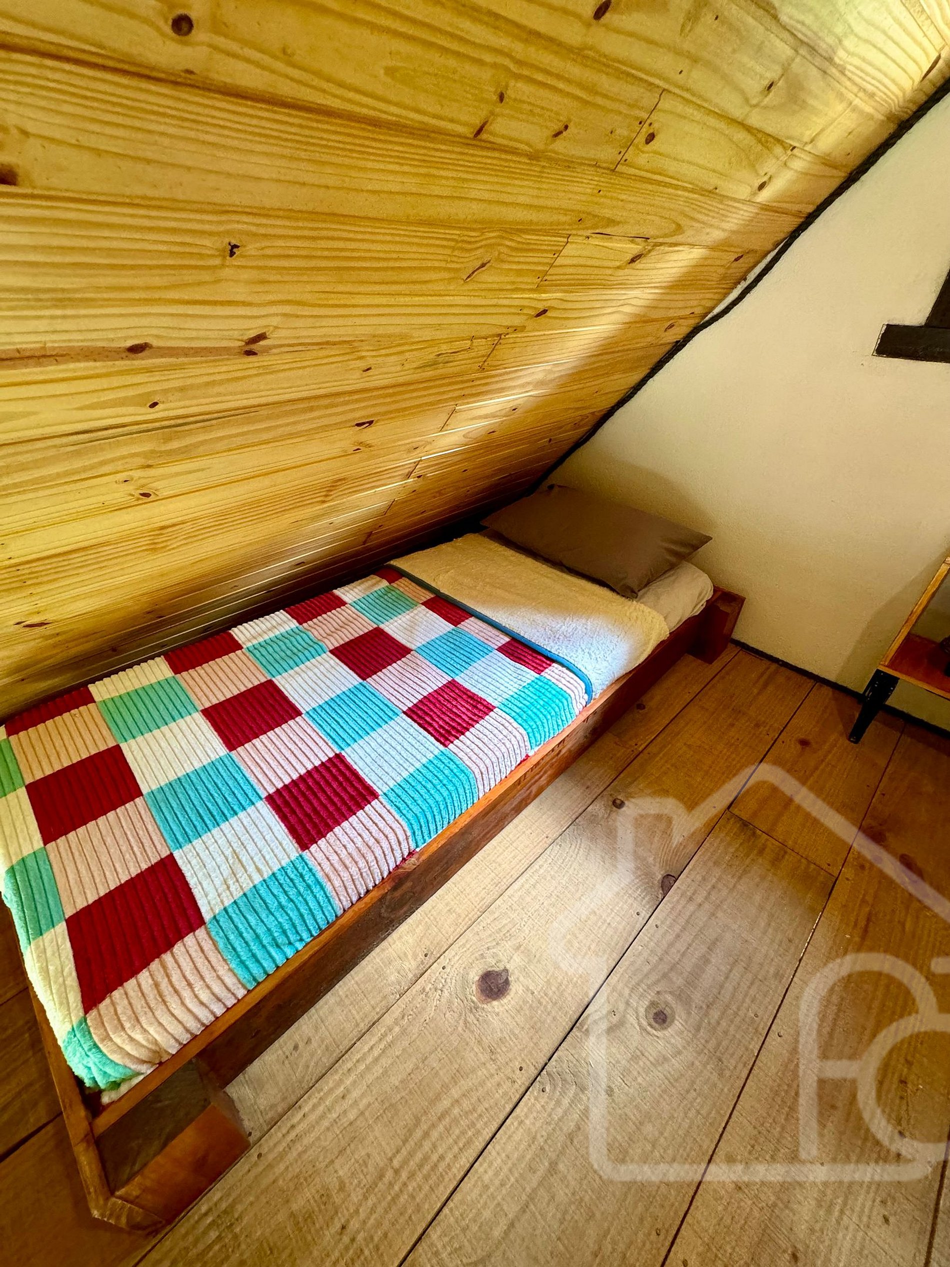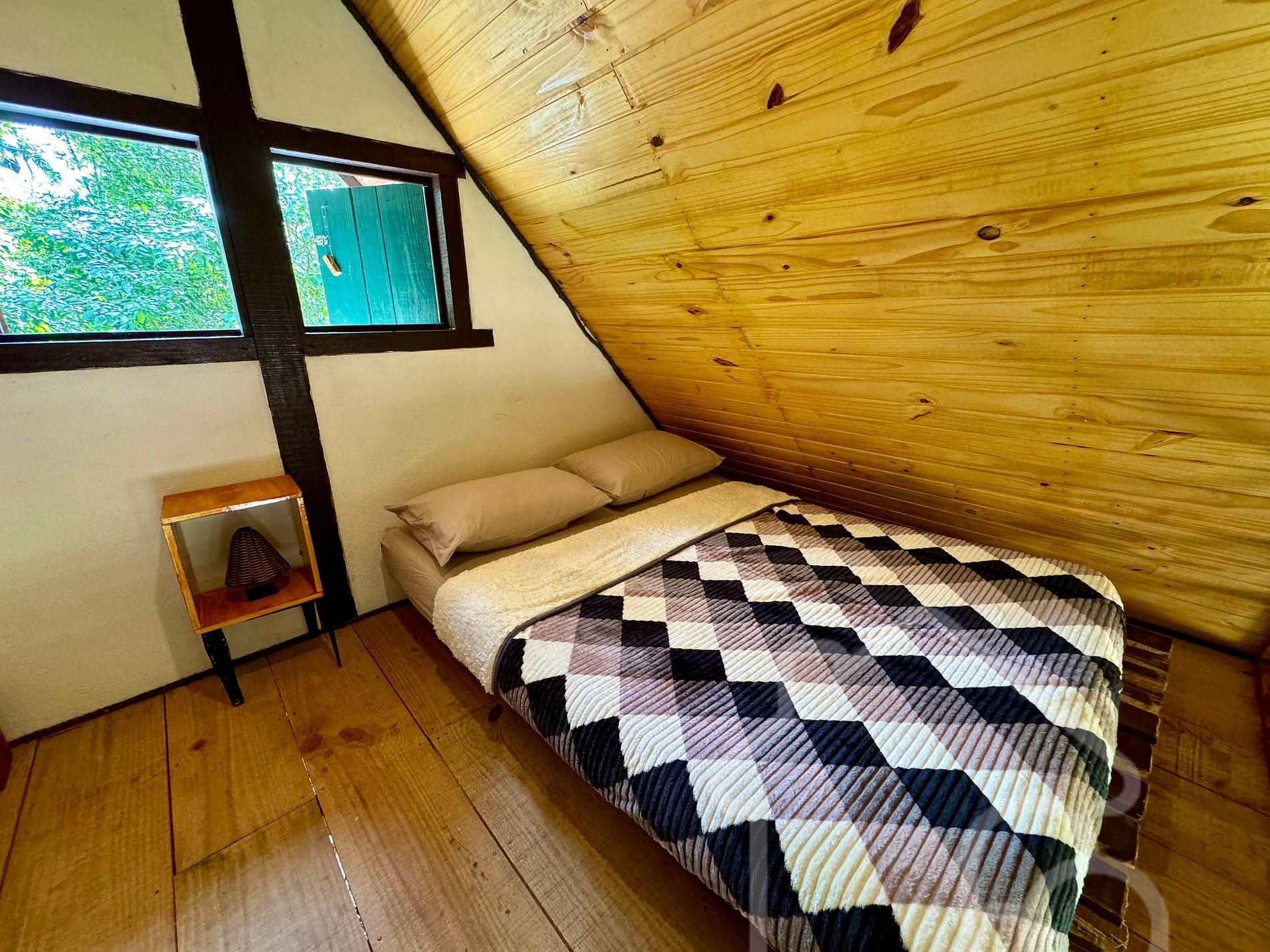 O térreo abriga uma sala de estar integrada à cozinha, uma cama de casal e um banheiro social. No andar superior, há mais uma cama de casal e uma cama de solteiro, garantindo espaço e conforto para todos.