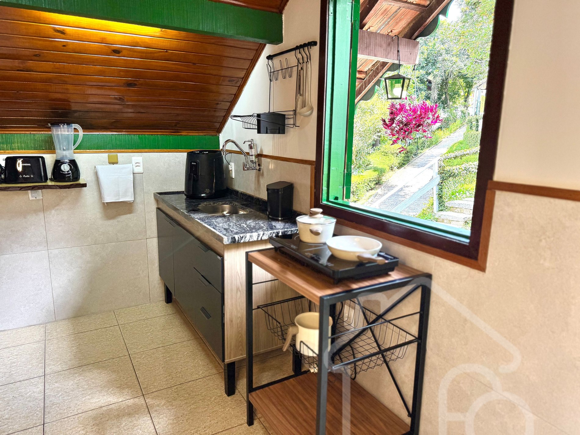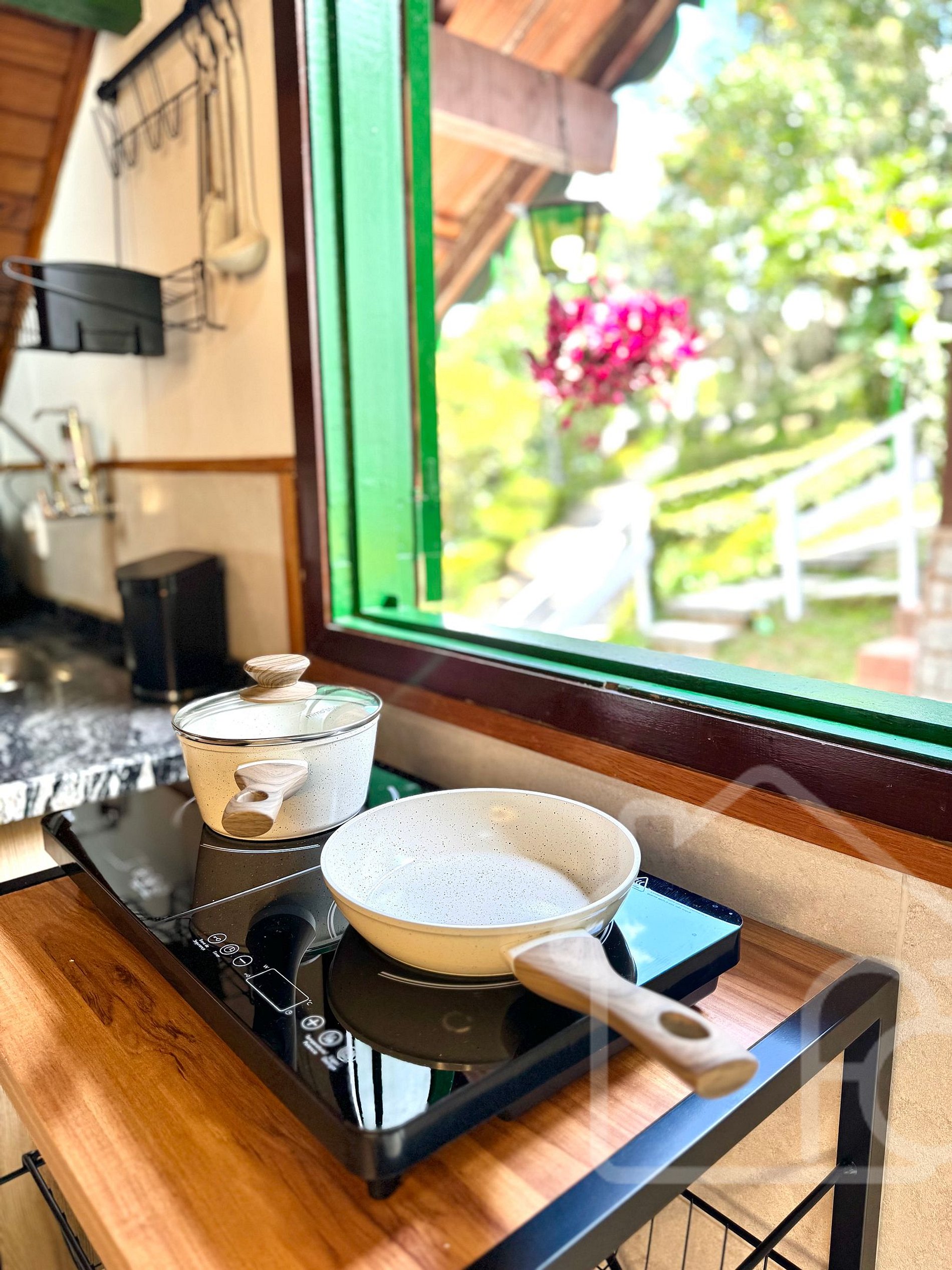 Cozinha completa com micro-ondas, frigobar, cafeteira, airfryer, fogão de indução portátil (2 bocas) e utensílios essenciais.