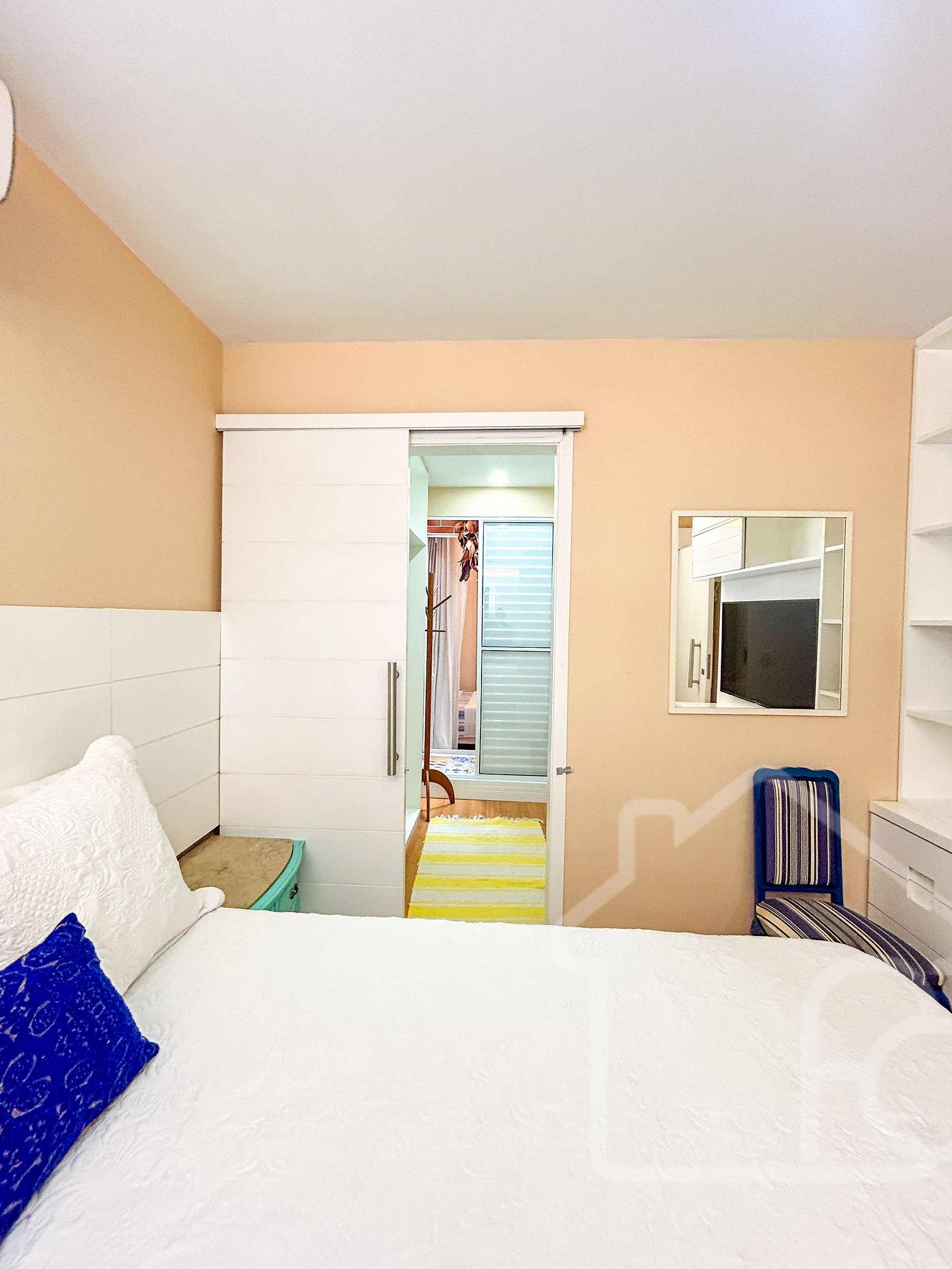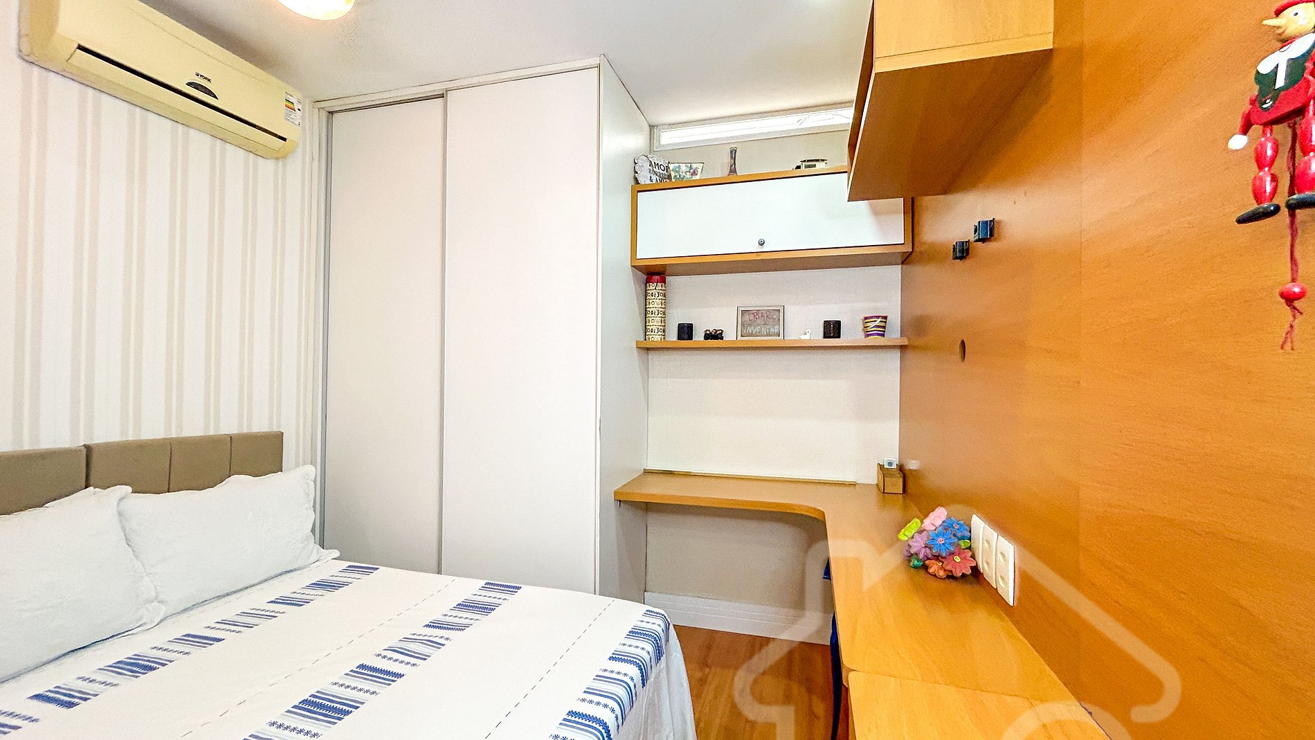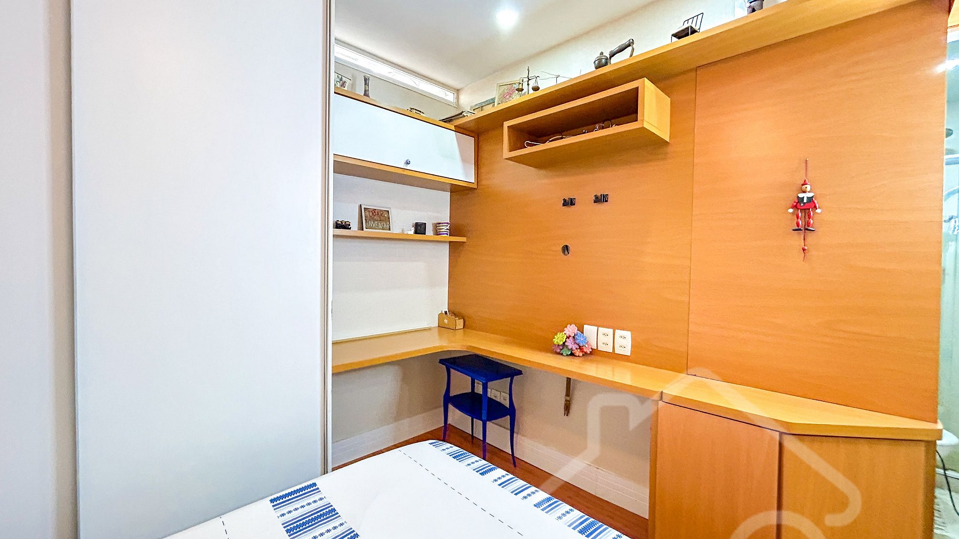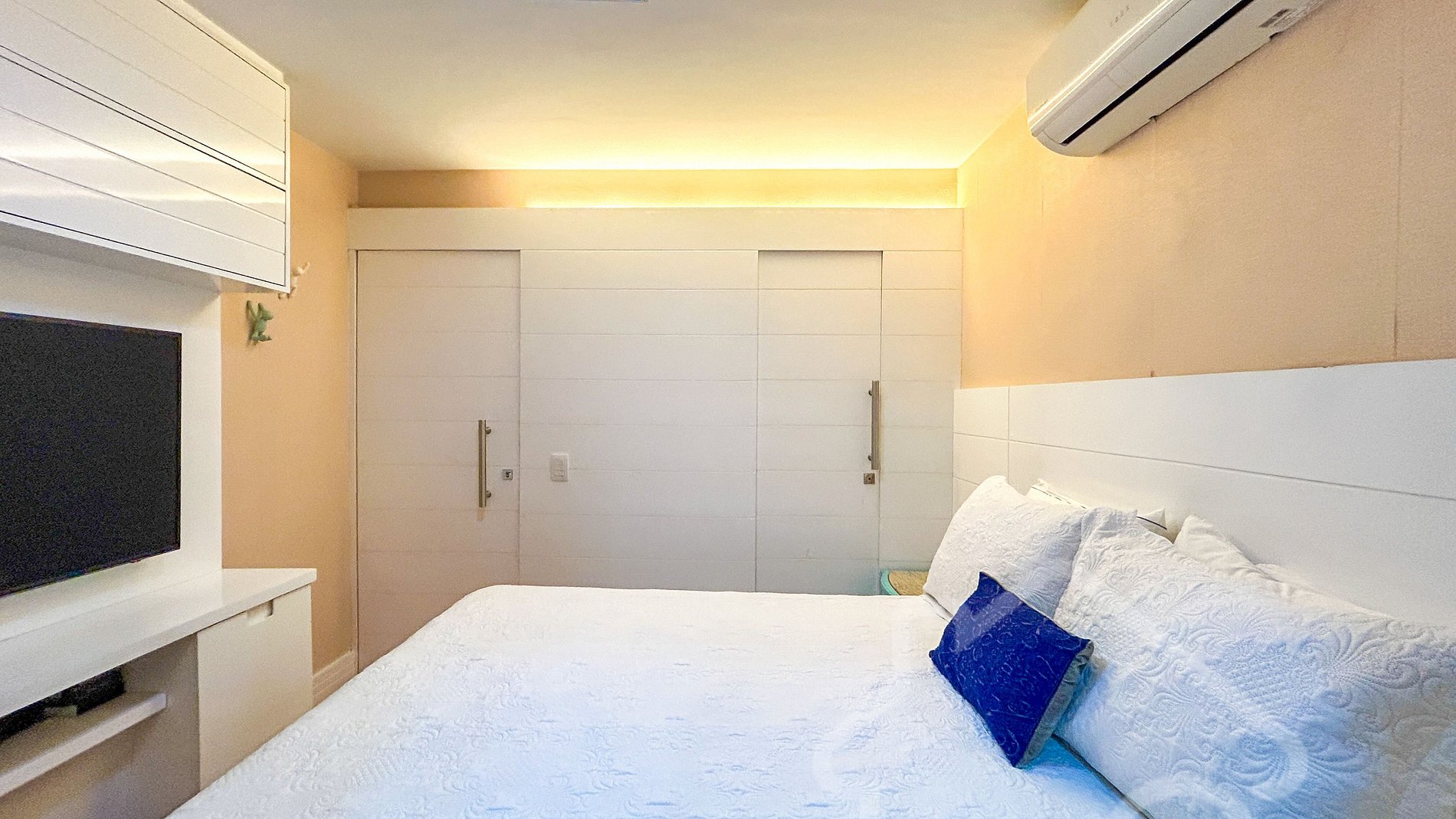 - 3 quartos com cama de casal, ar-condicionado e closet, sendo uma suíte e dois quartos com banheiro compartilhado.