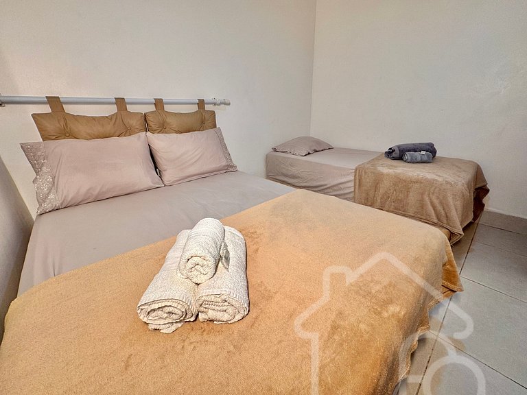 - Quarto 3: Cama de casal + bicama, ventilador de teto, cômoda e espelho de corpo inteiro.