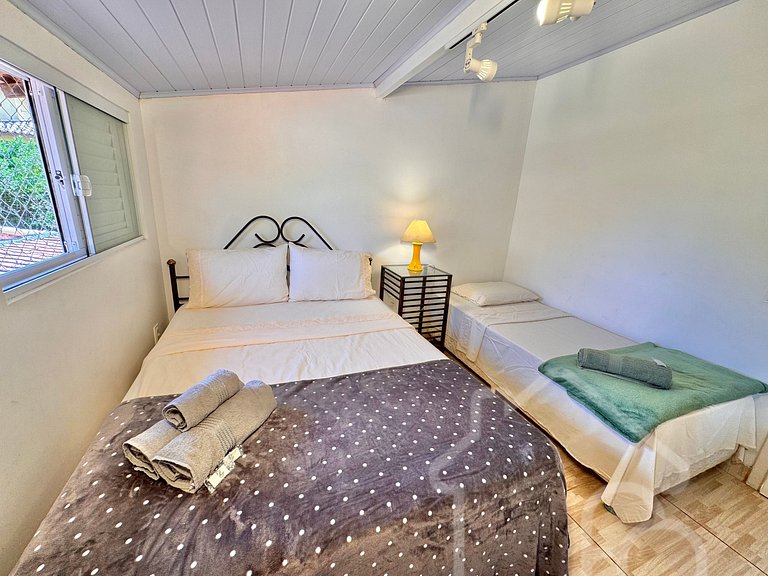 - Suíte 2: Cama de casal + cama de solteiro, ventilador de teto e cômoda.