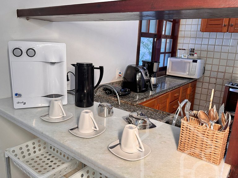 - Cozinha completa com geladeira, fogão, forno, microondas, cafeteira elétrica e todos os utensílios básicos.