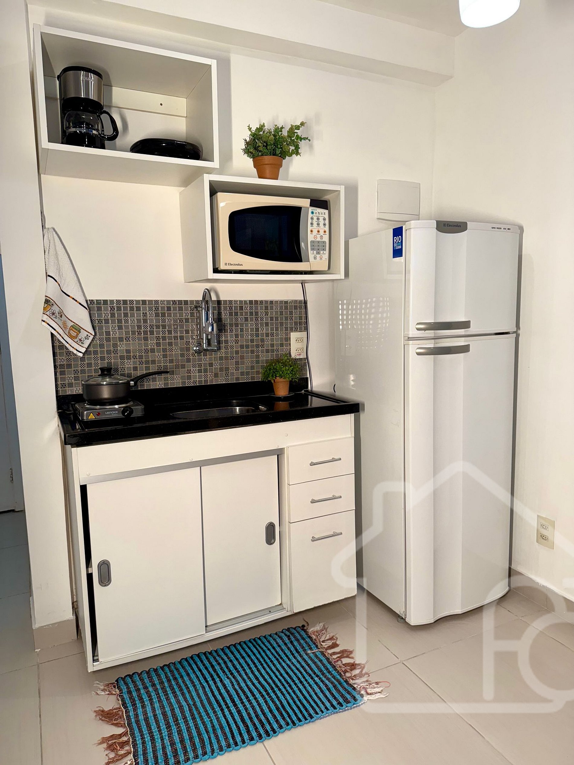 - Cozinha equipada com: fogão elétrico, geladeira, micro-ondas, sanduicheira, cafeteira e utensílios básicos