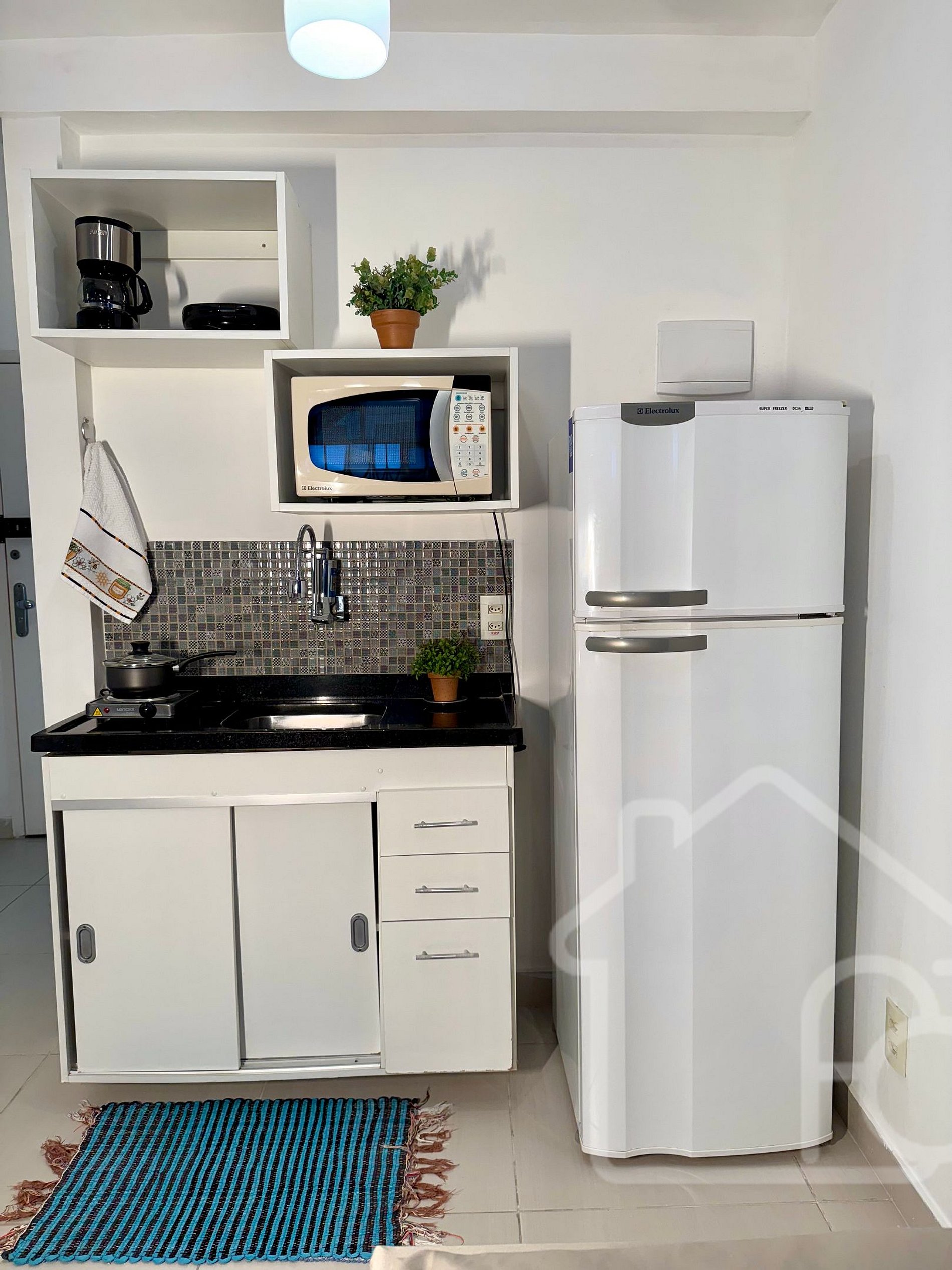 - Cozinha equipada com: fogão elétrico, geladeira, micro-ondas, sanduicheira, cafeteira e utensílios básicos