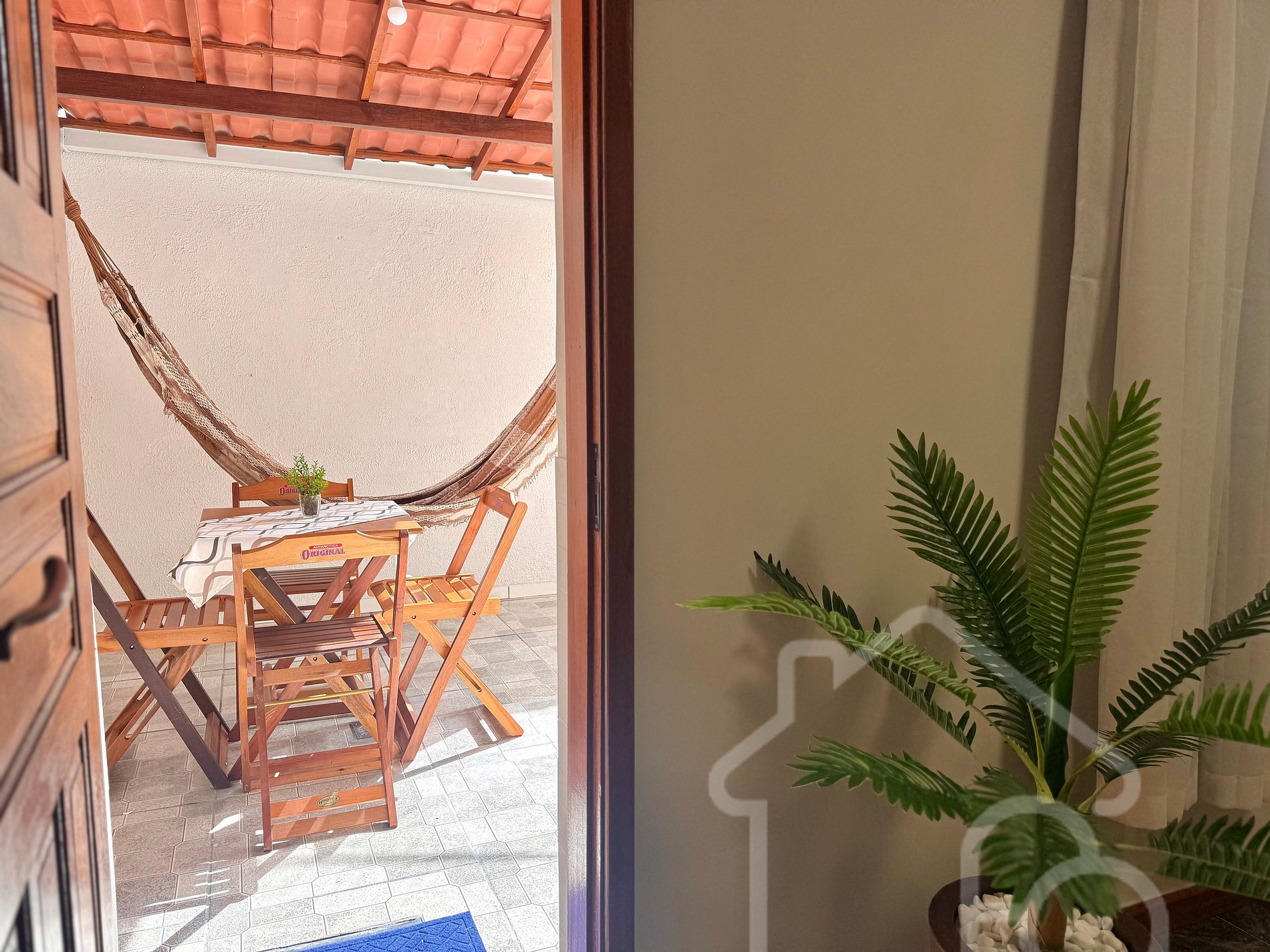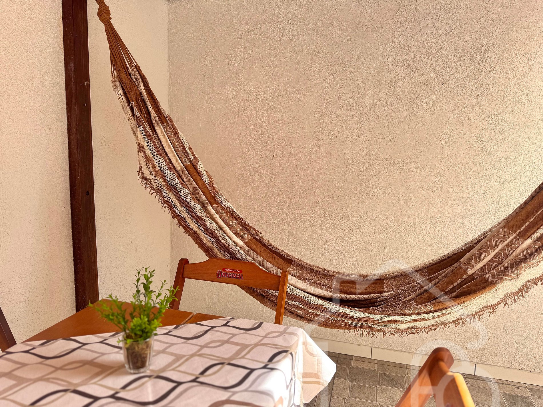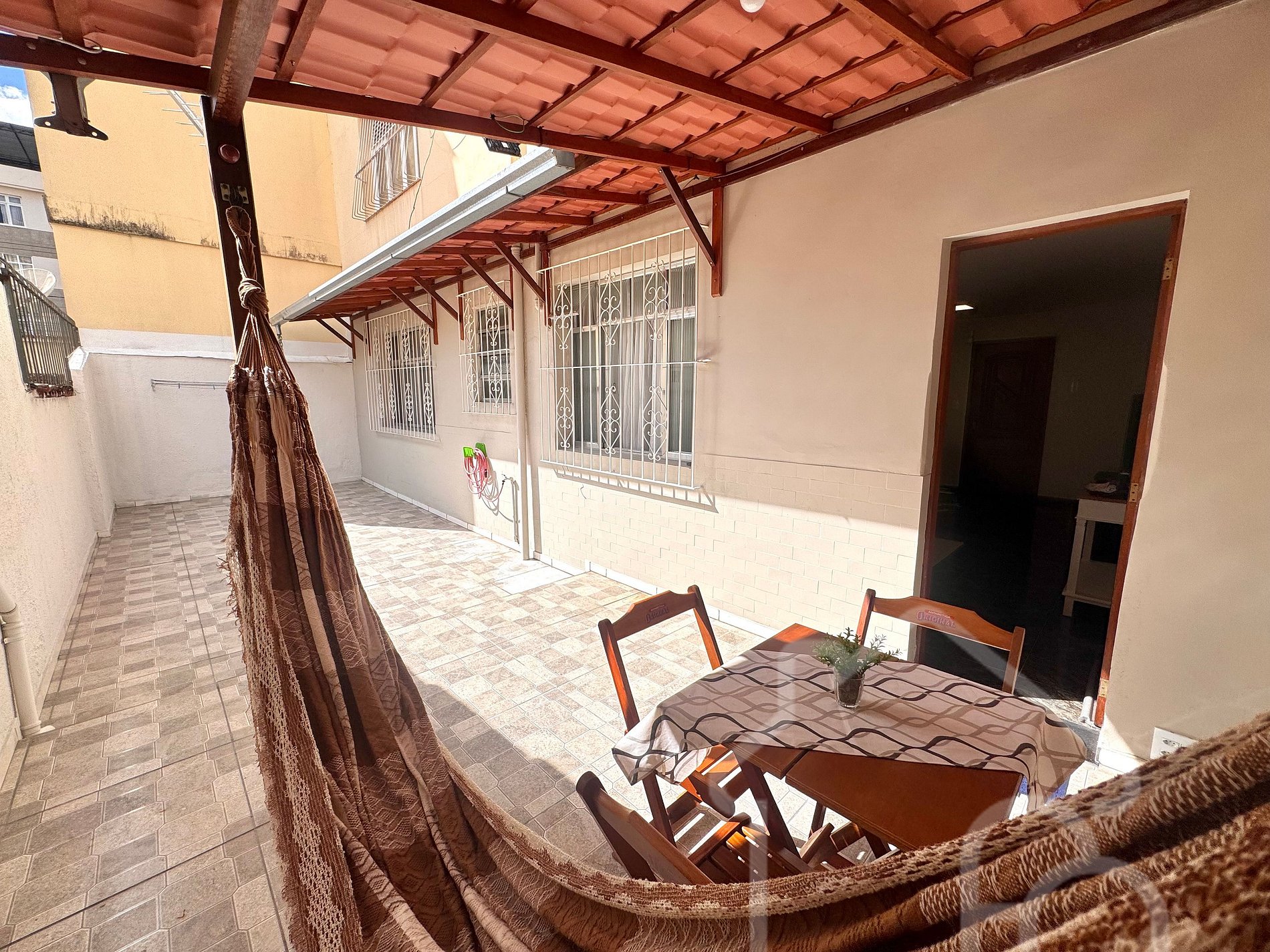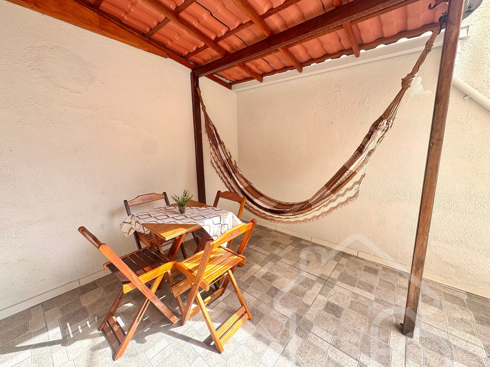 Varanda charmosa com rede e mesa, ideal para relaxar ao ar livre