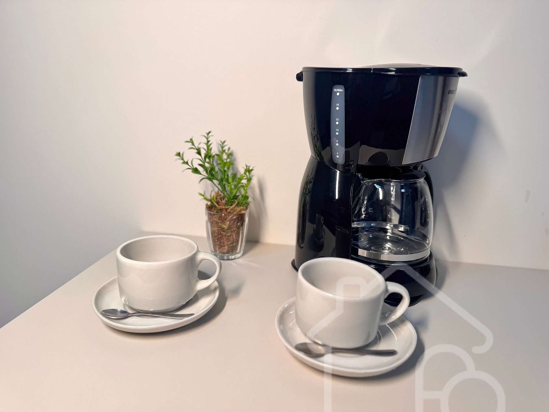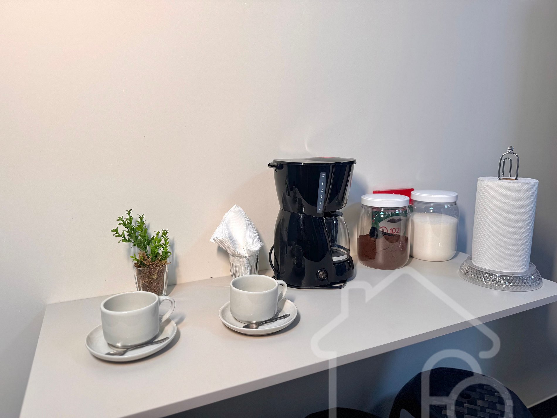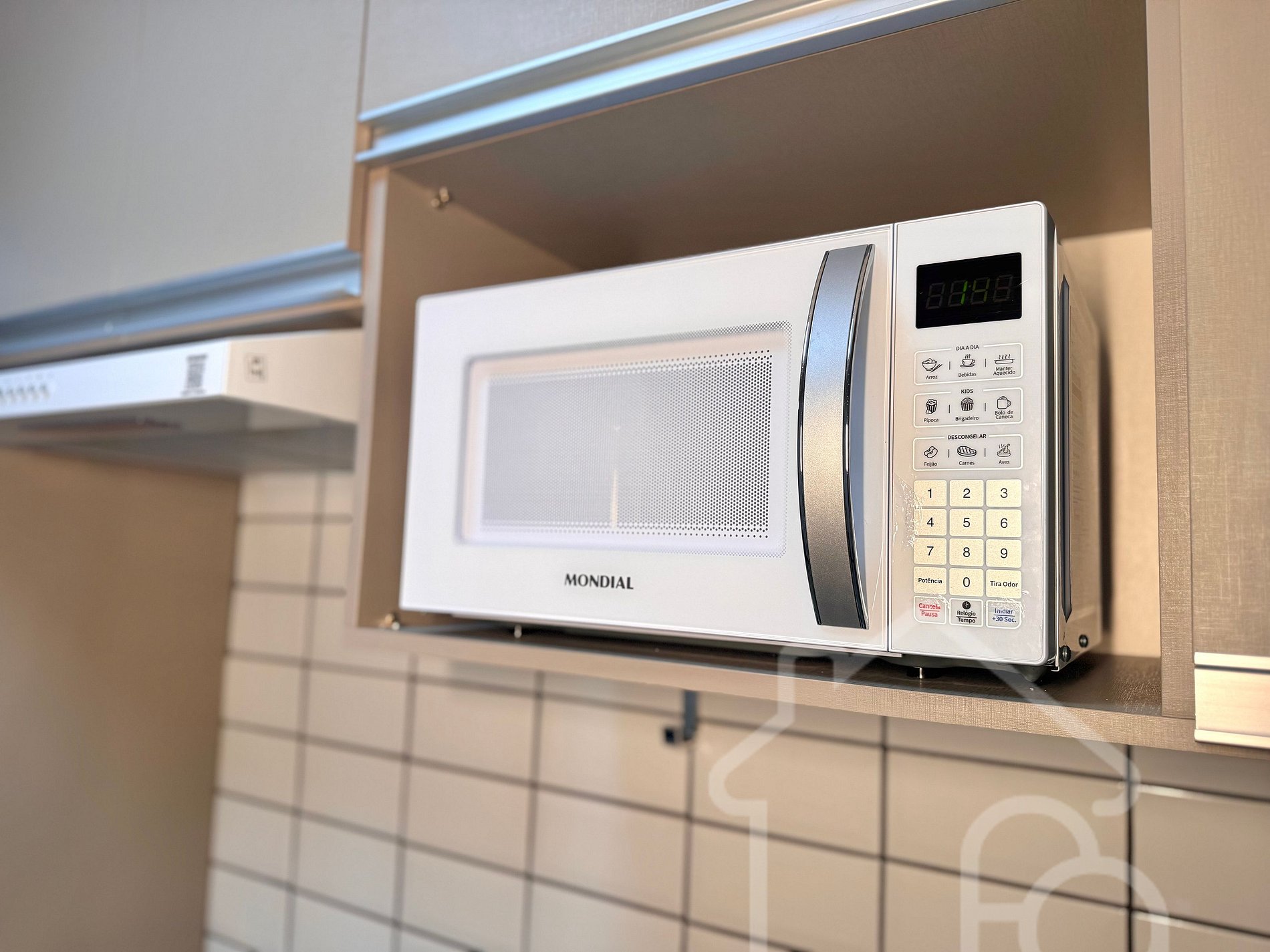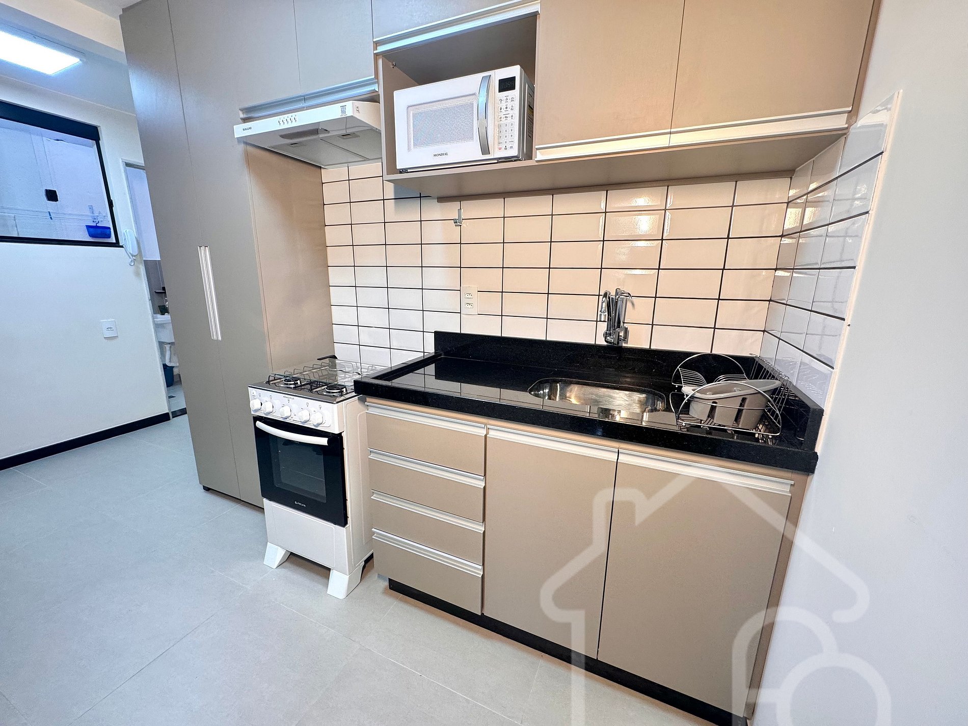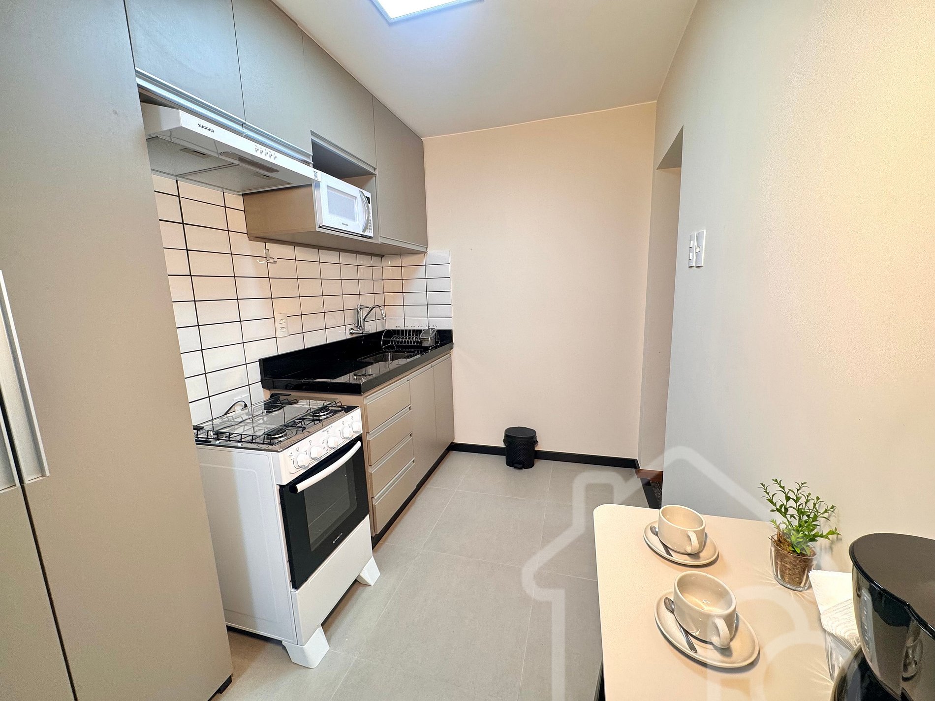 Cozinha equipada com fogão, micro-ondas, cafeteira e utensílios para preparar suas refeições