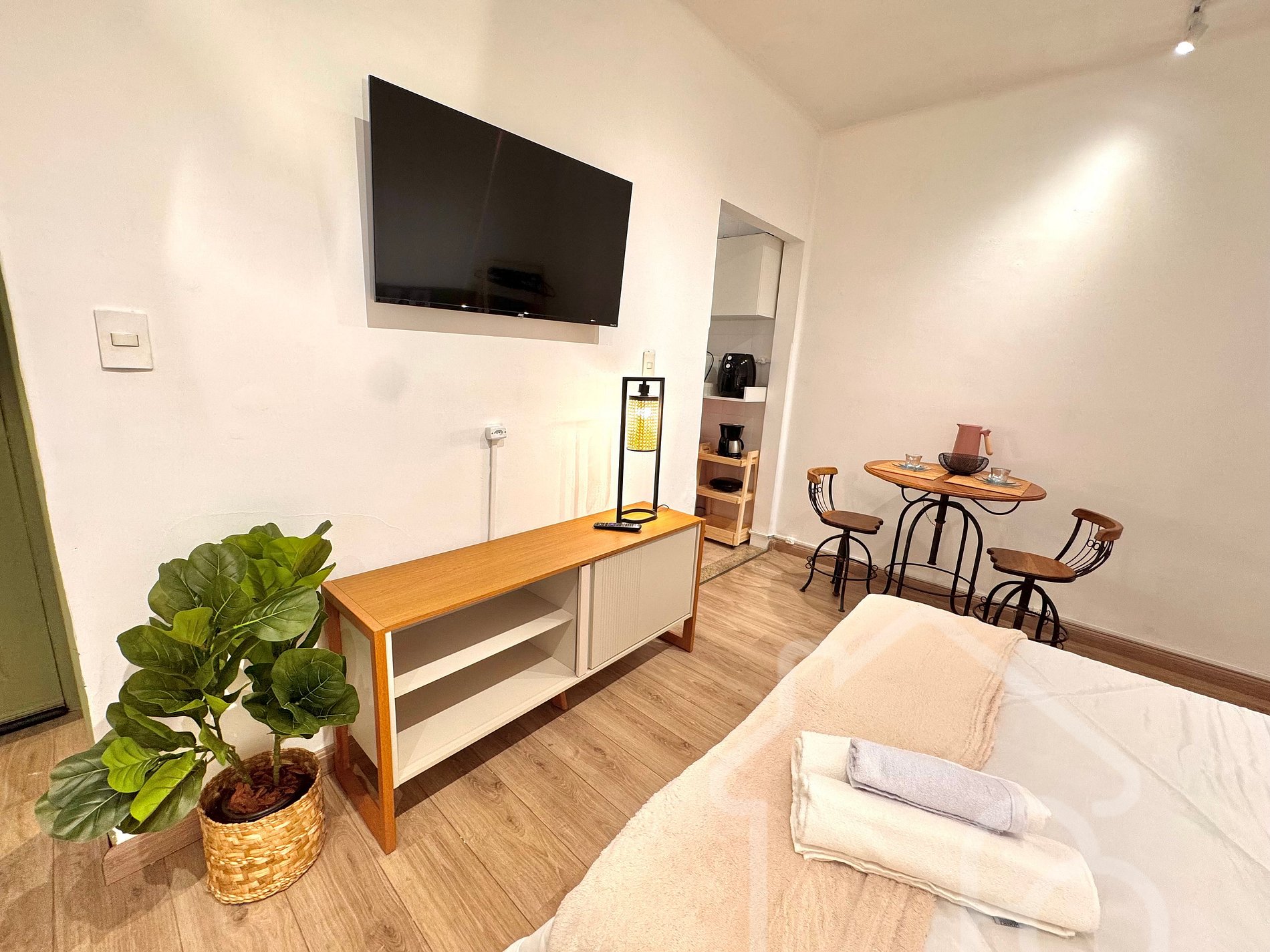 - Cozinha com frigobar, micro-ondas, airfryer, cafeteira, sanduicheira e utensílios básicos