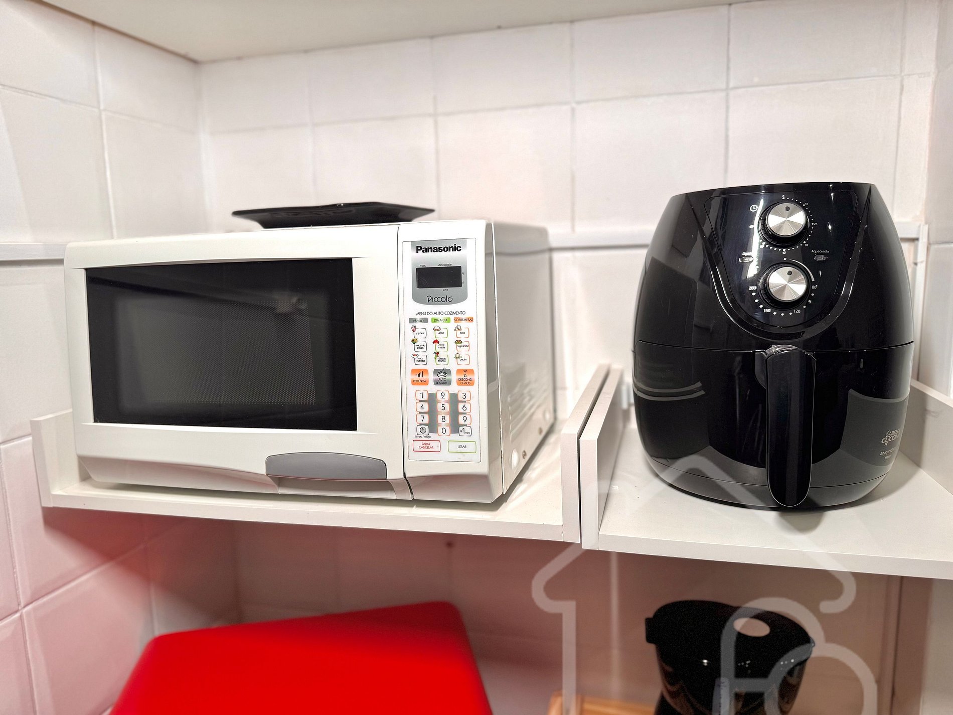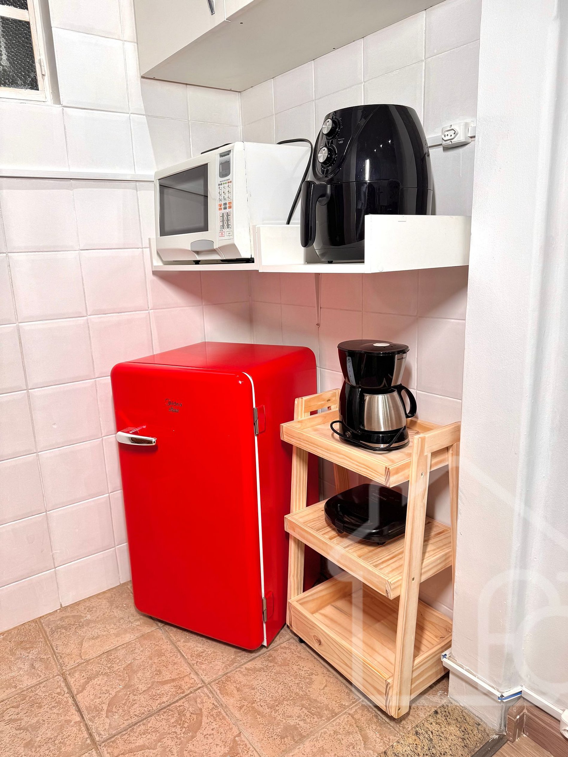 - Cozinha com frigobar, micro-ondas, airfryer, cafeteira, sanduicheira e utensílios básicos