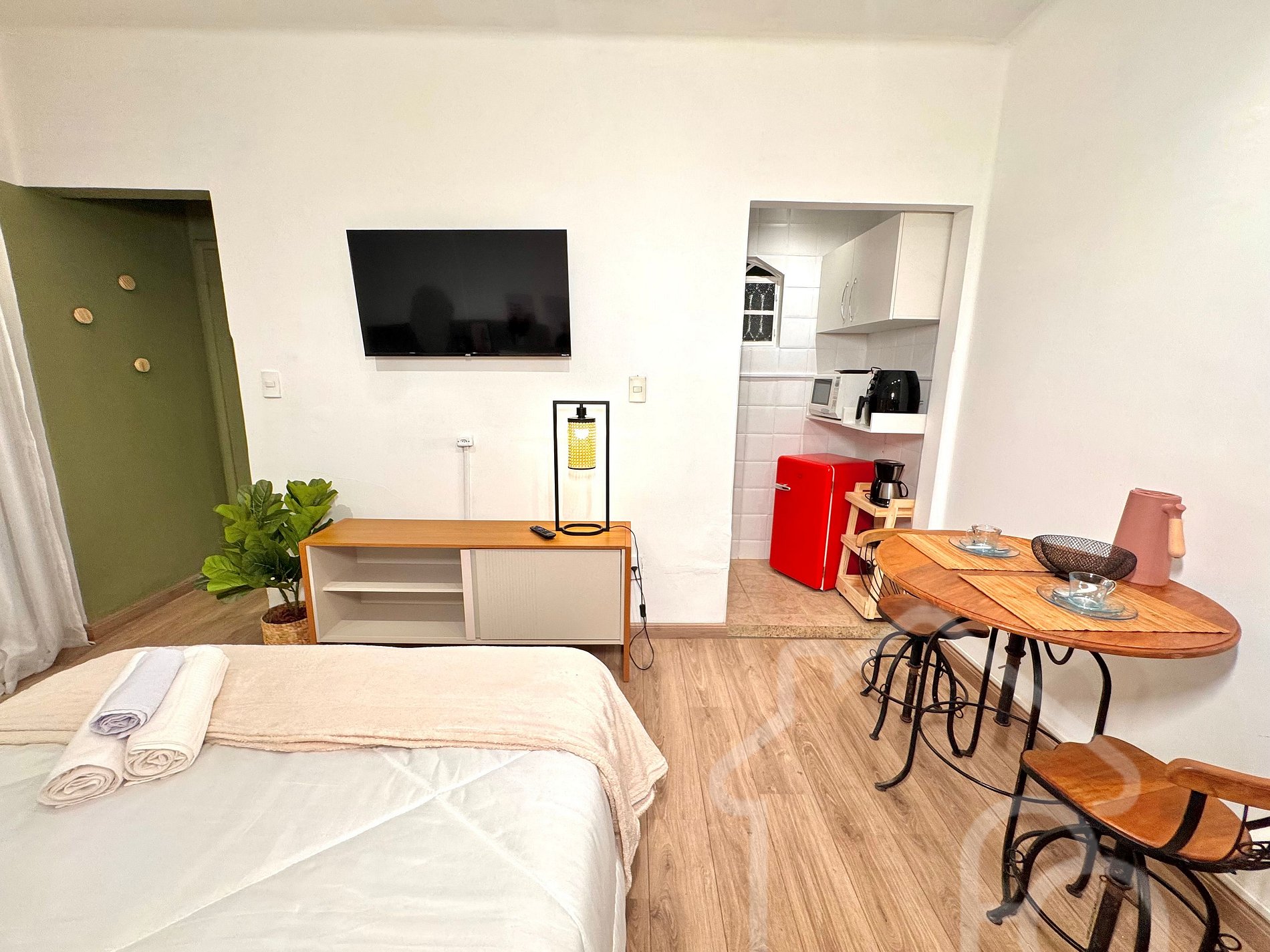 Estúdio prático e completo na Rua Ernesto Brásilio, uma das melhores do centro de Nova Friburgo. Super bem localizado, perto de comércios, farmácias e restaurantes. Ambiente decorado com bom gosto, ideal para quem busca praticidade com conforto. Conta com cozinha equipada, cama confortável, espaço para refeições e trabalho, Wi-Fi, TV e banheiro moderno. Perfeito para curtas ou longas estadias!