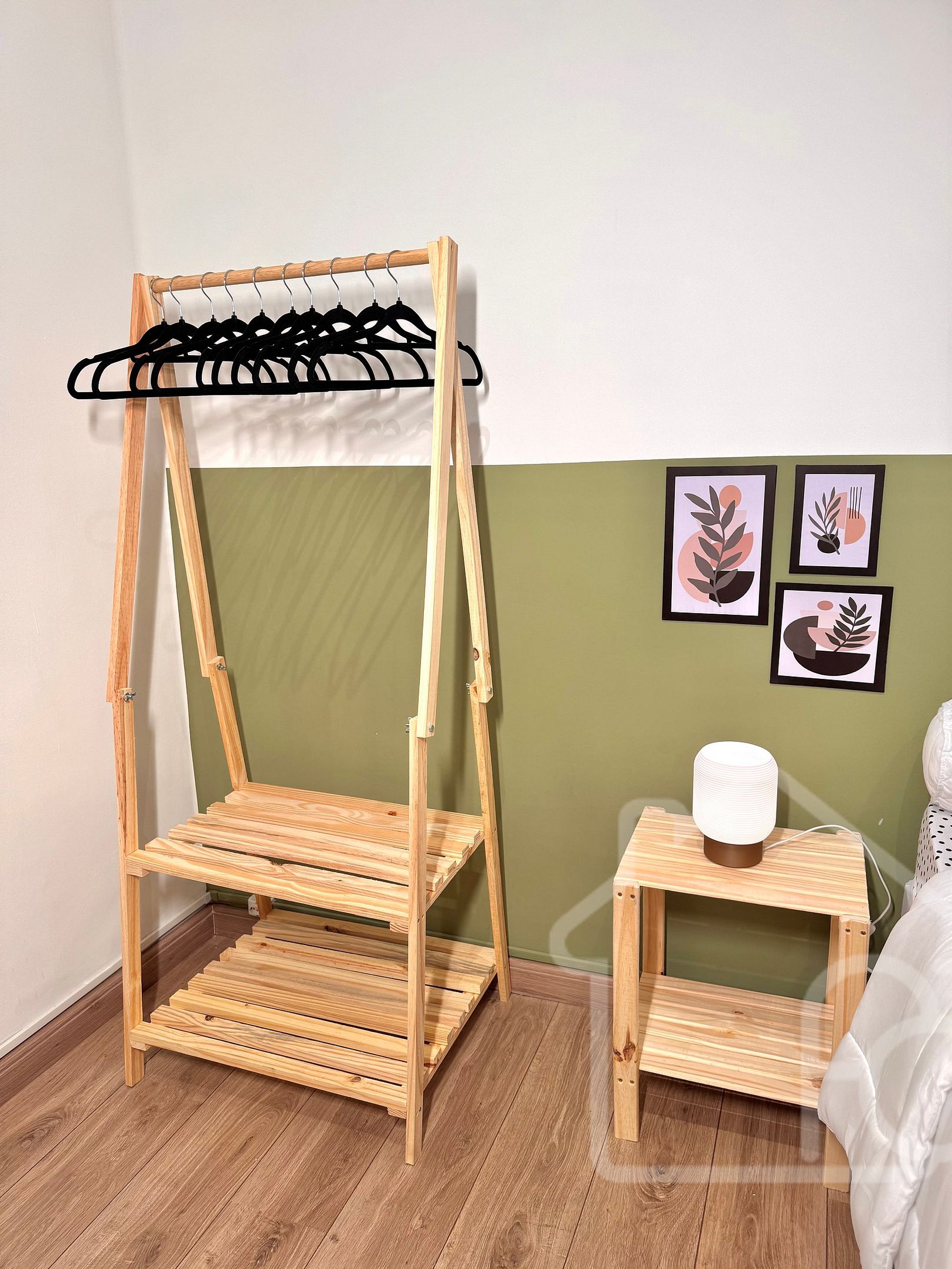 - Araras com cabides para organizar suas roupas e ferro de passar