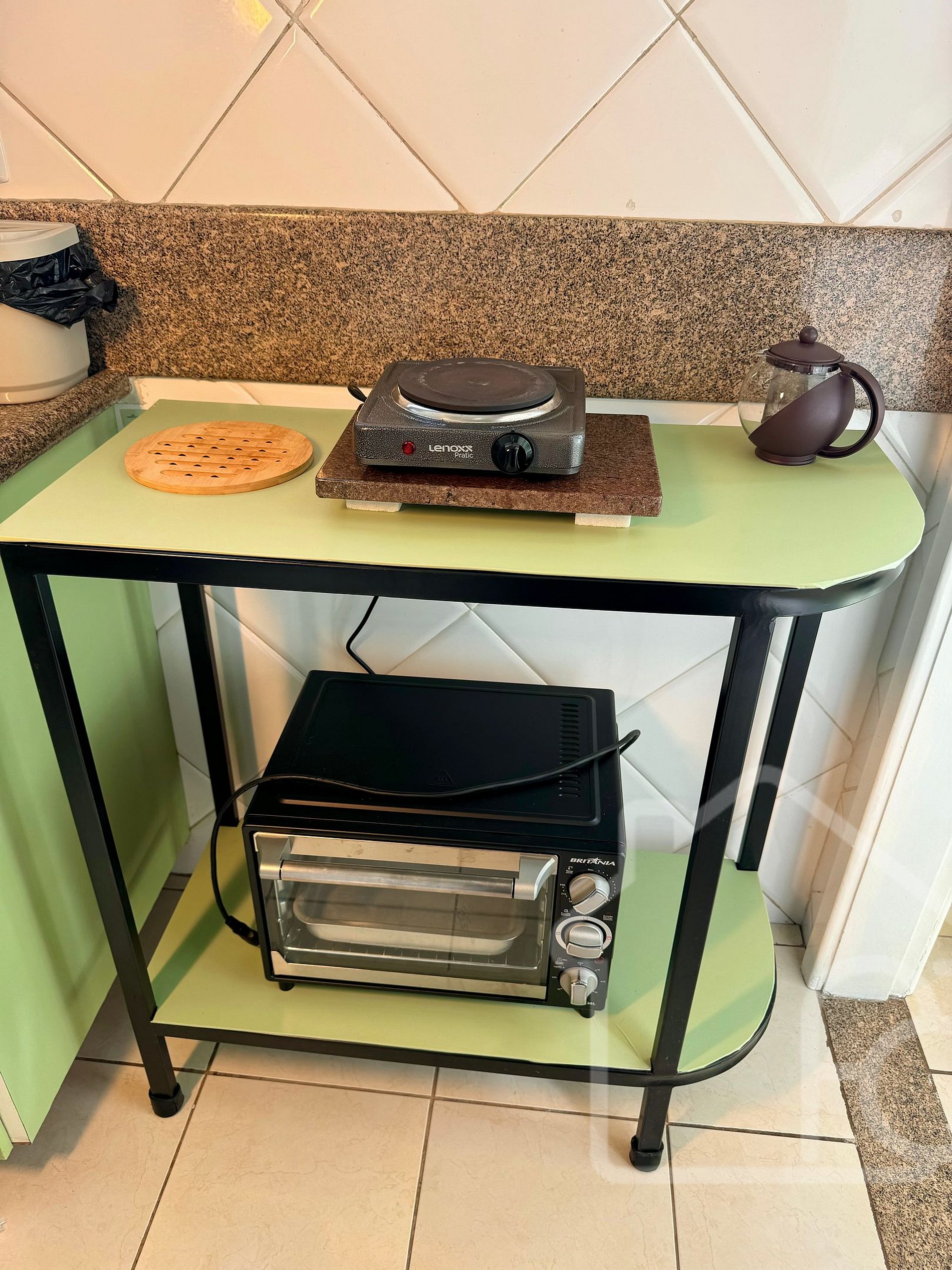 - O fogão é elétrico e possui uma boca, ideal para preparar refeições rápidas e simples durante a estadia.