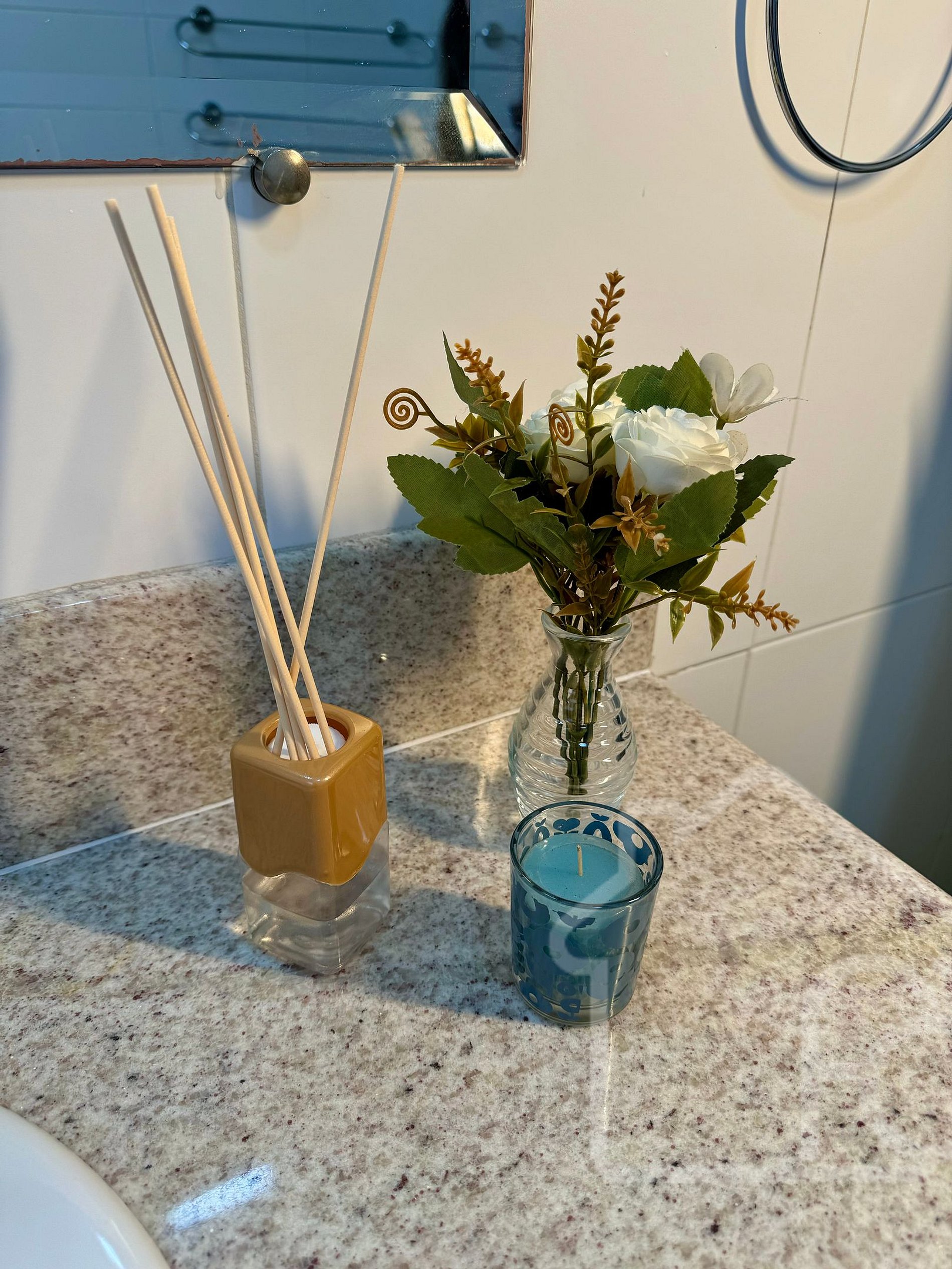 - Banheiro moderno com chuveiro quente, secador de cabelo e kit de toalhas.